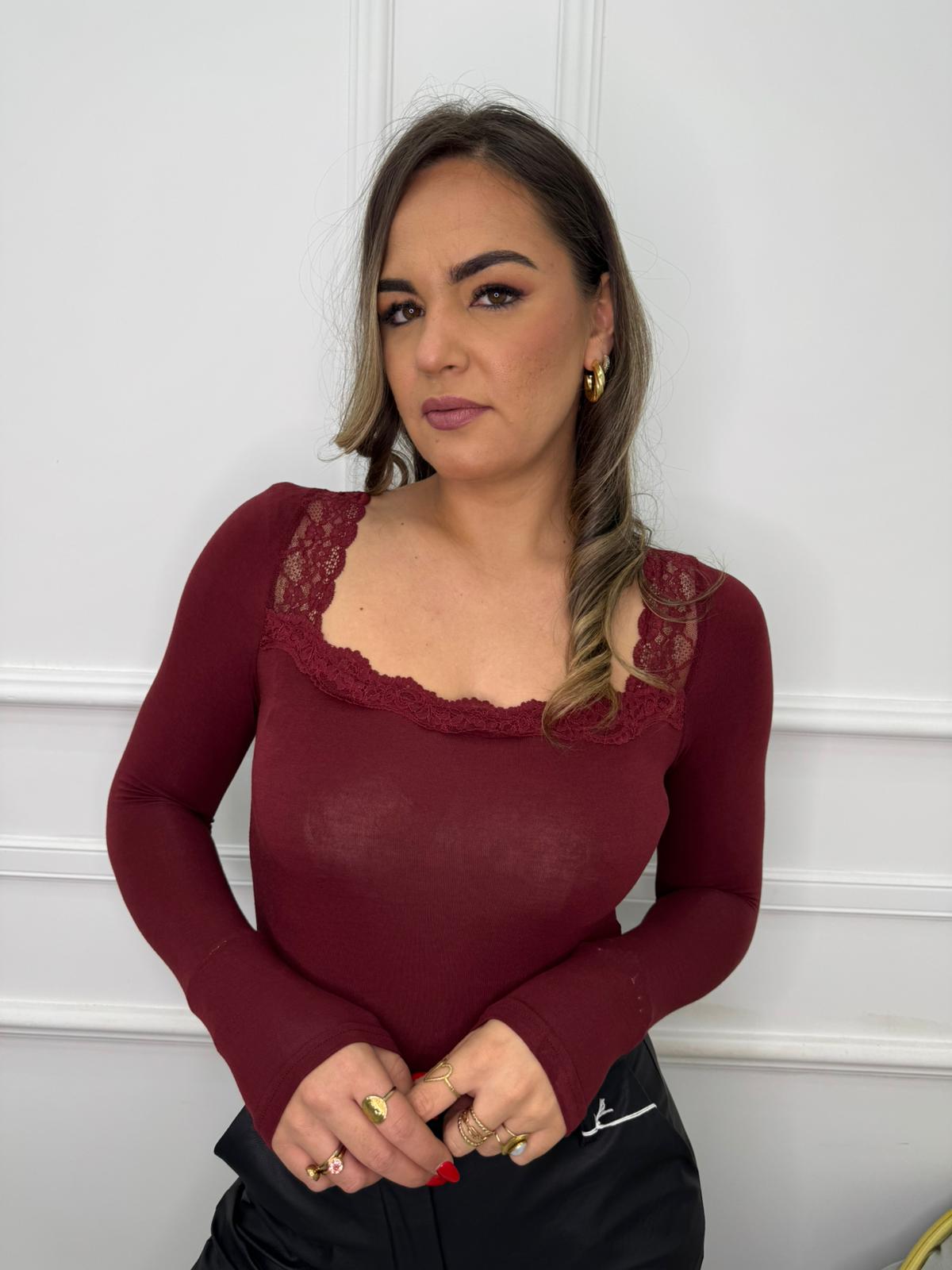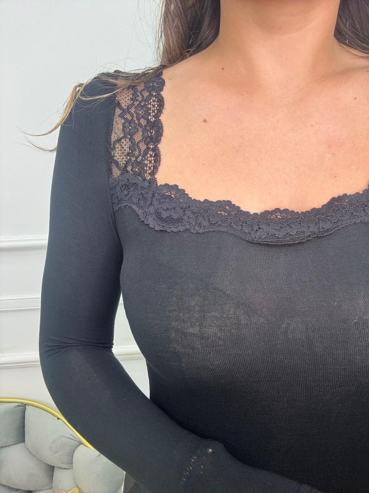 Body in simil cashmere con scollo rotondo e merletto