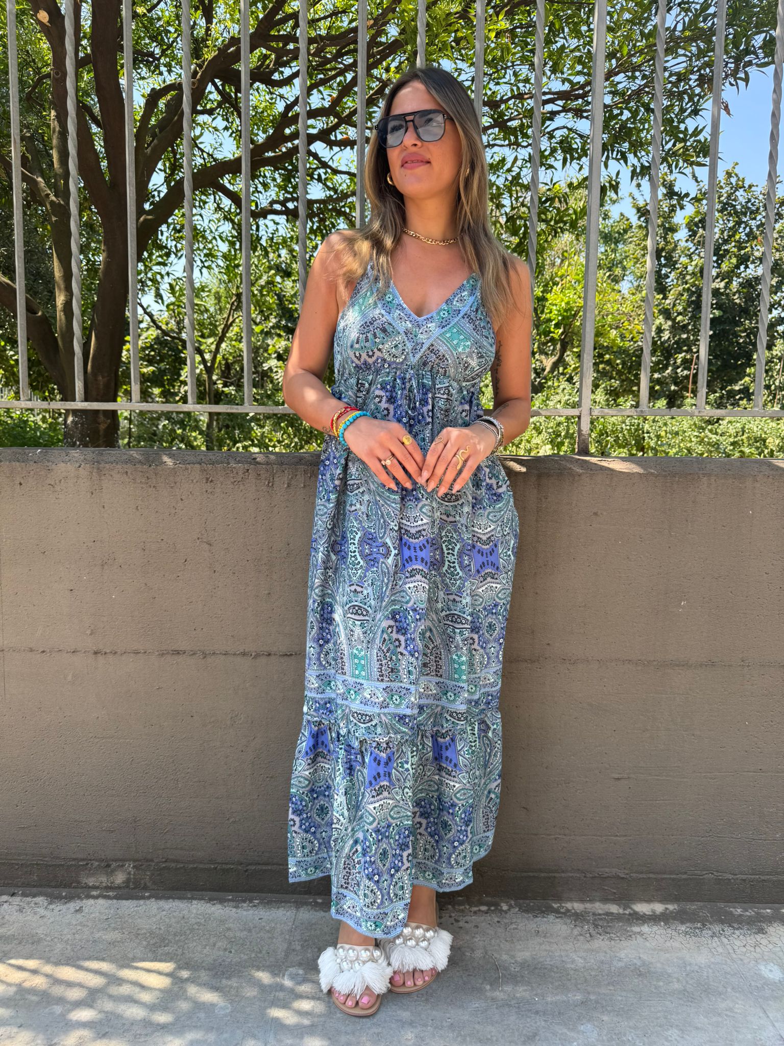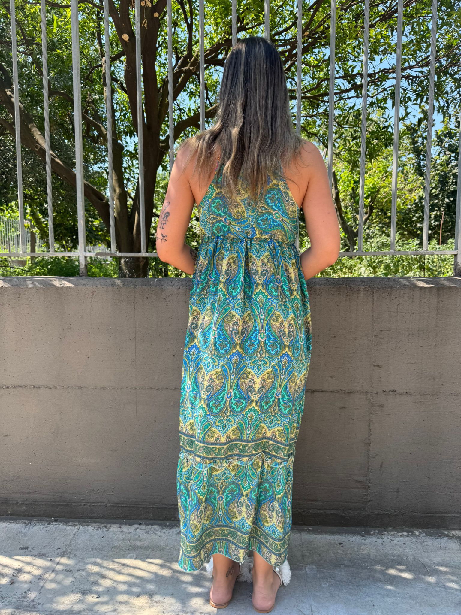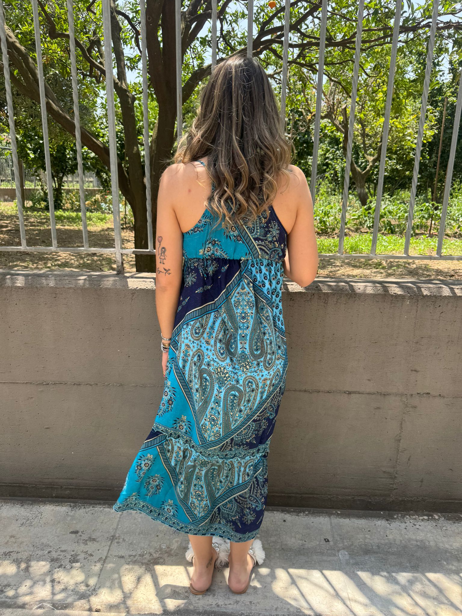 Vestito lungo fantasia Positano con balza sotto e laccetti