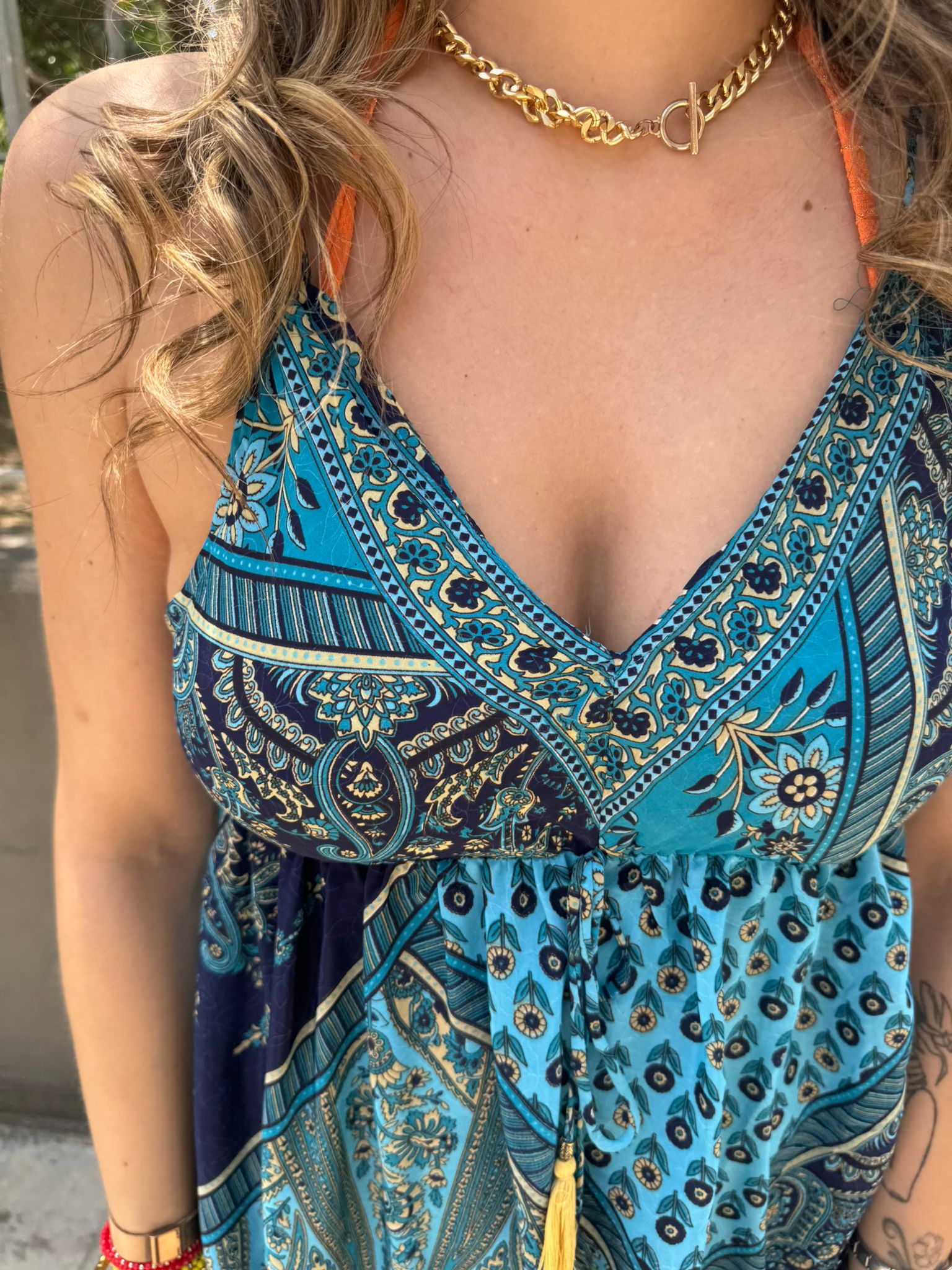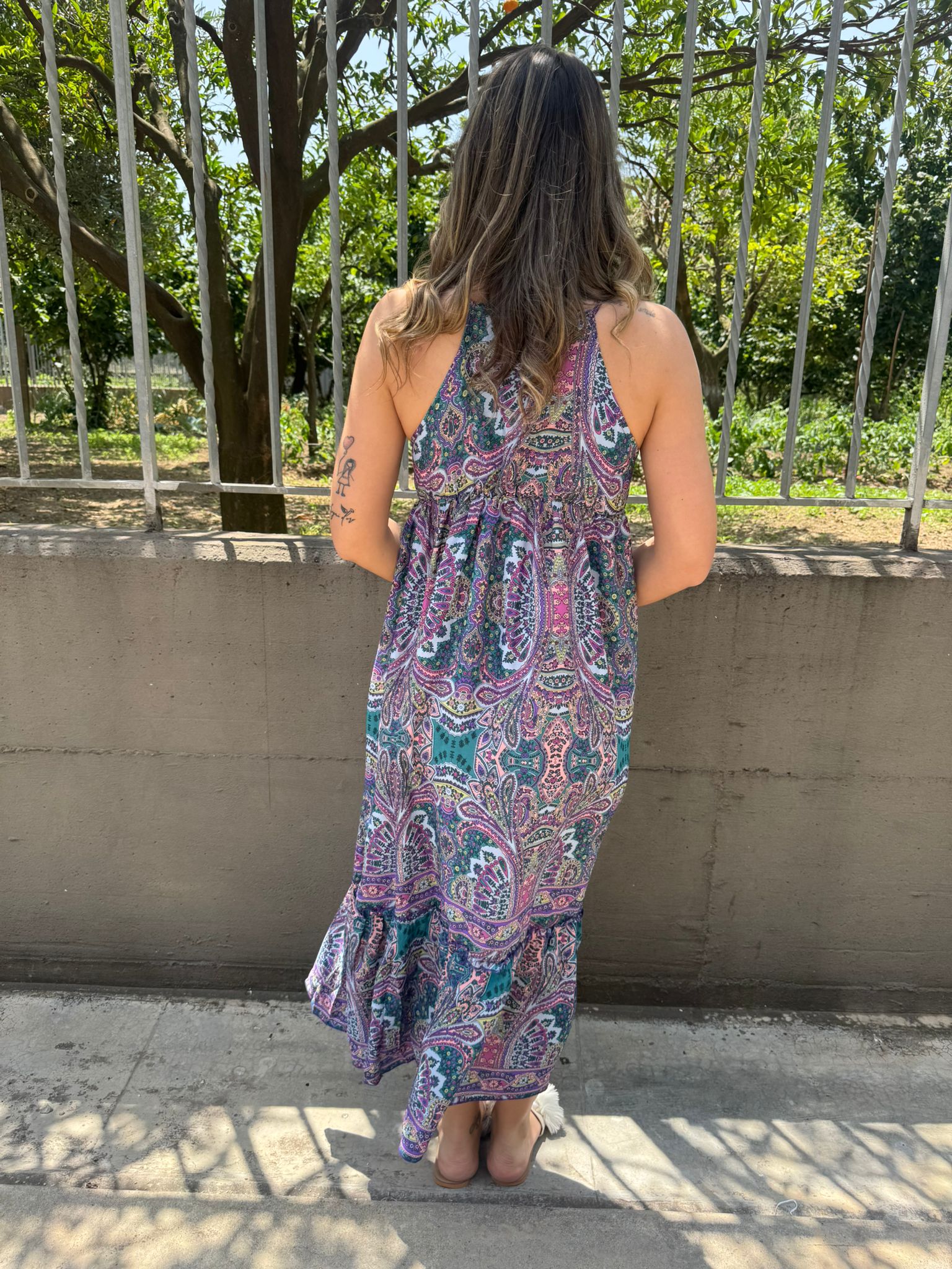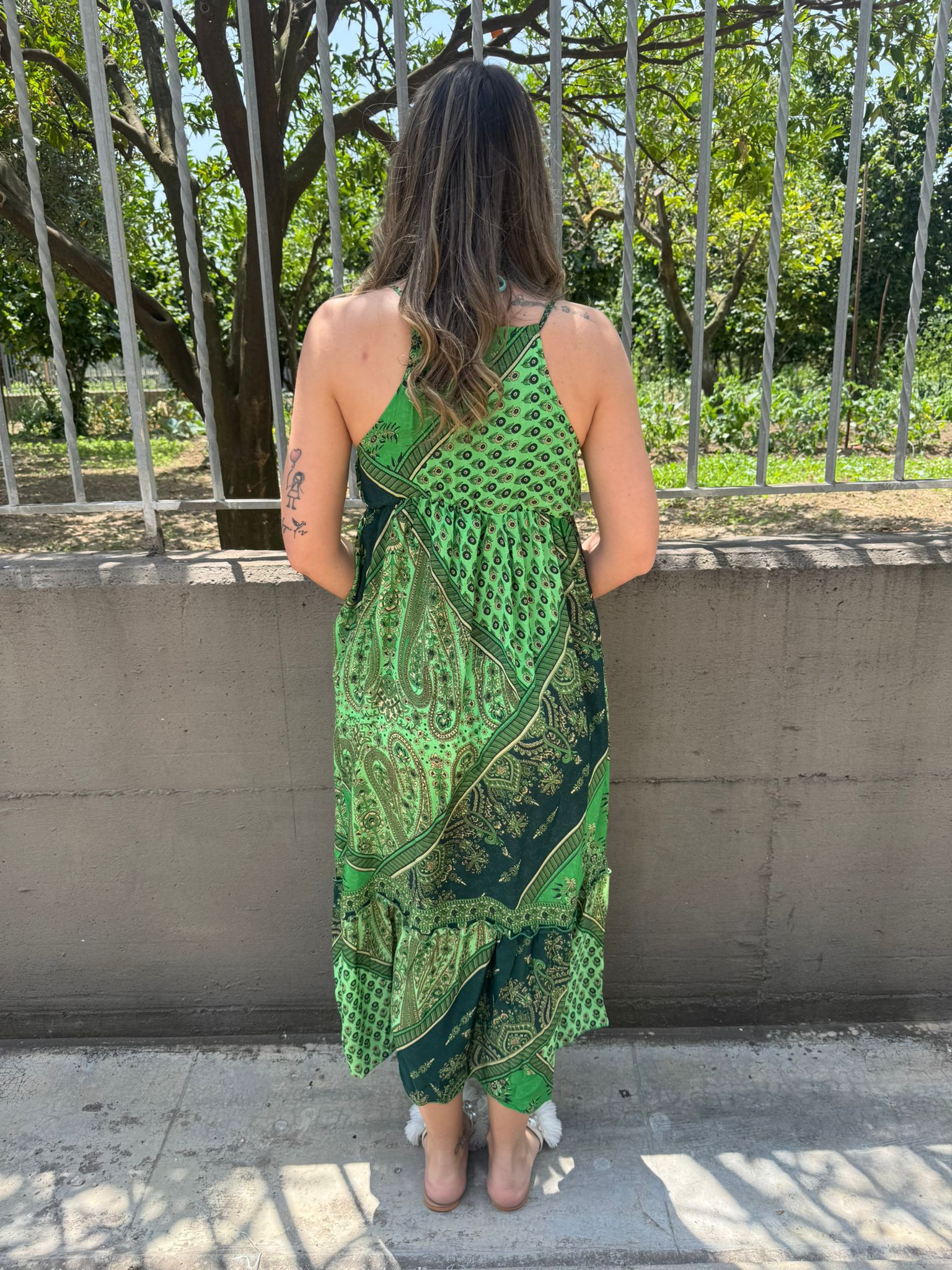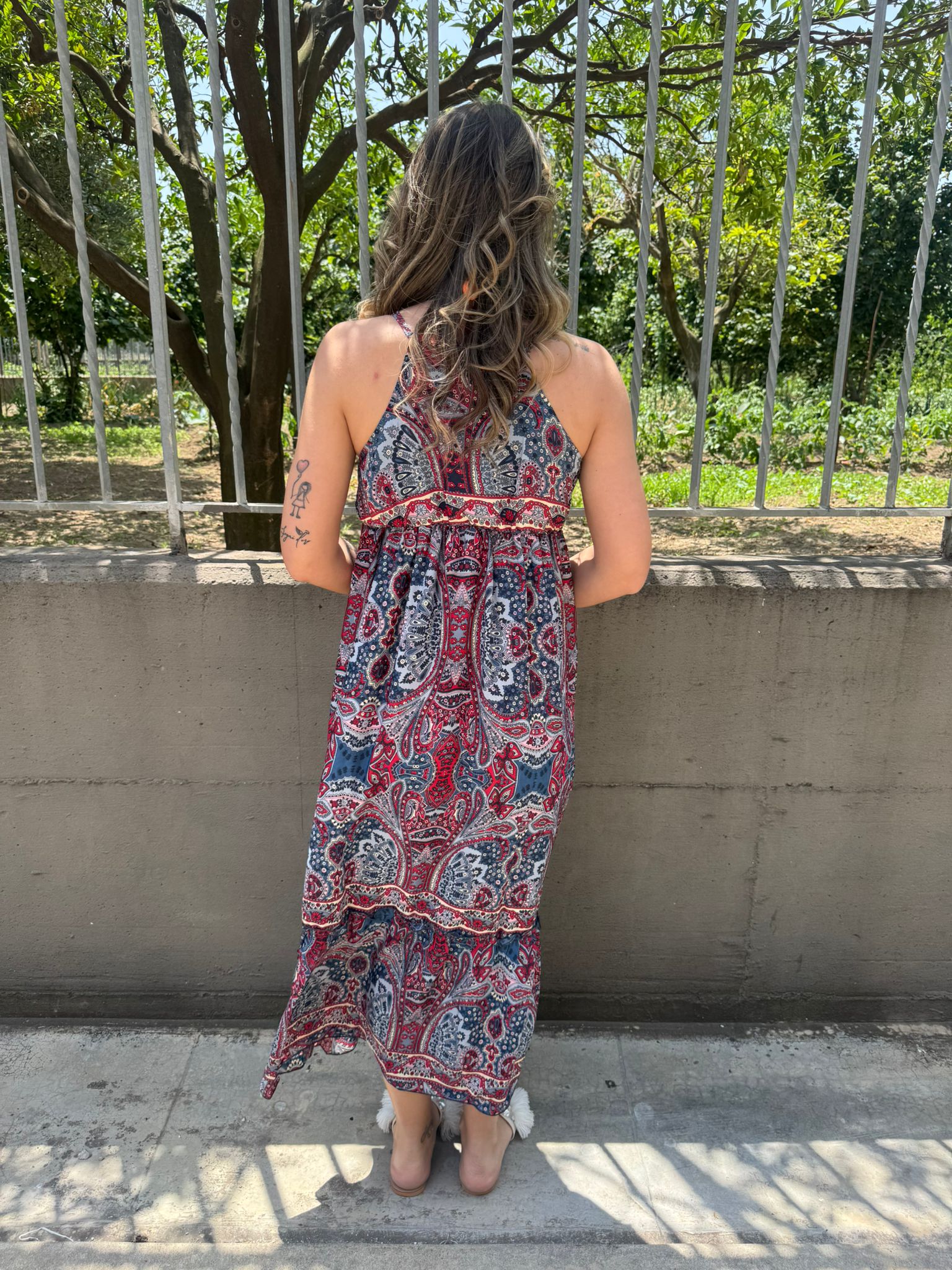 Vestito lungo fantasia Positano con balza sotto e laccetti