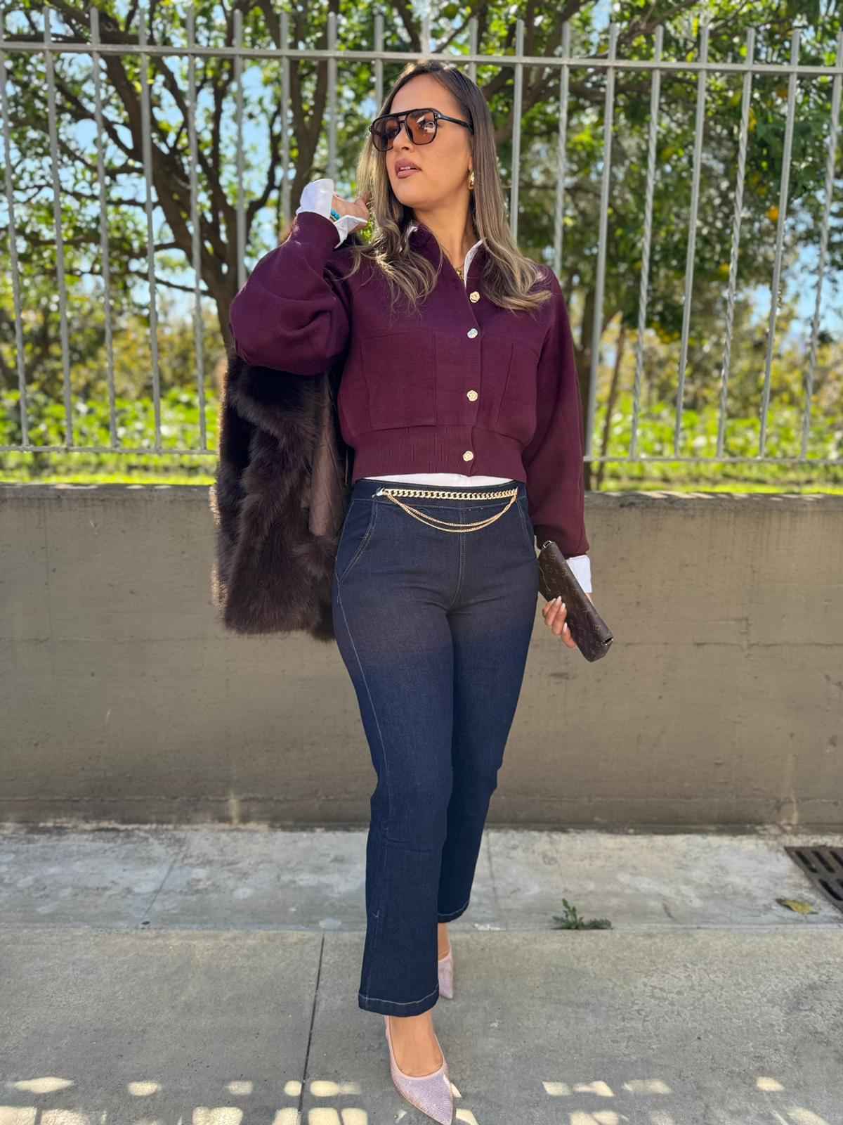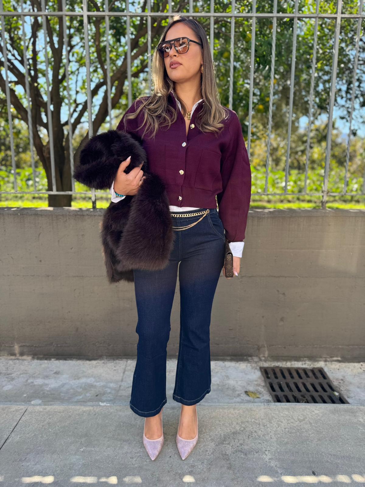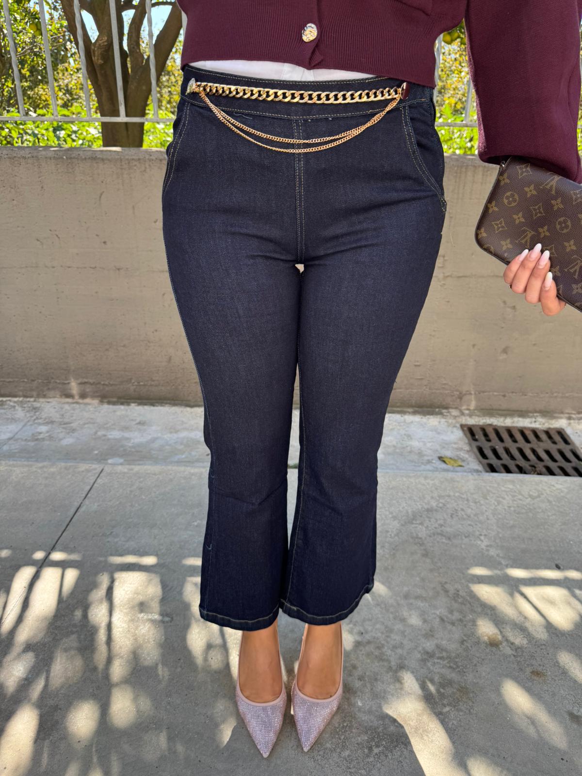 Jeans lavaggio scuro a zampetta con catena oro