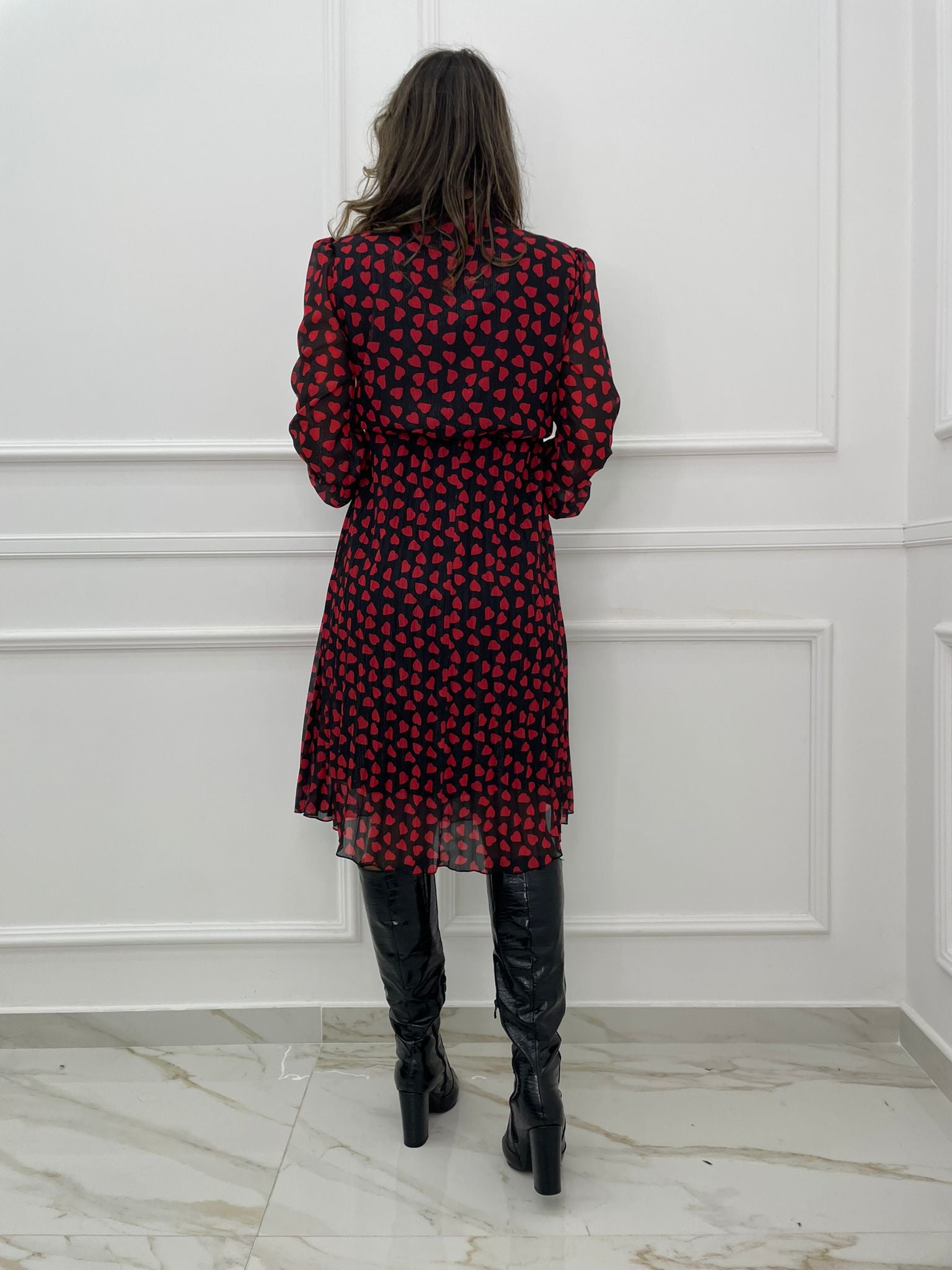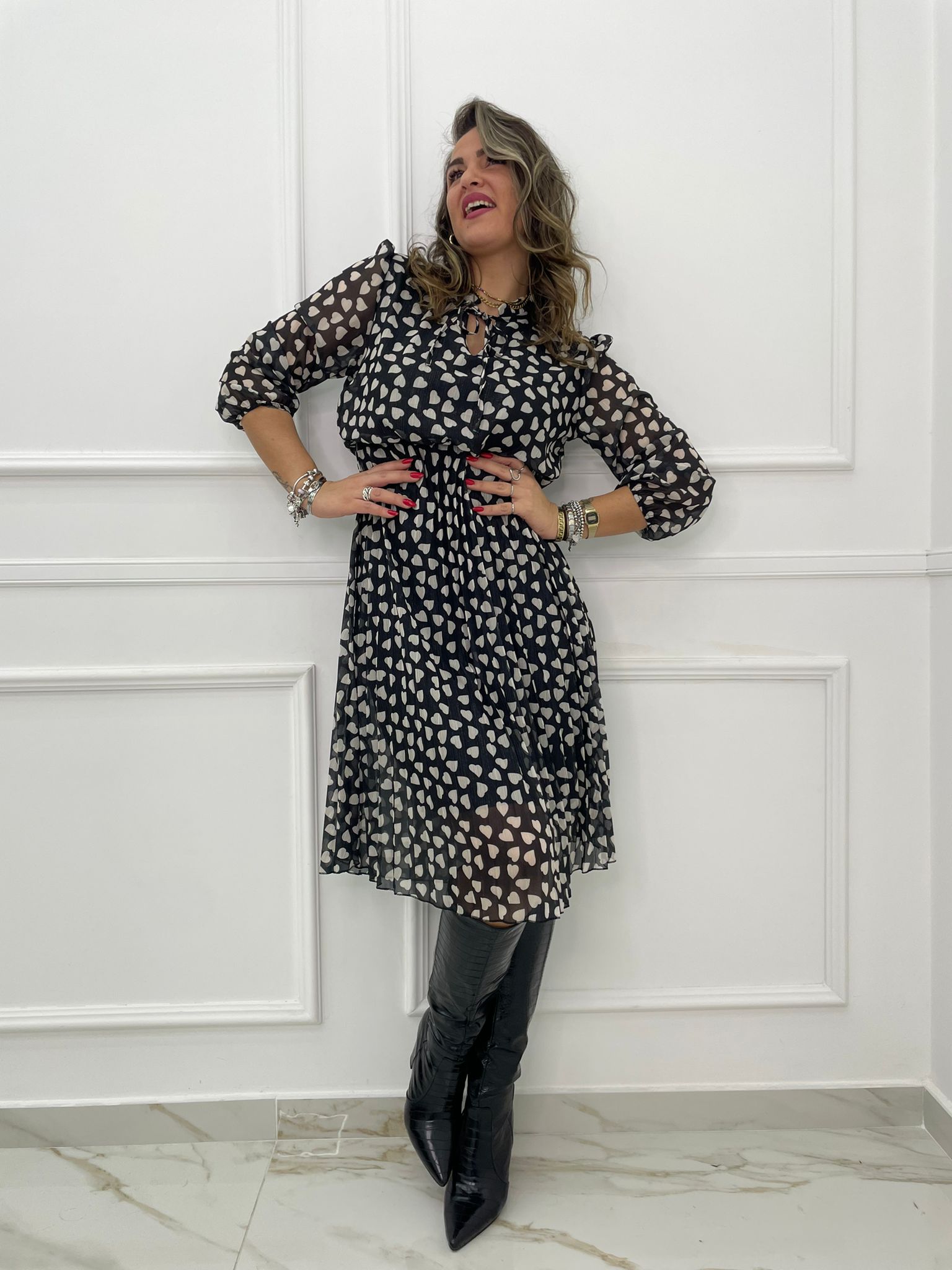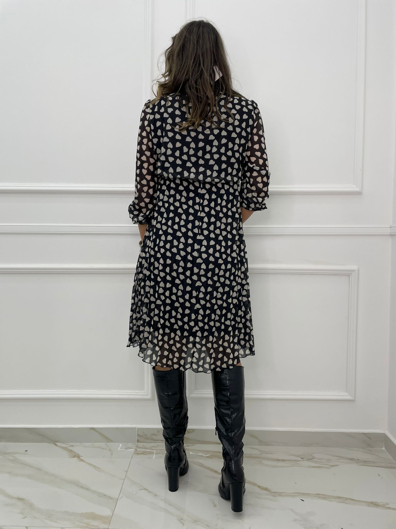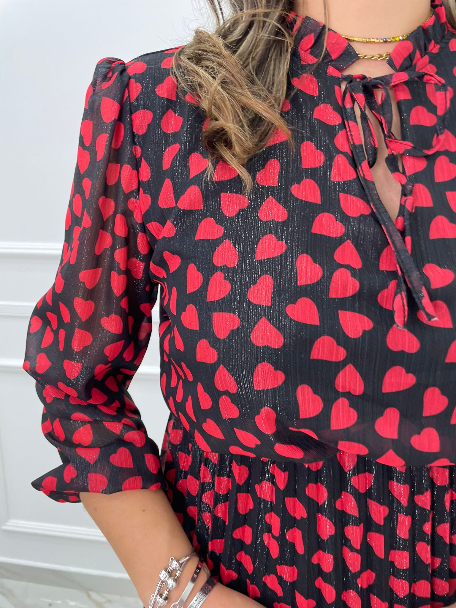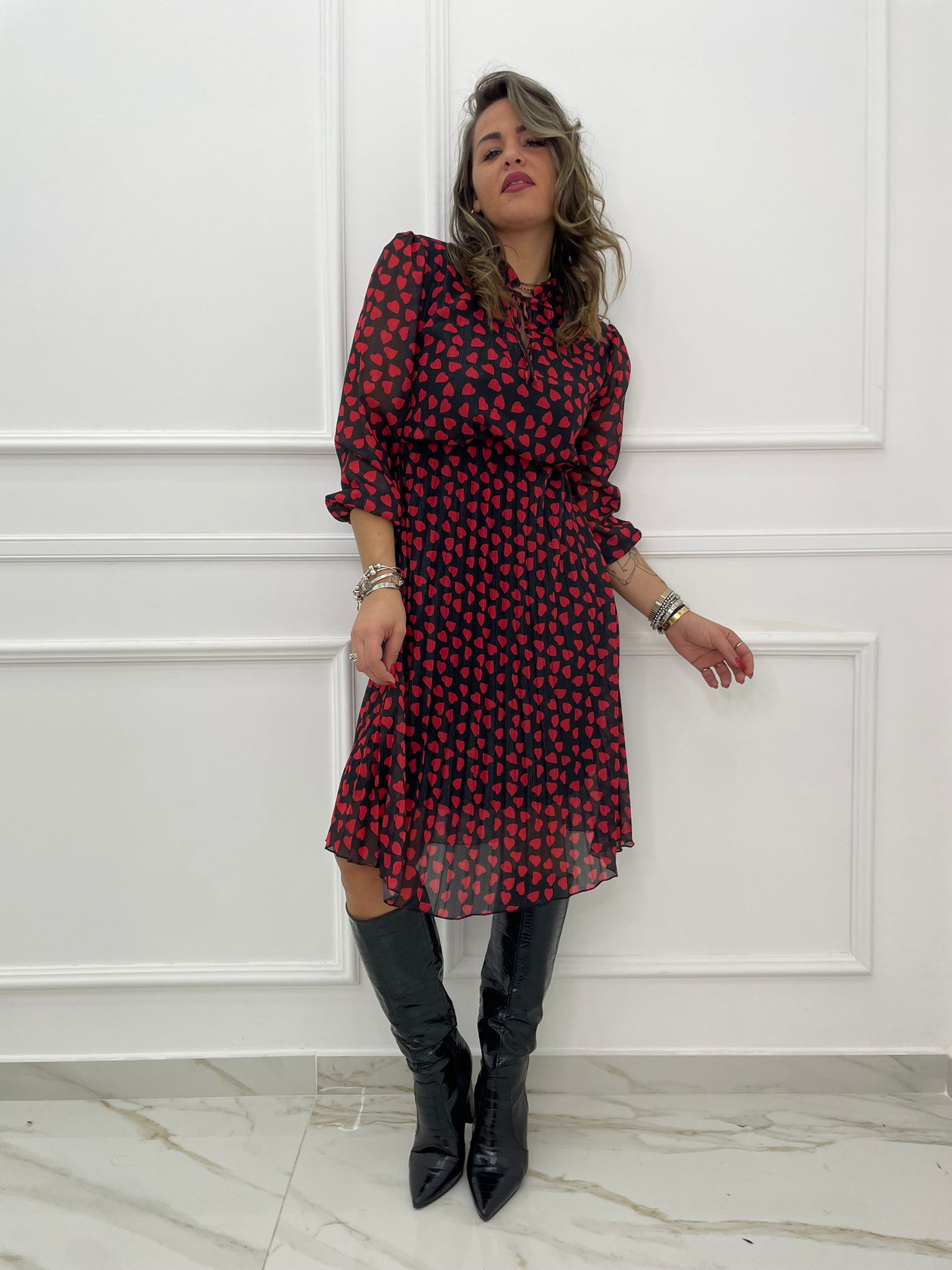 Vestito lungo con cuori e parte inferiore plissettata