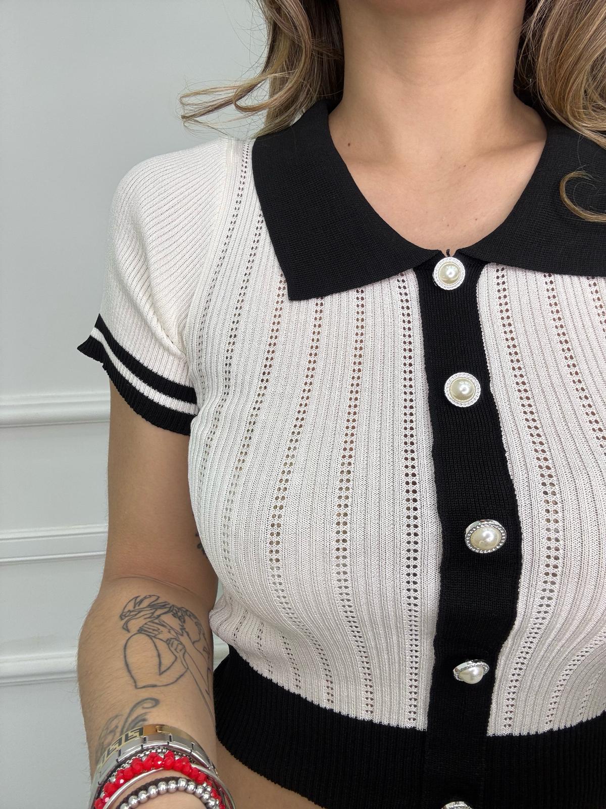 Maglia in filo mezza manica traforata con finti bottoni