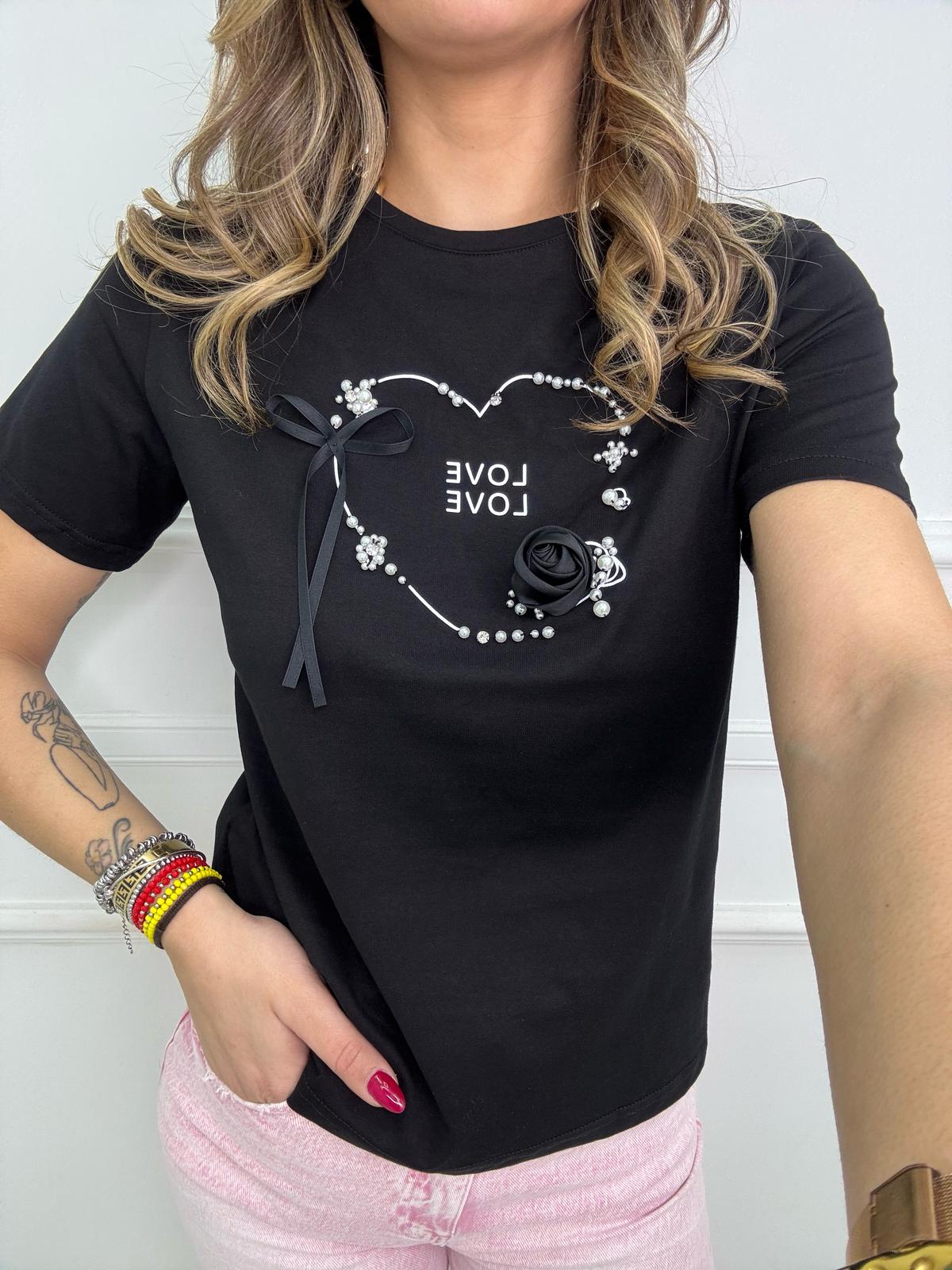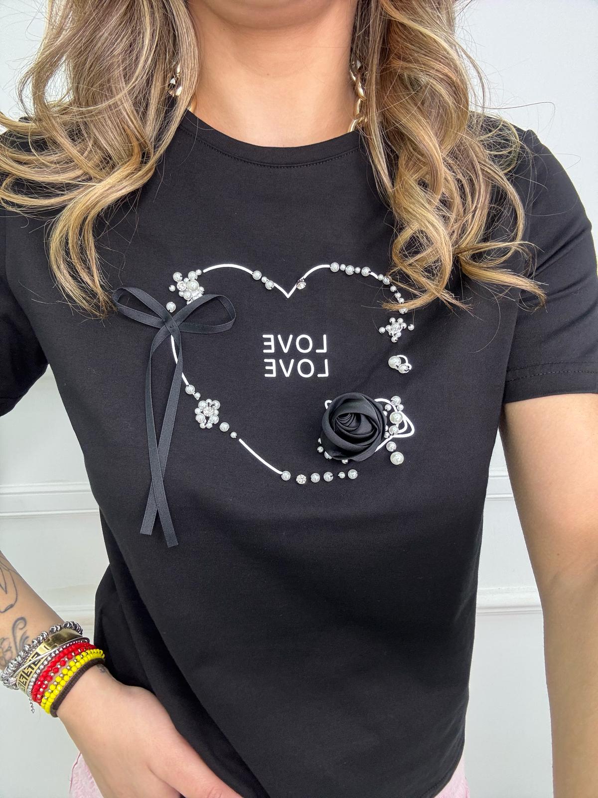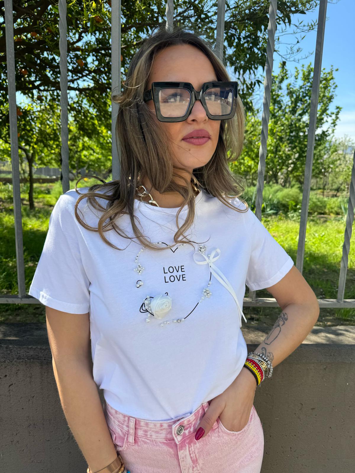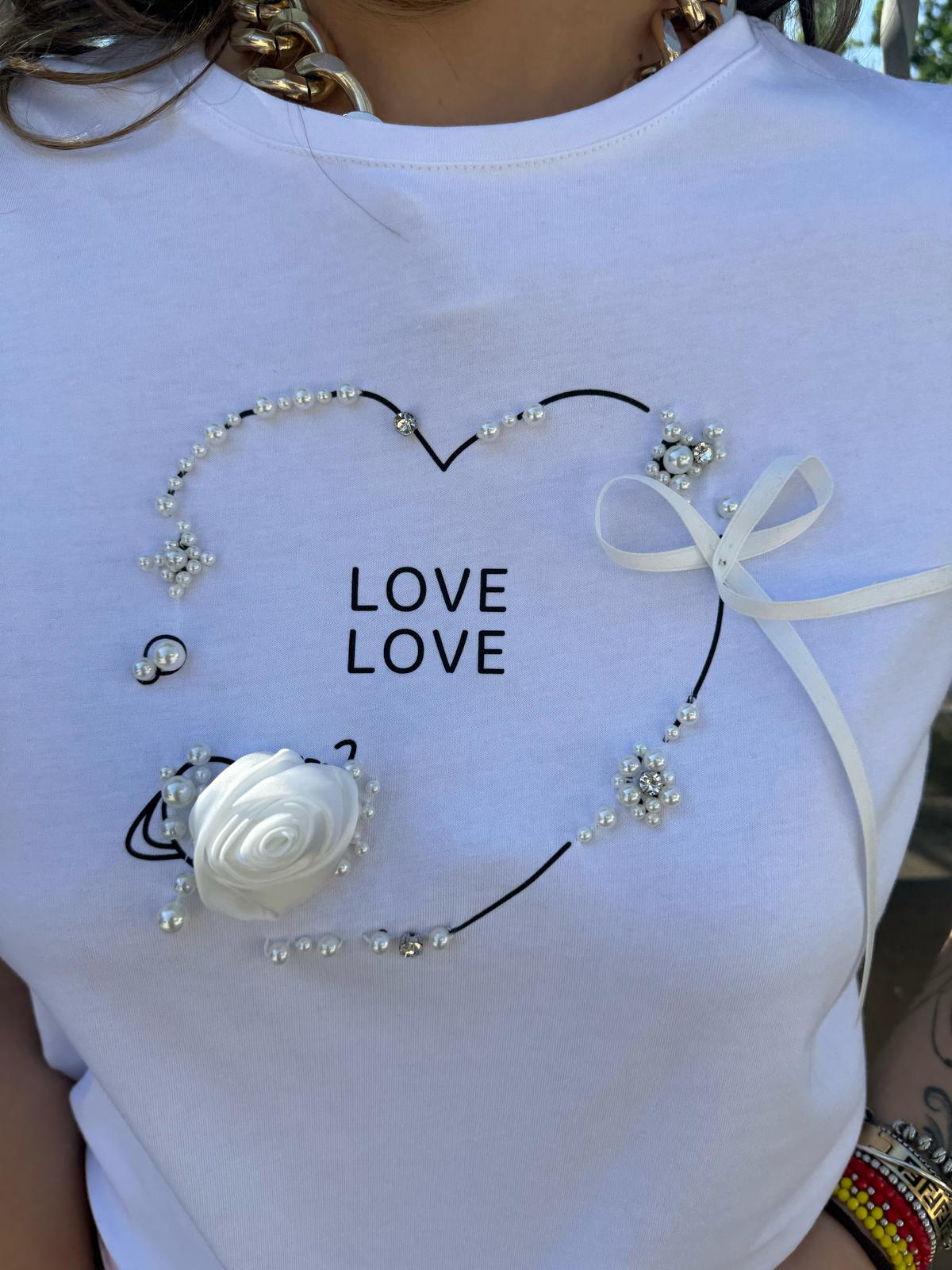 T-shirt con scritta Love e perle