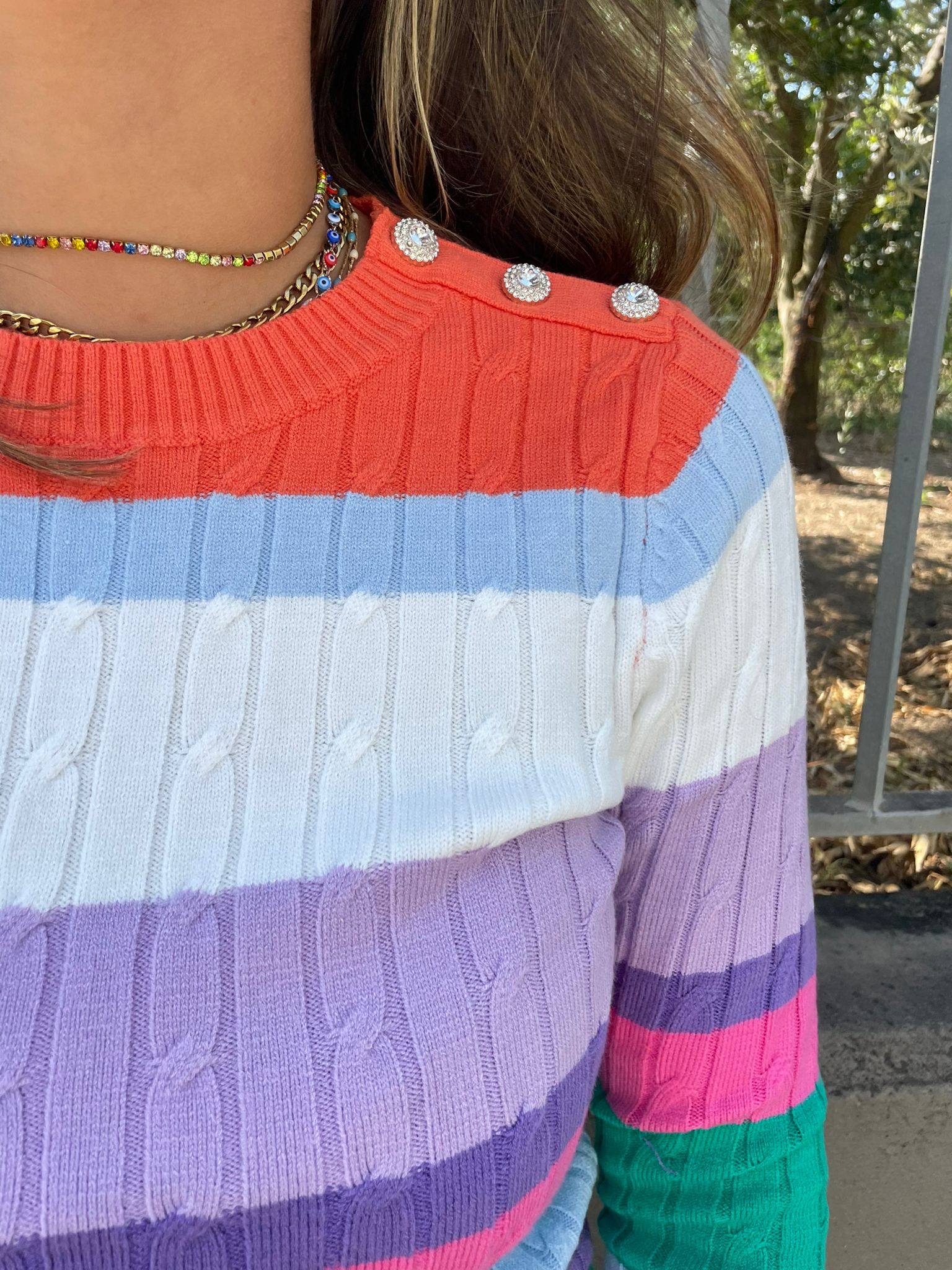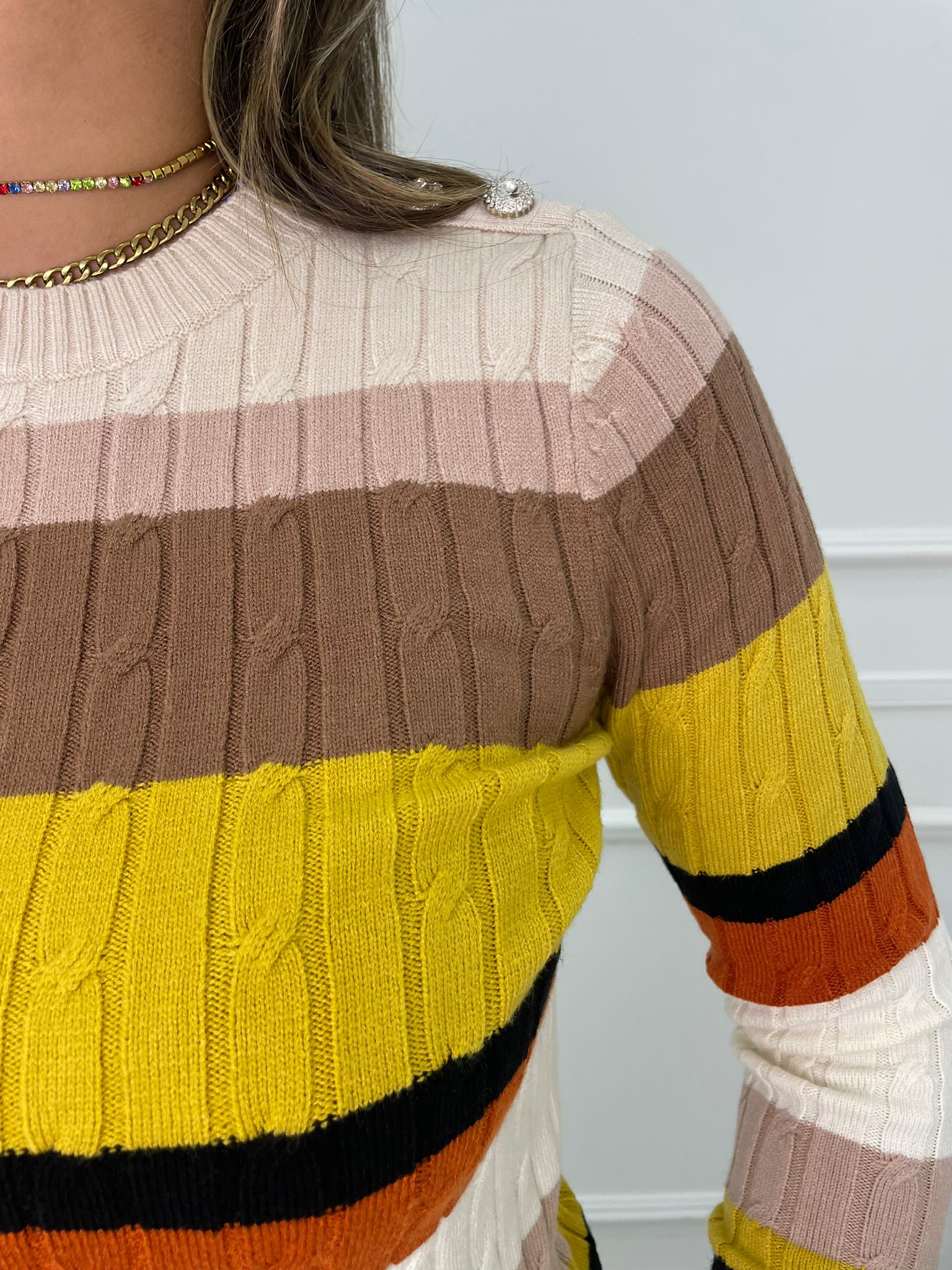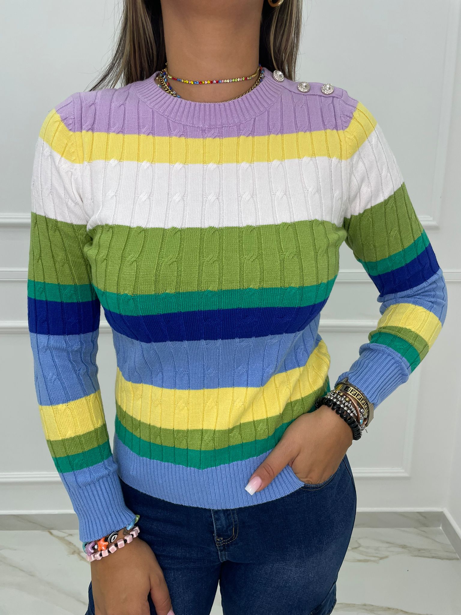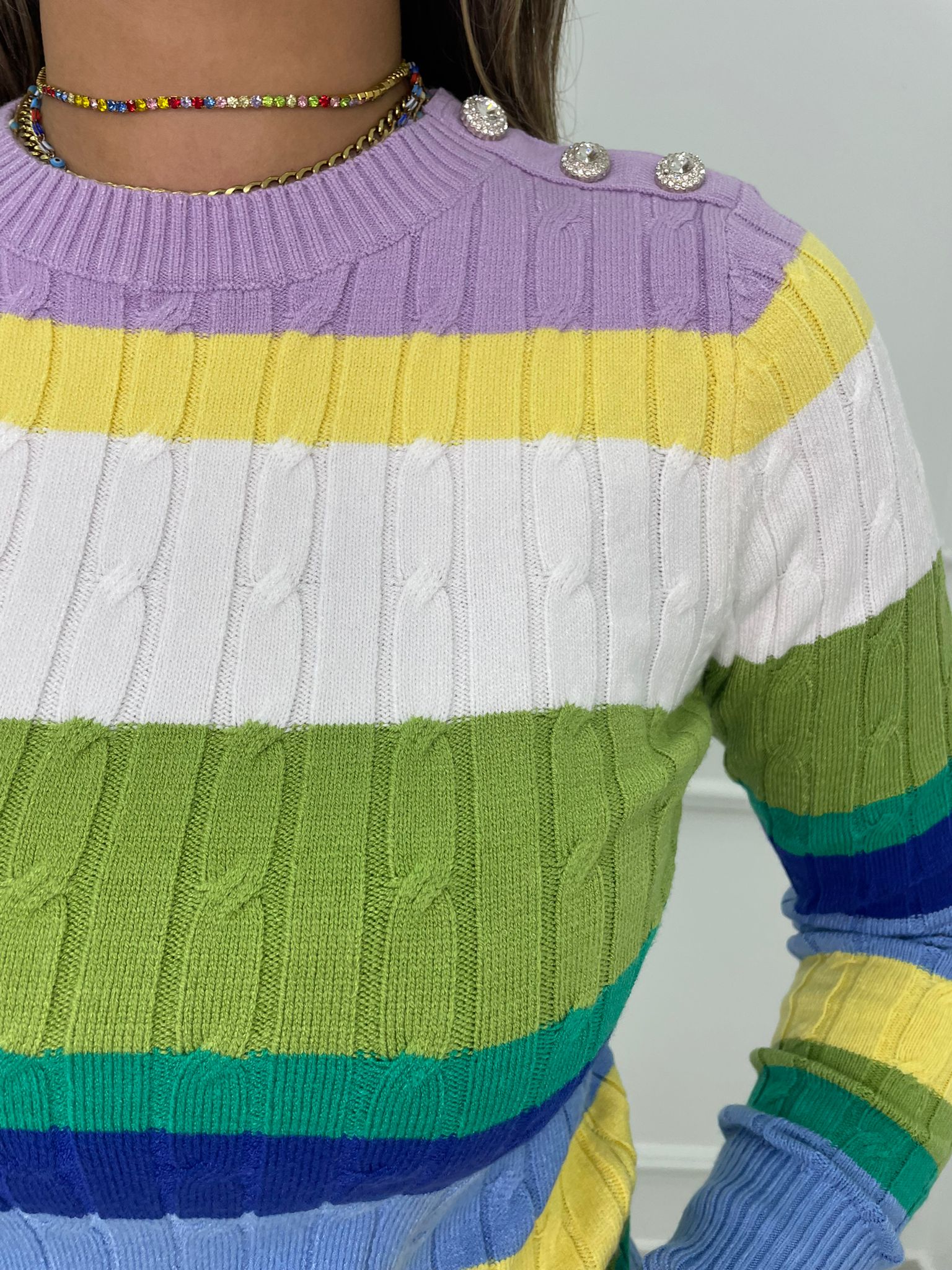 Maglioncino a righe trama treccia con finti bottoni gioiello