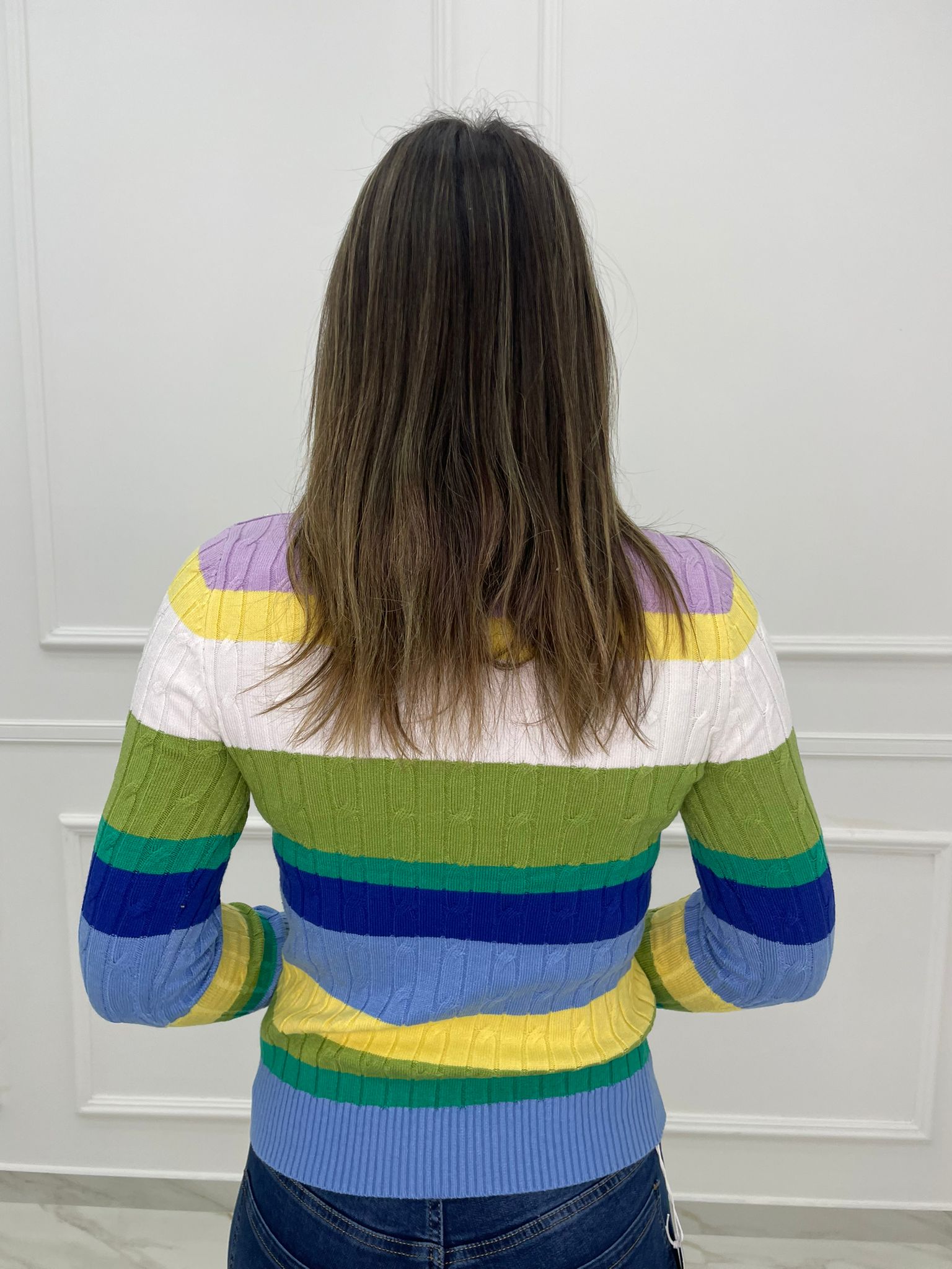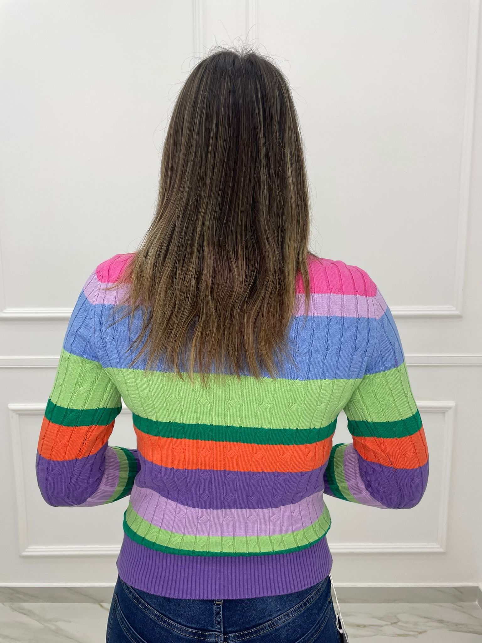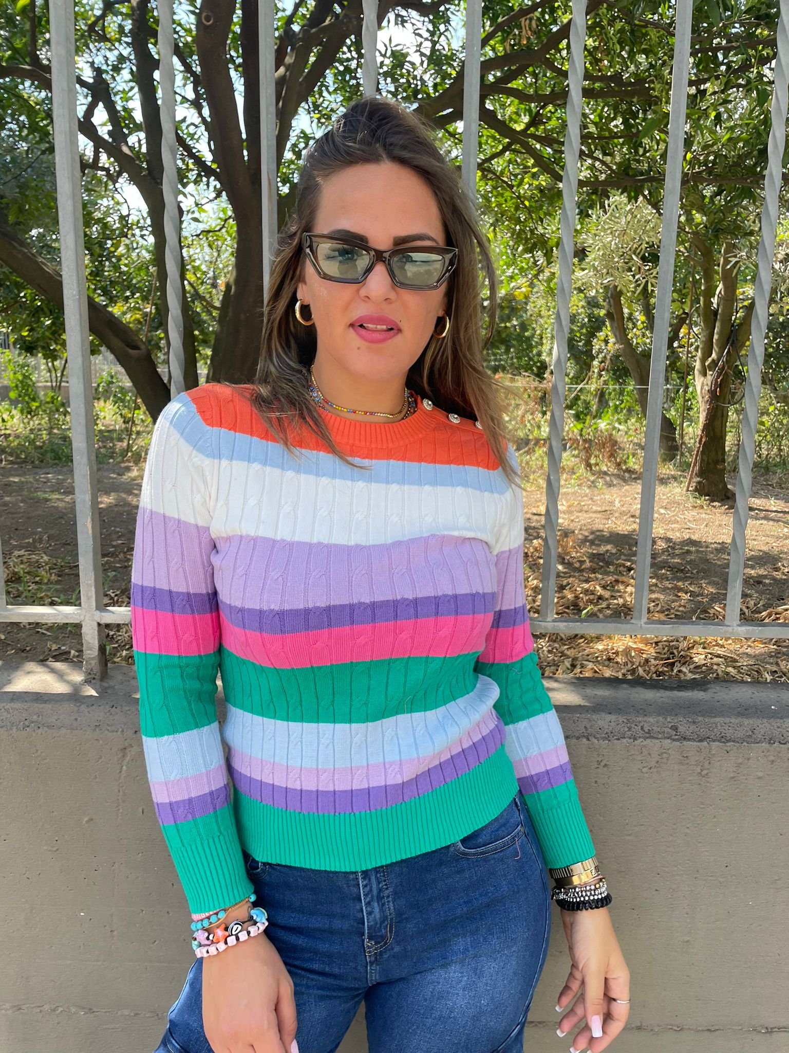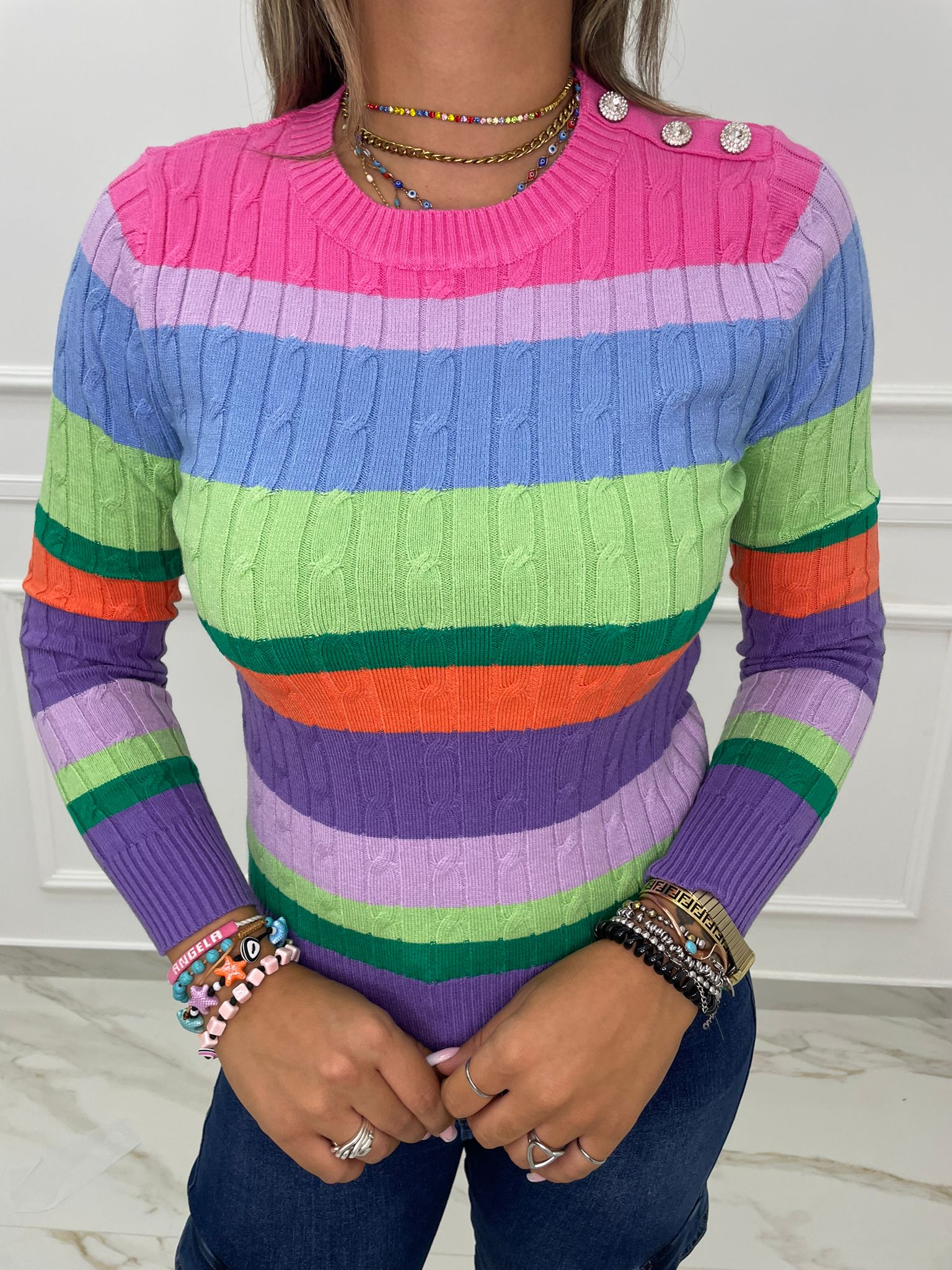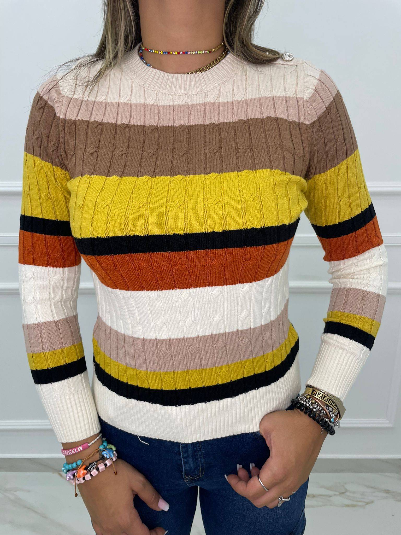 Maglioncino a righe trama treccia con finti bottoni gioiello