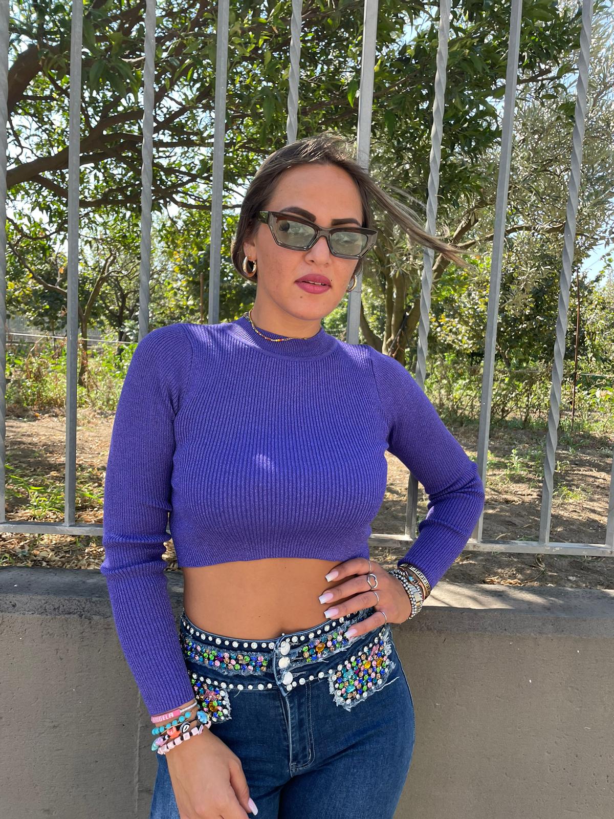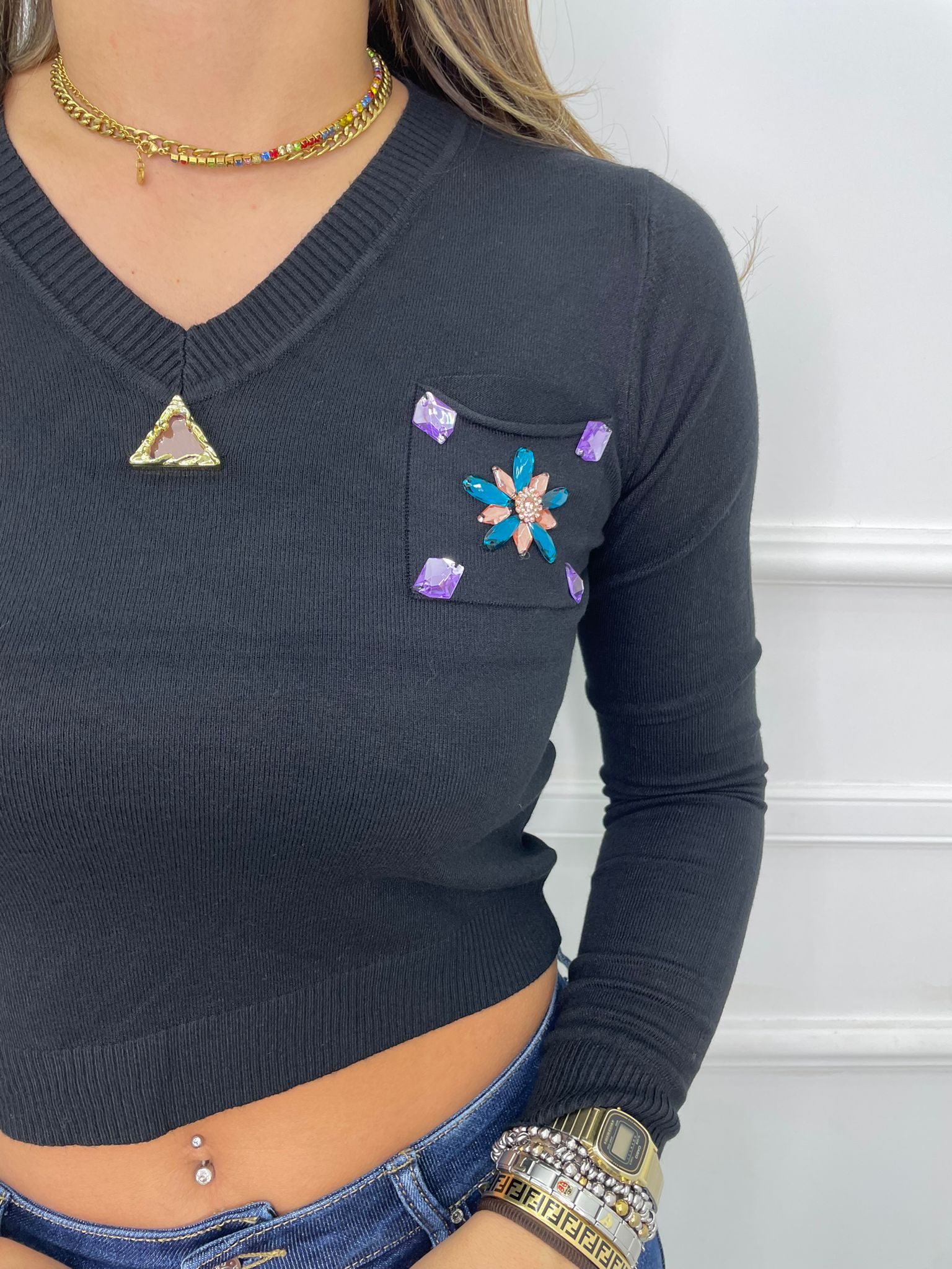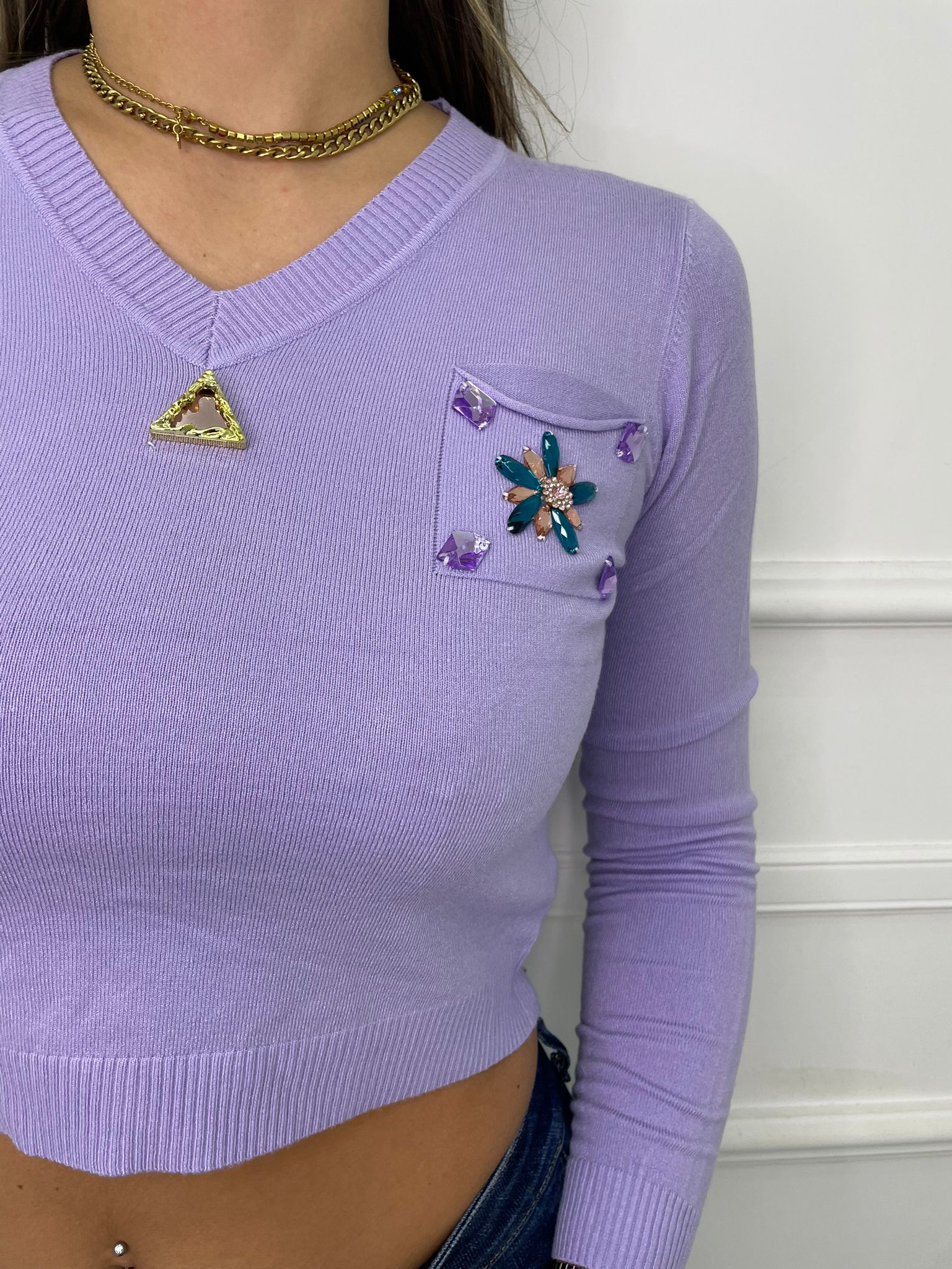 Maglioncino crop scollo a v e applicazioni gioiello