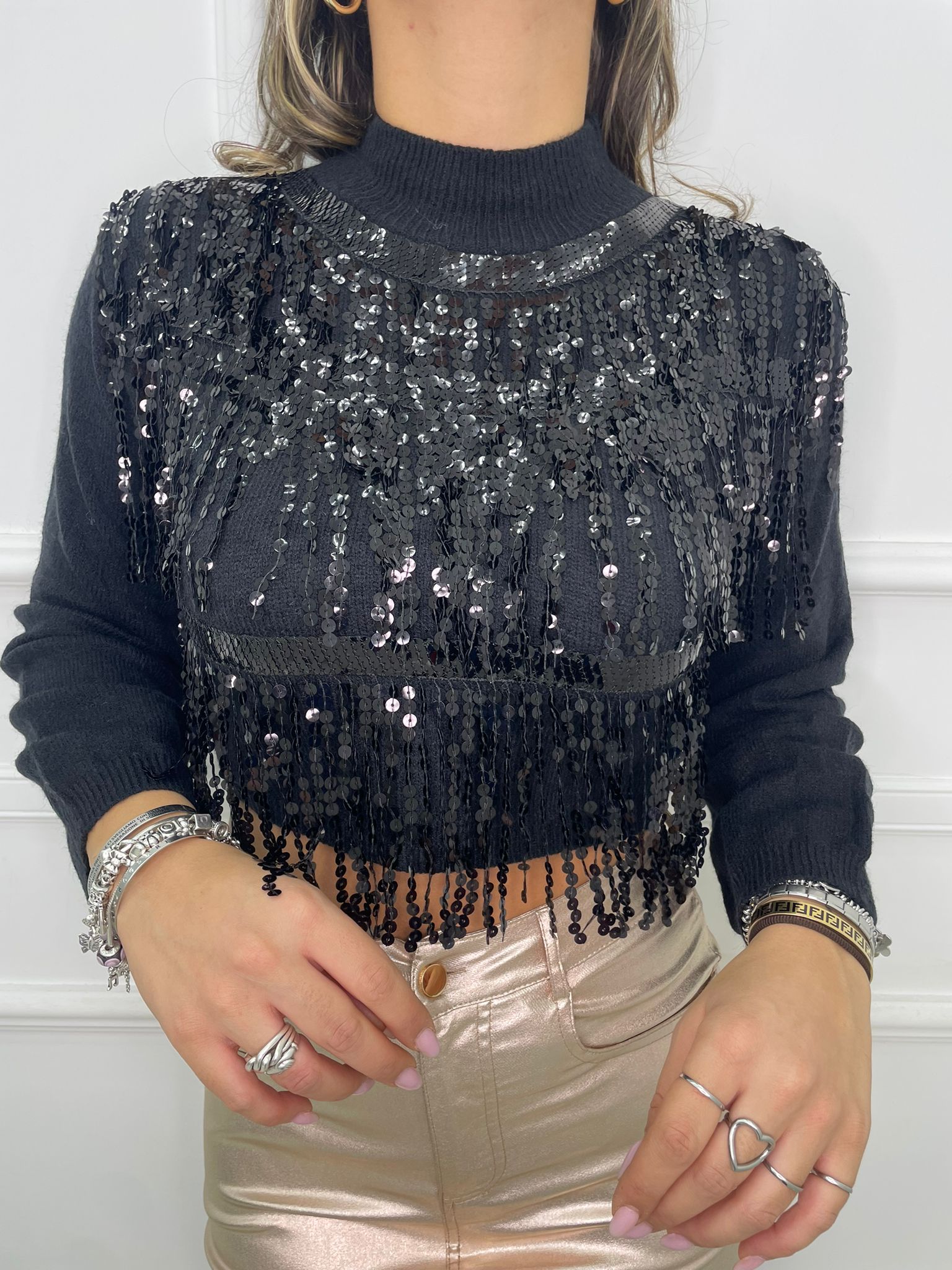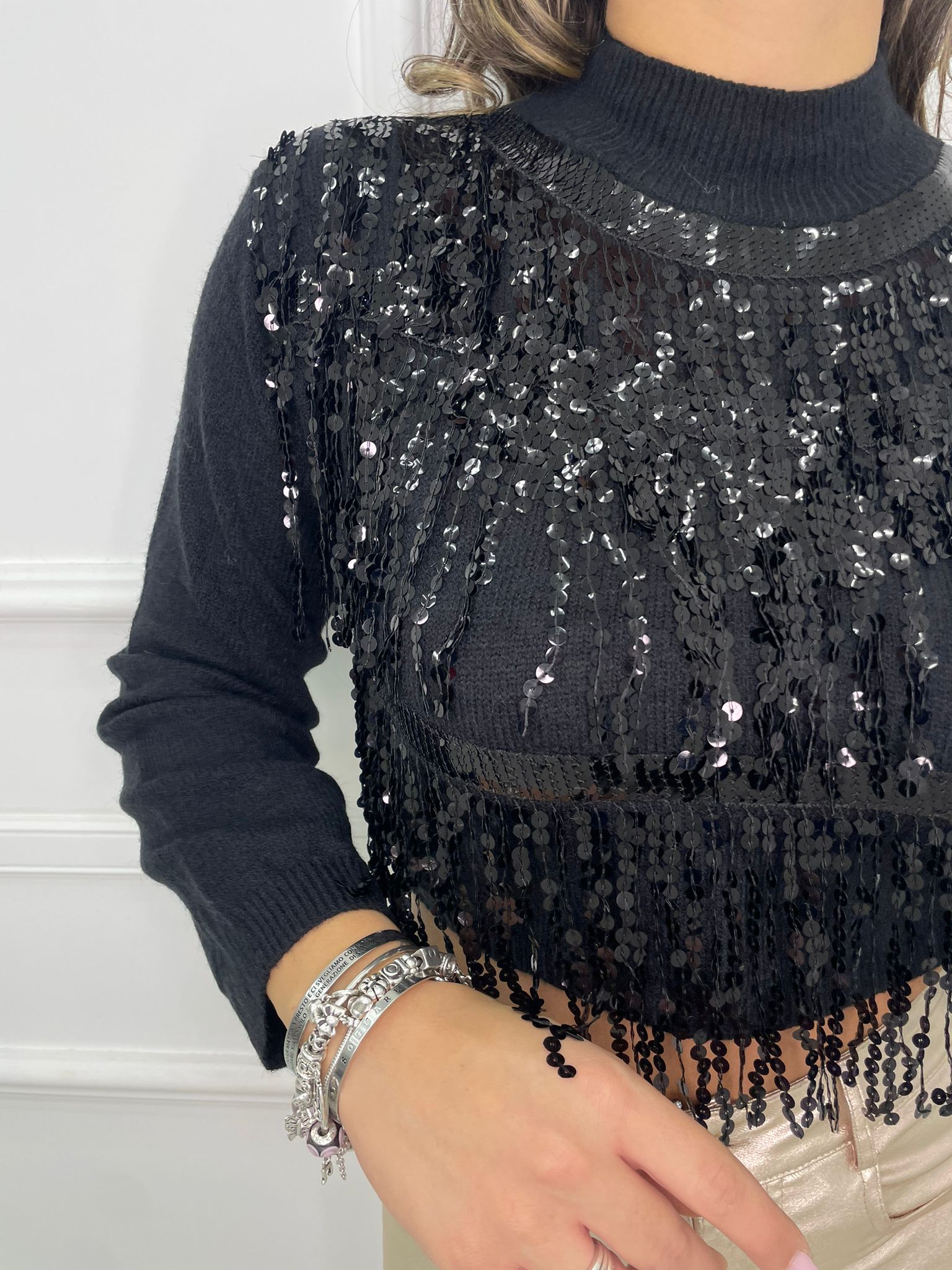 Maglione mezzo collo con cascata di paillettes