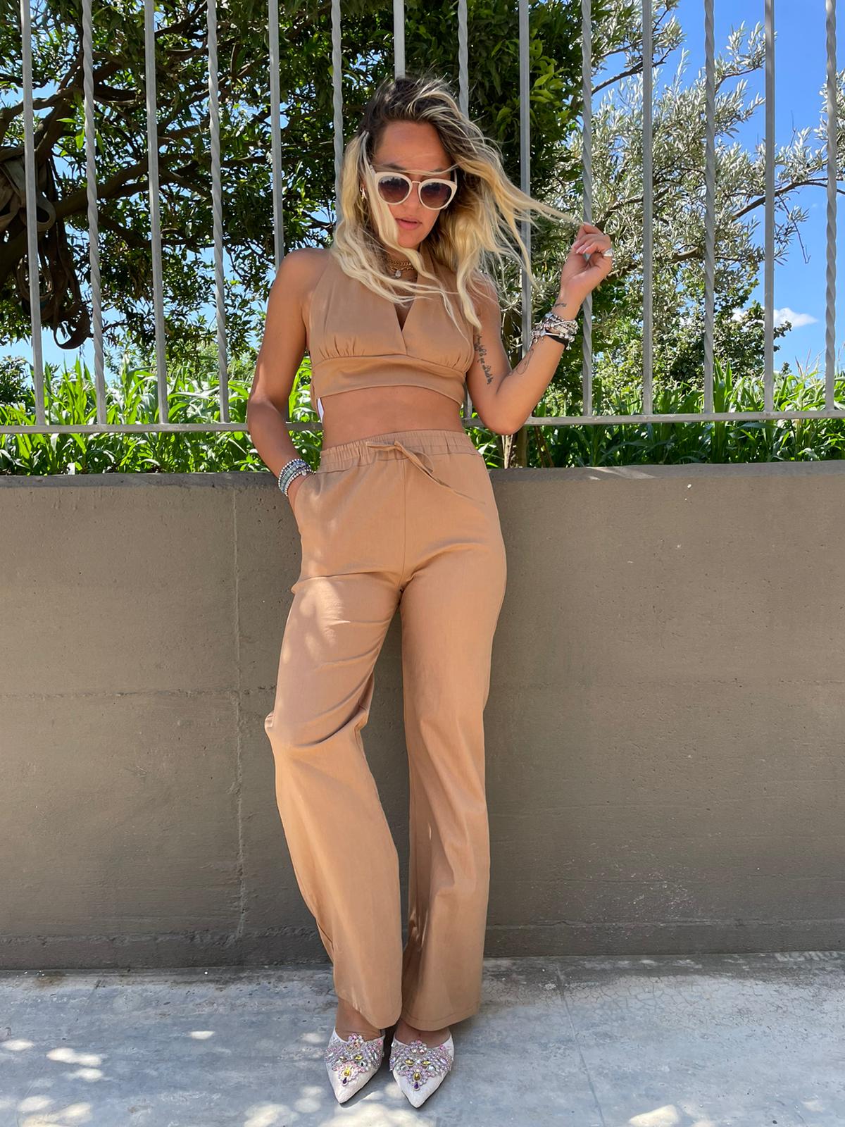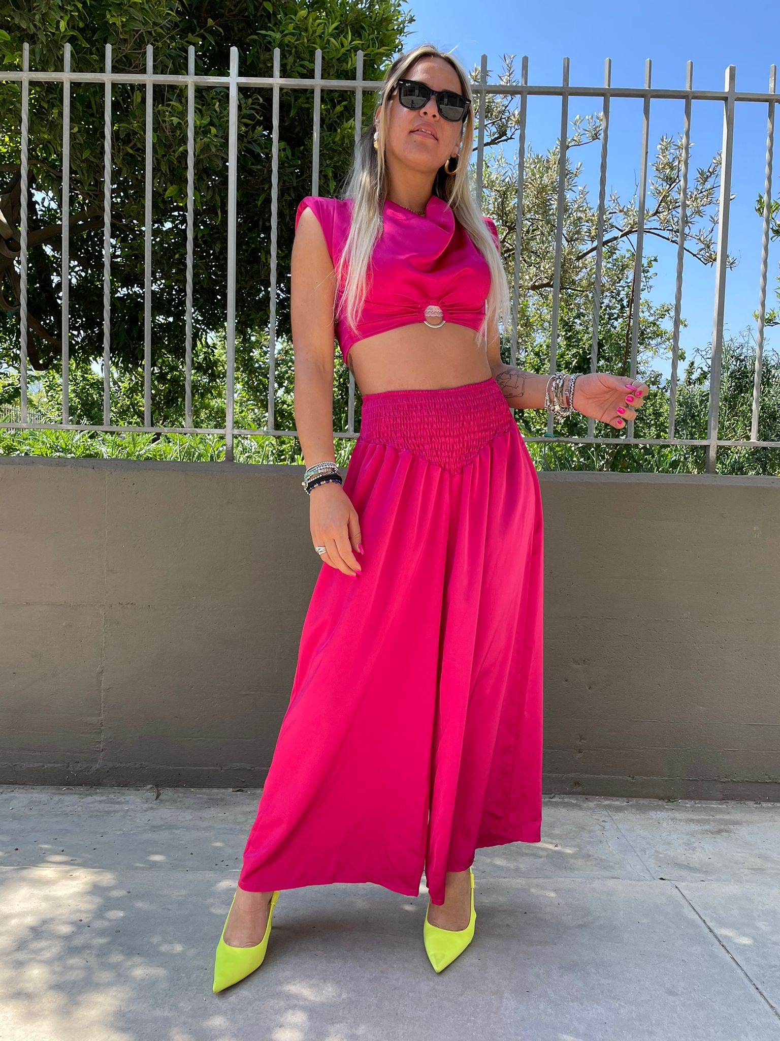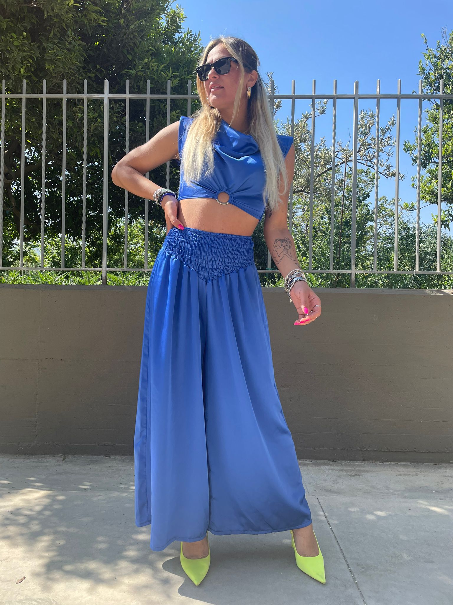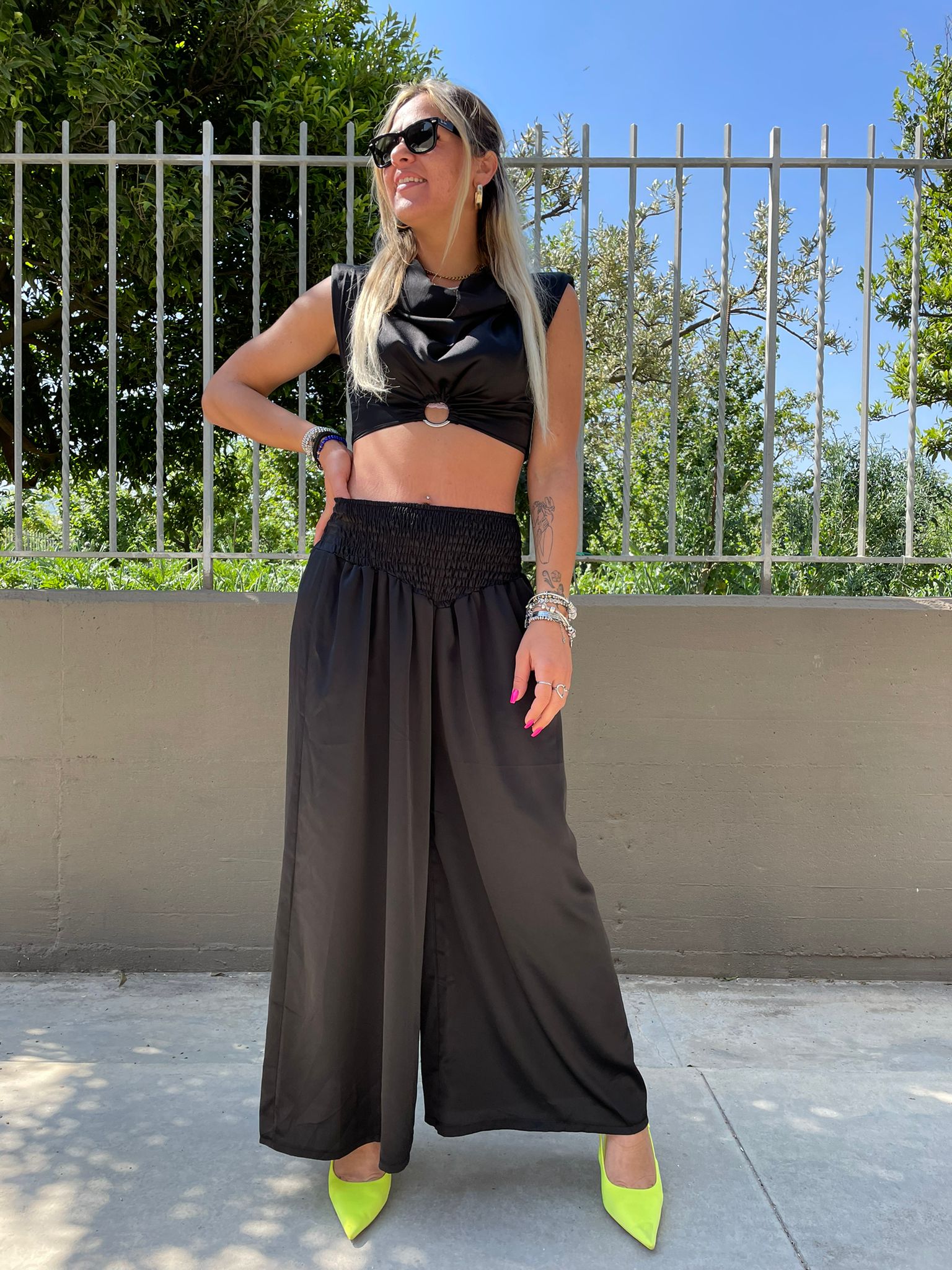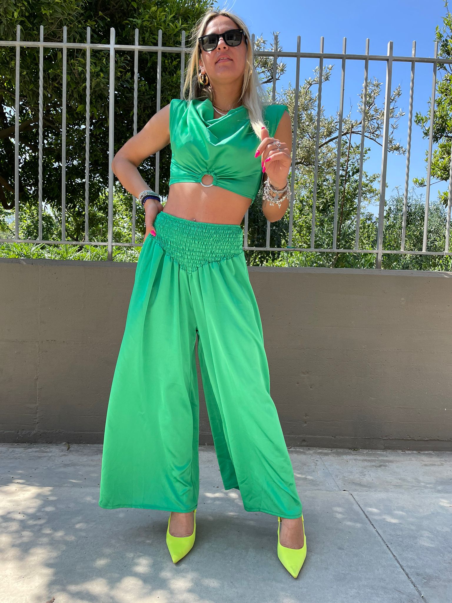 Coordinato effetto seta con pantalone palazzo e maglia con spalline
