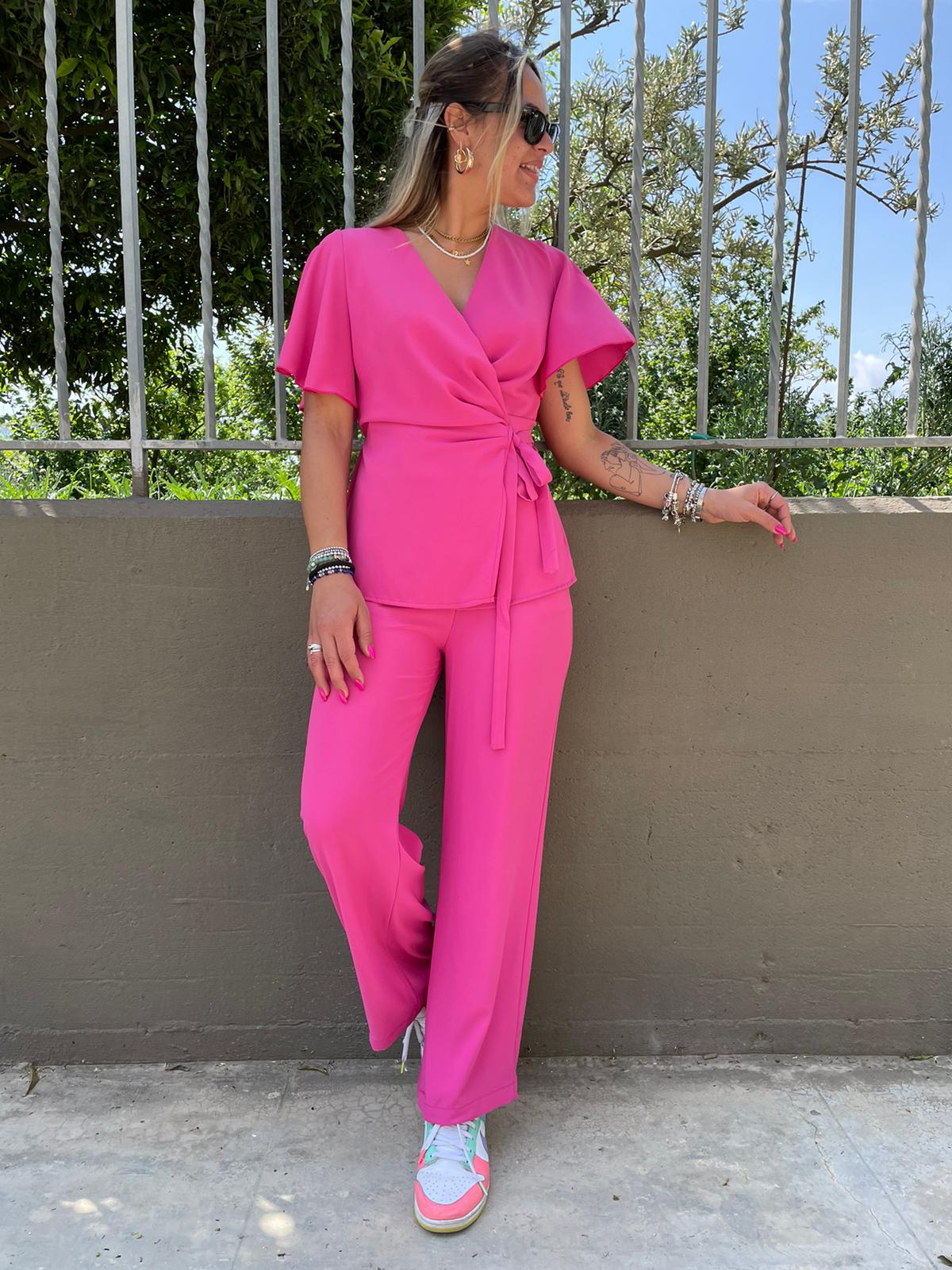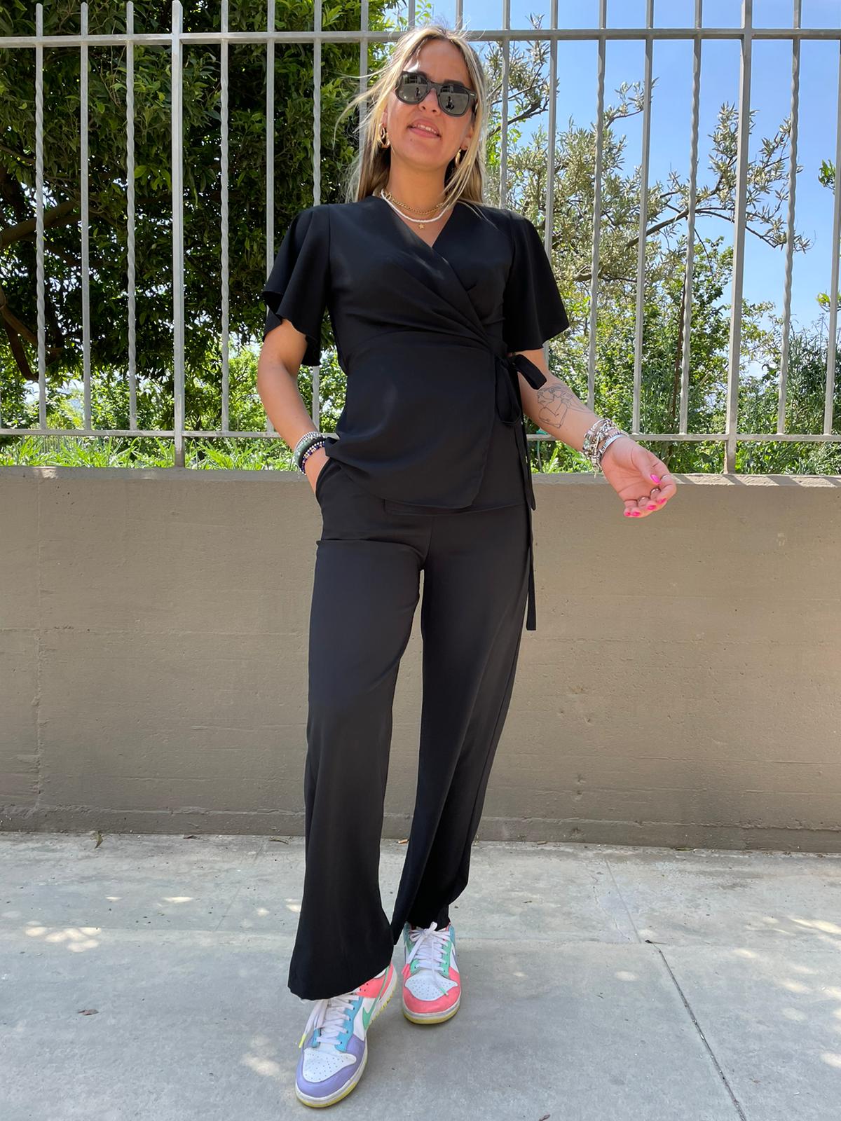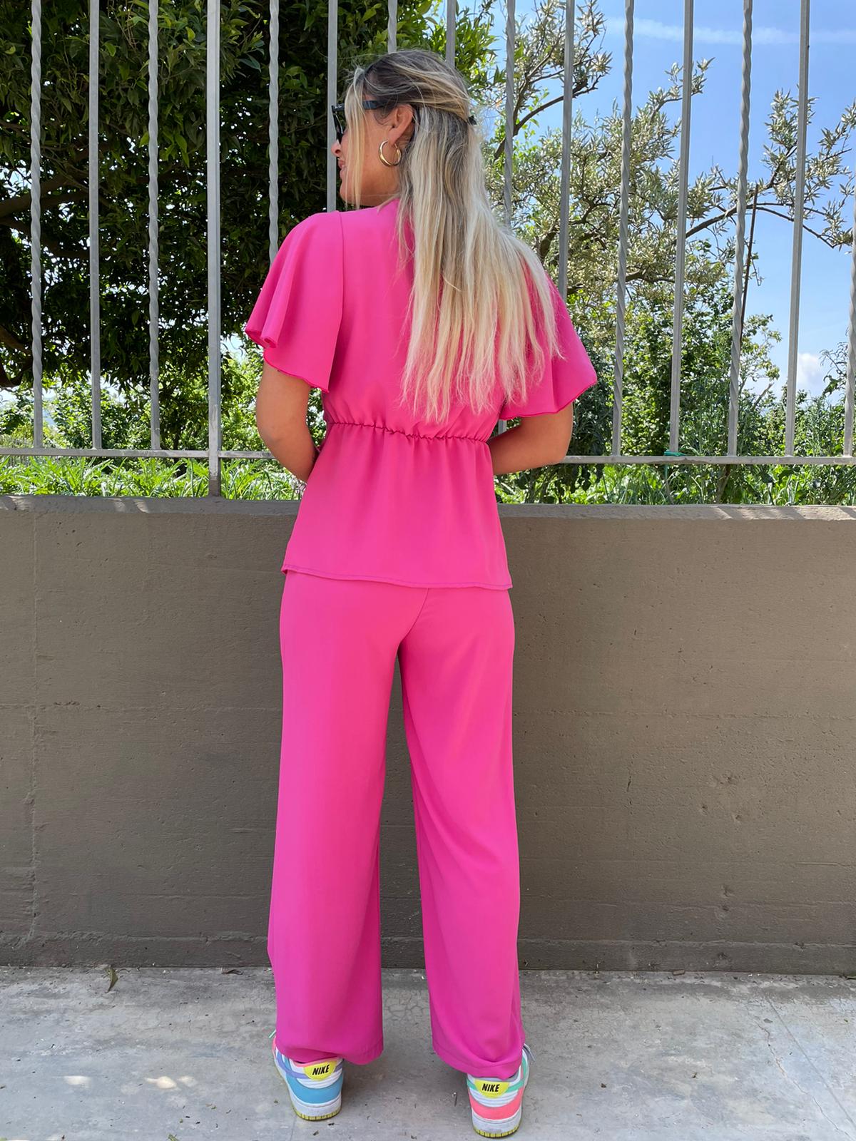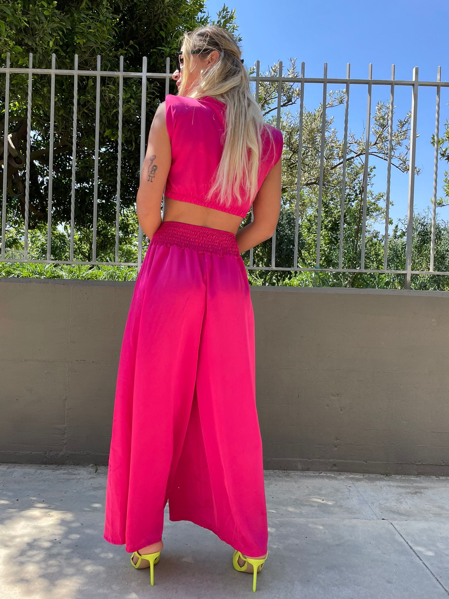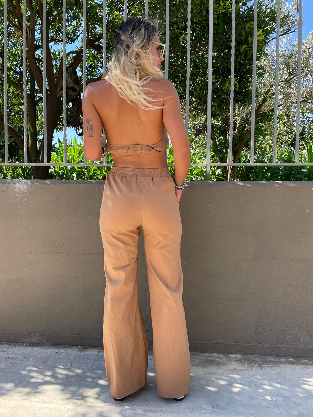 Coordinato effetto seta con pantalone palazzo e maglia con spalline