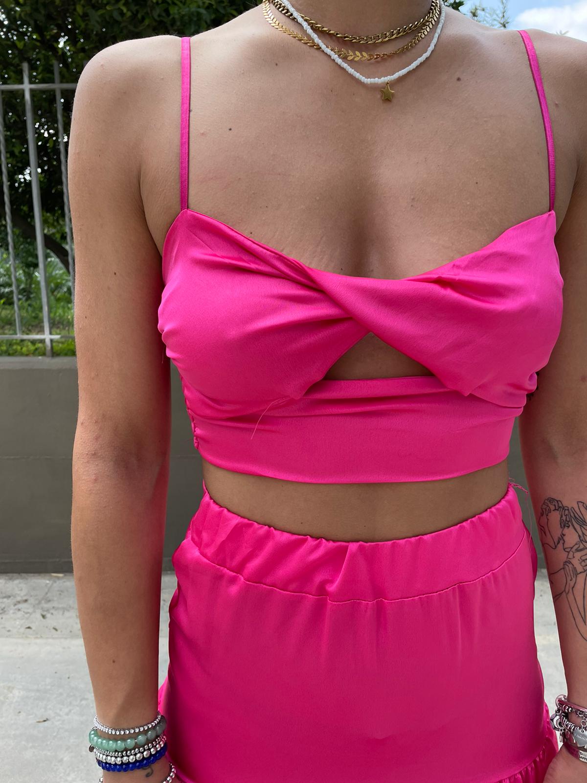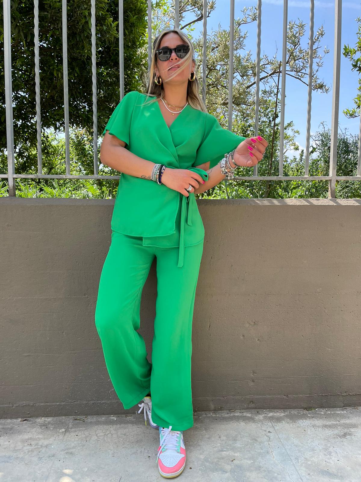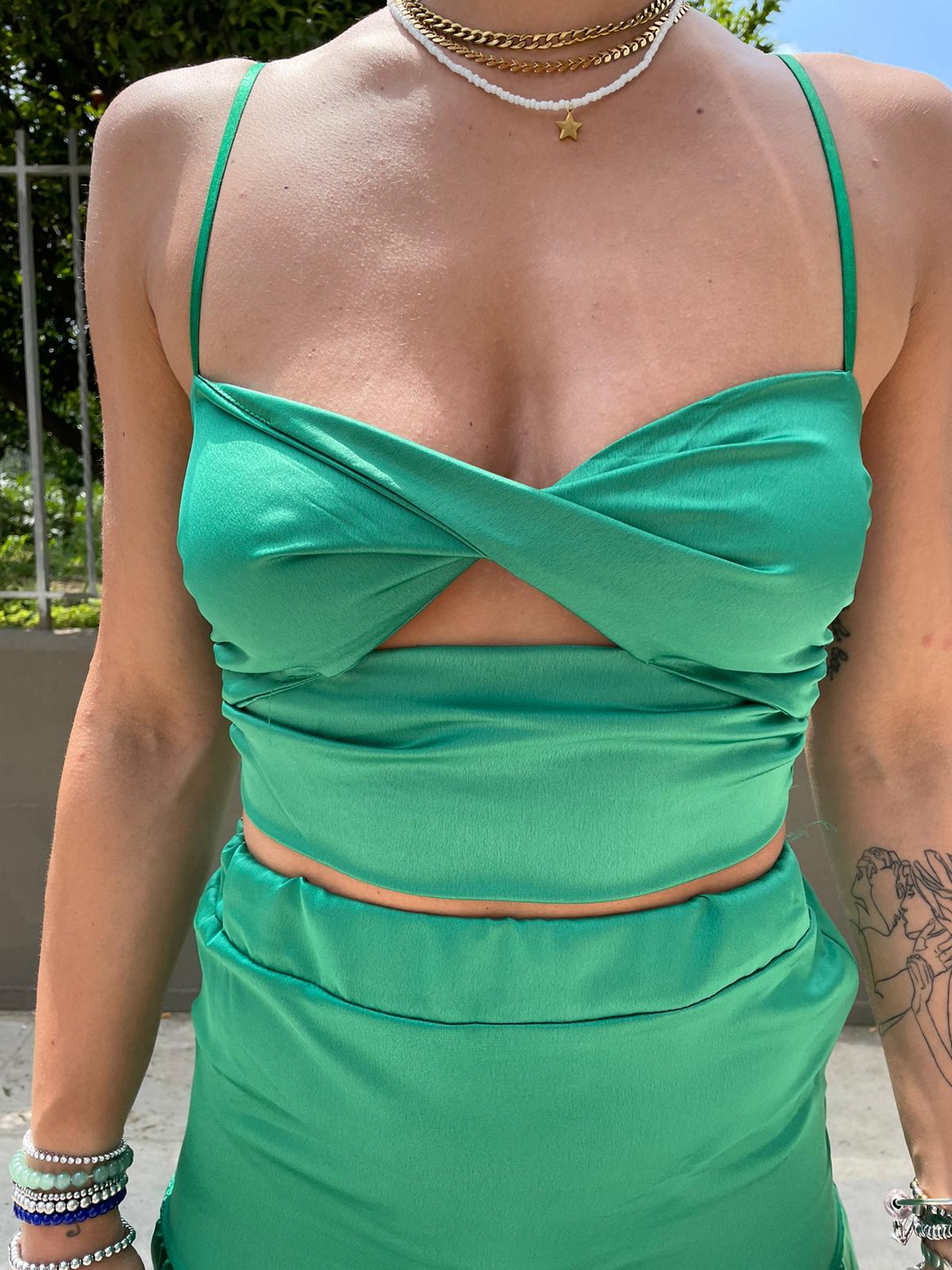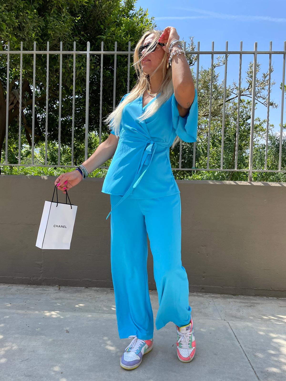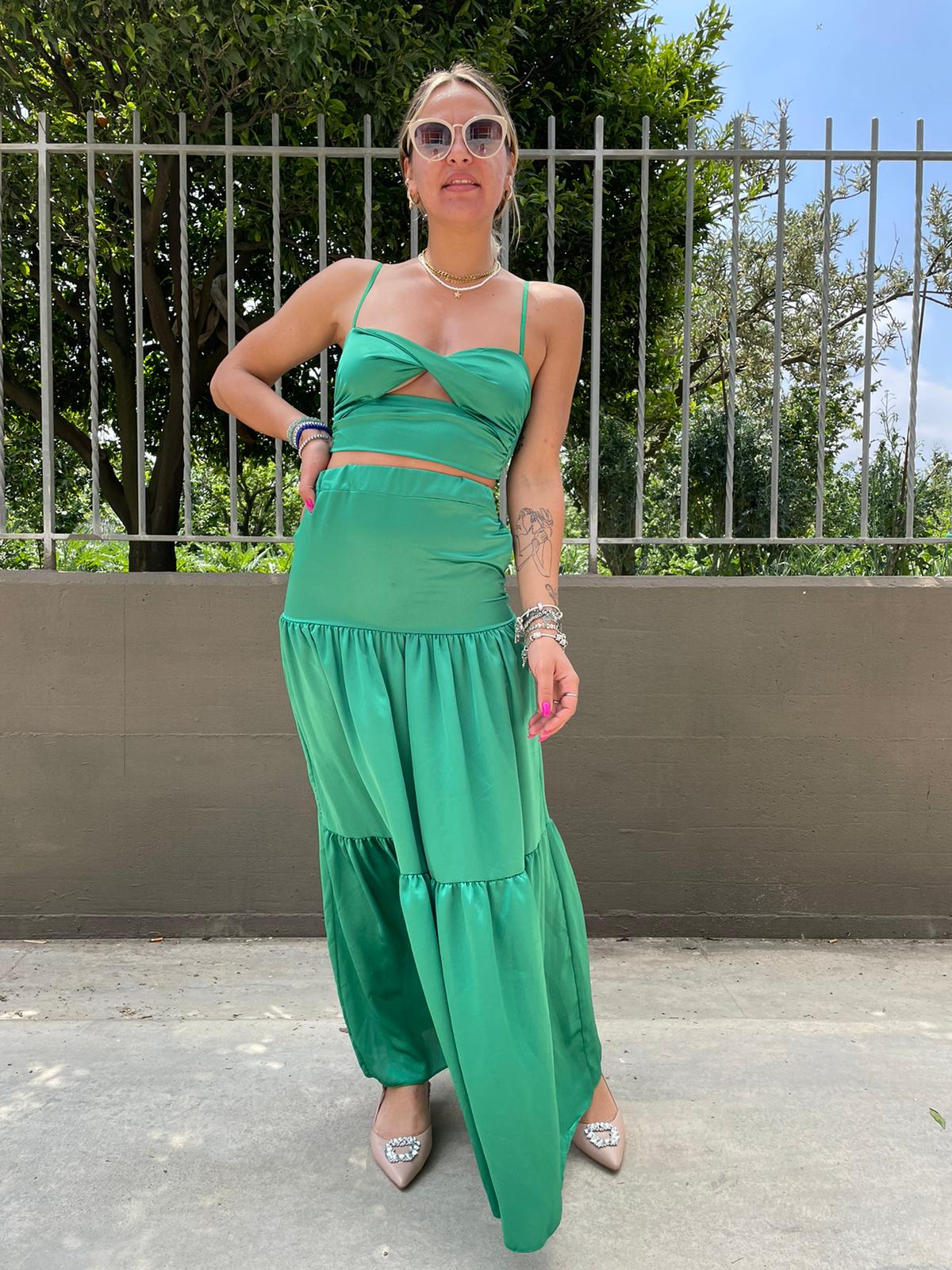 Coordinato effetto seta con pantalone palazzo e maglia con spalline
