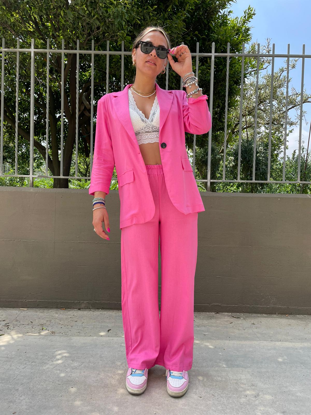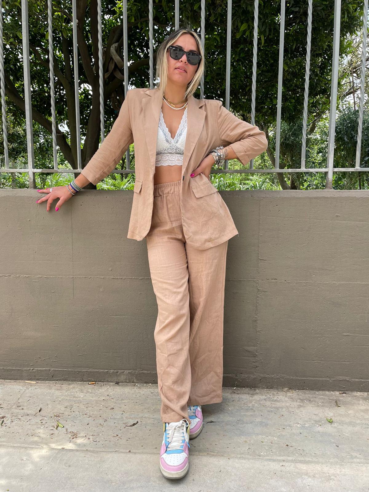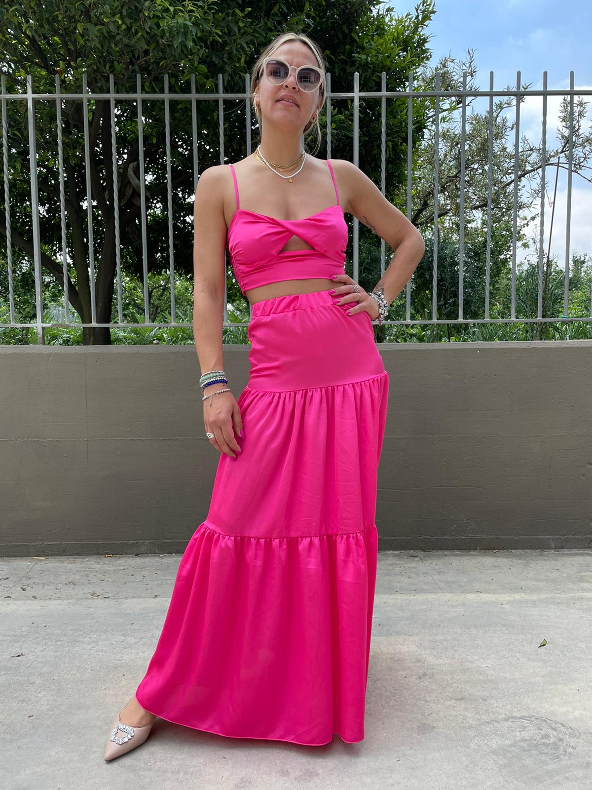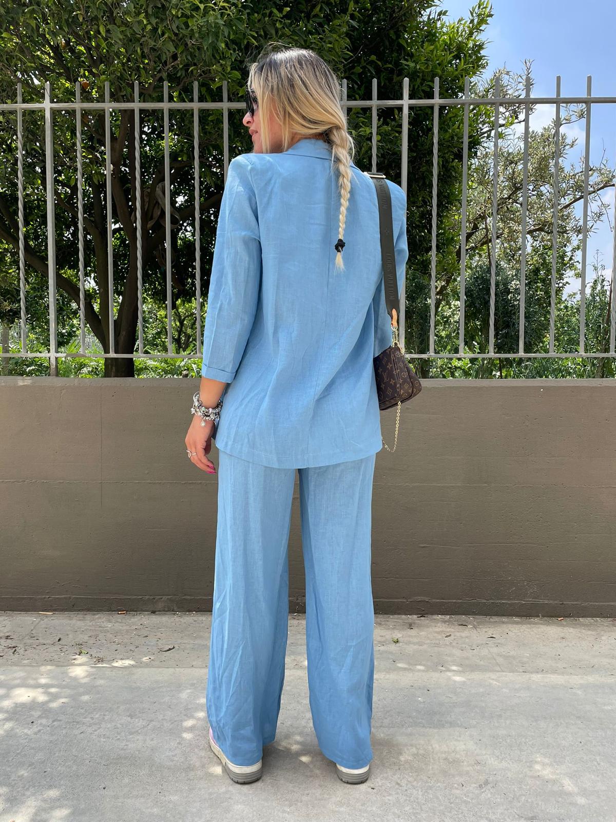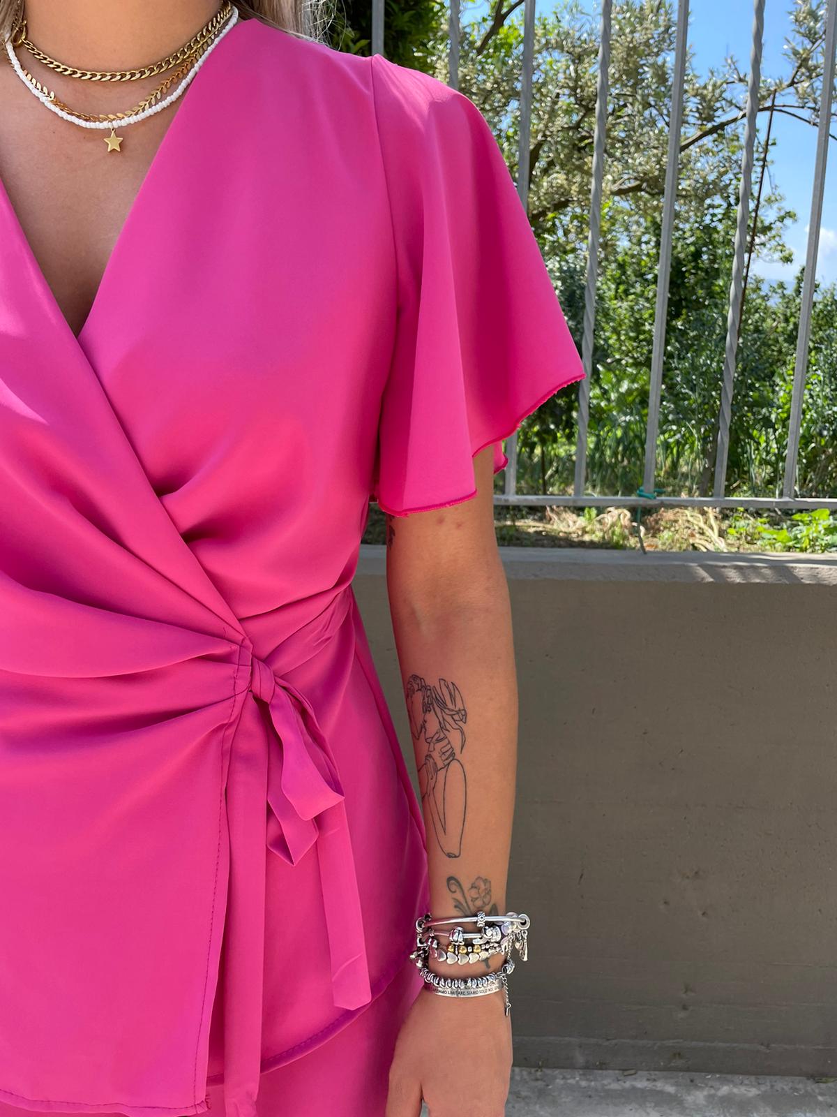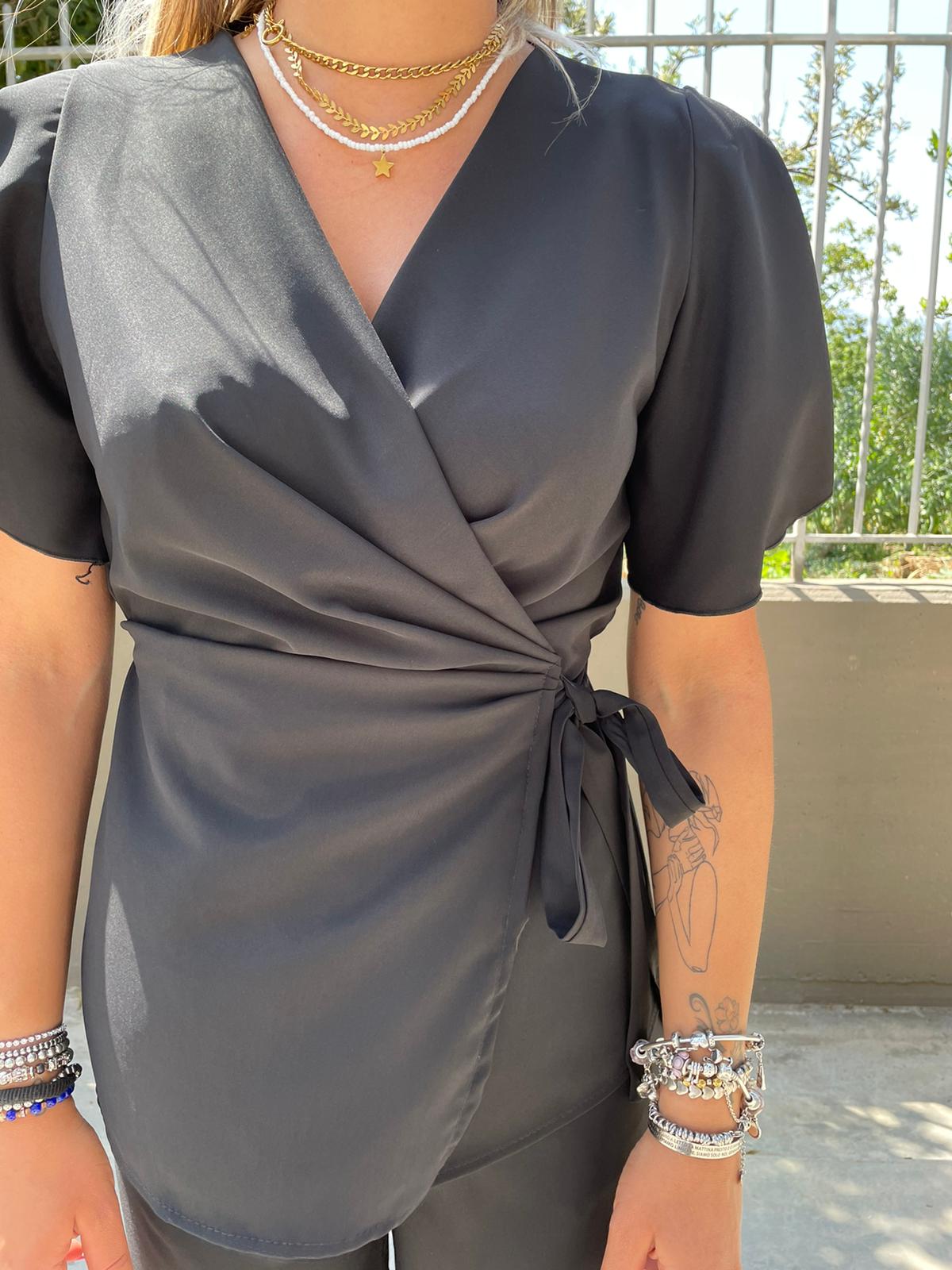 Coordinato effetto seta con pantalone palazzo e maglia con spalline