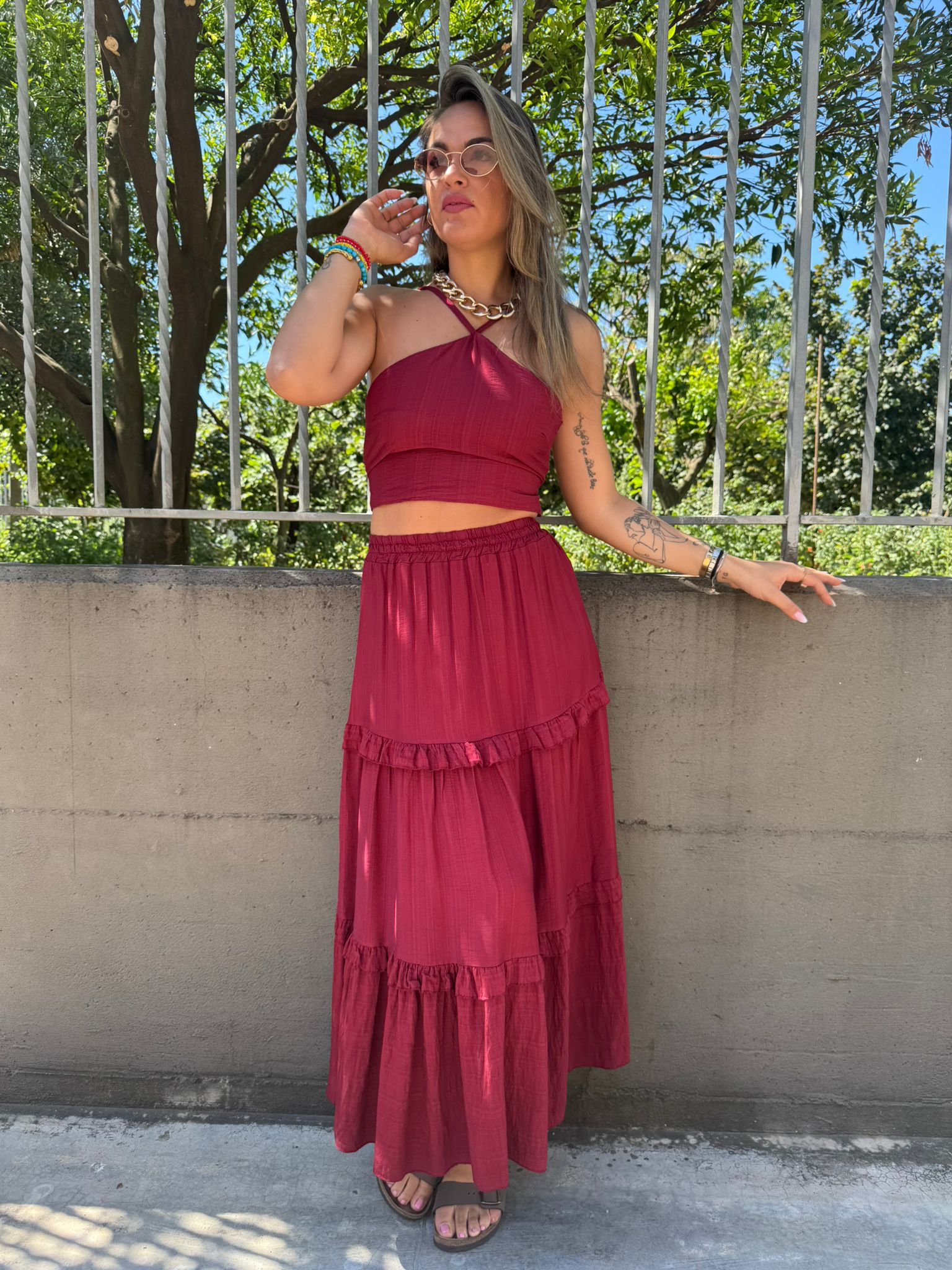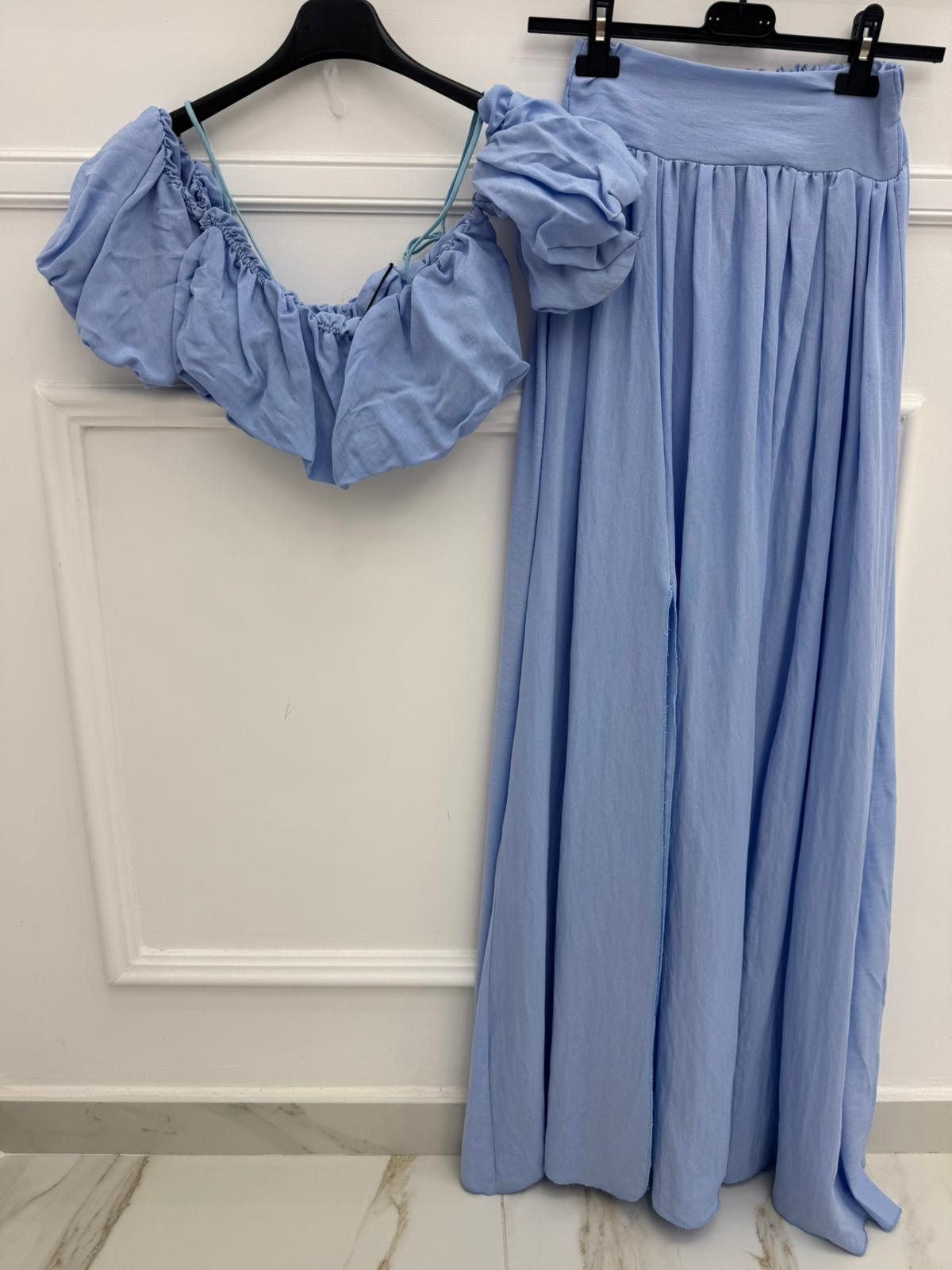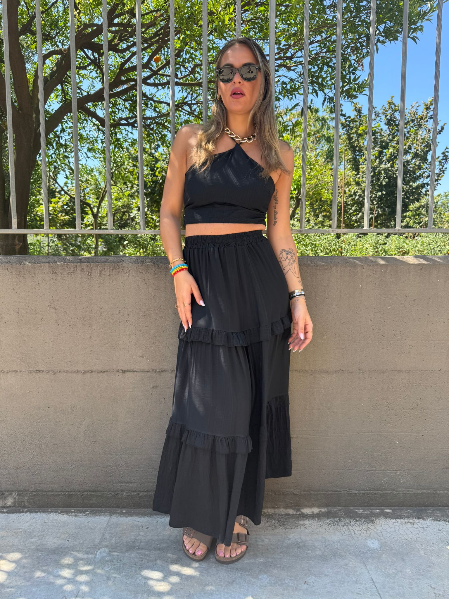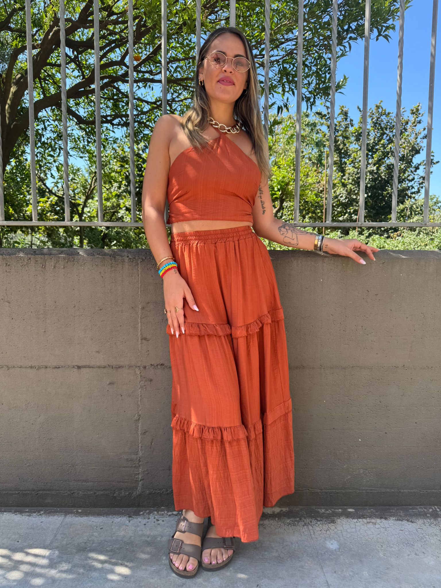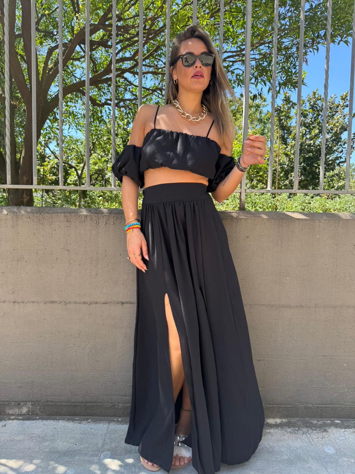 Coordinato 2 pezzi effetto lino con gonnellone e top