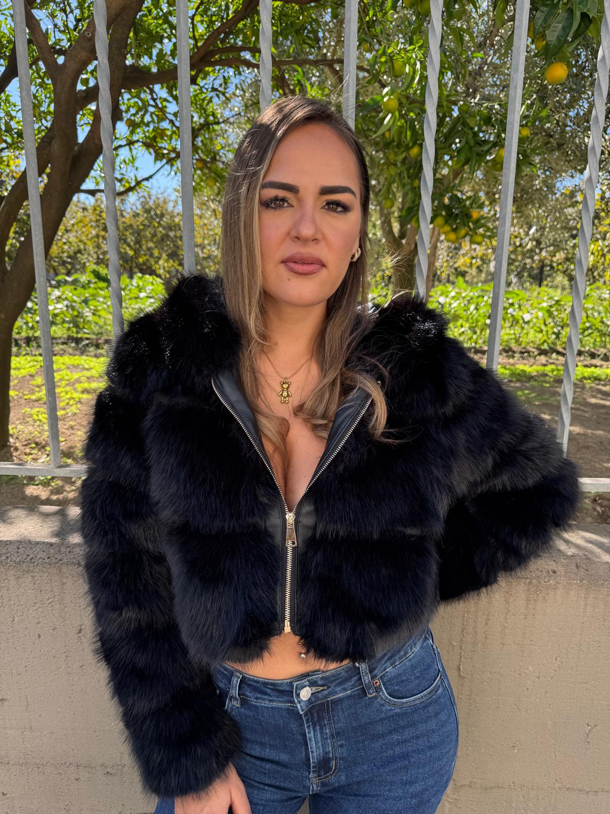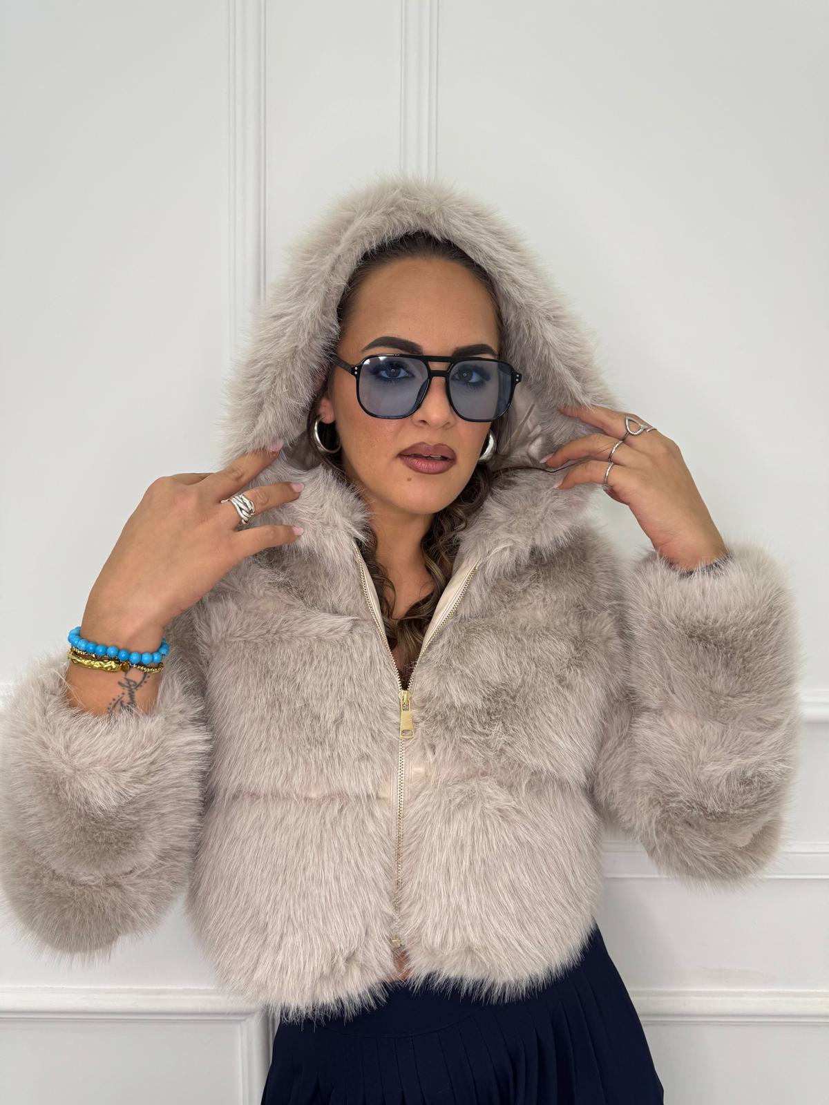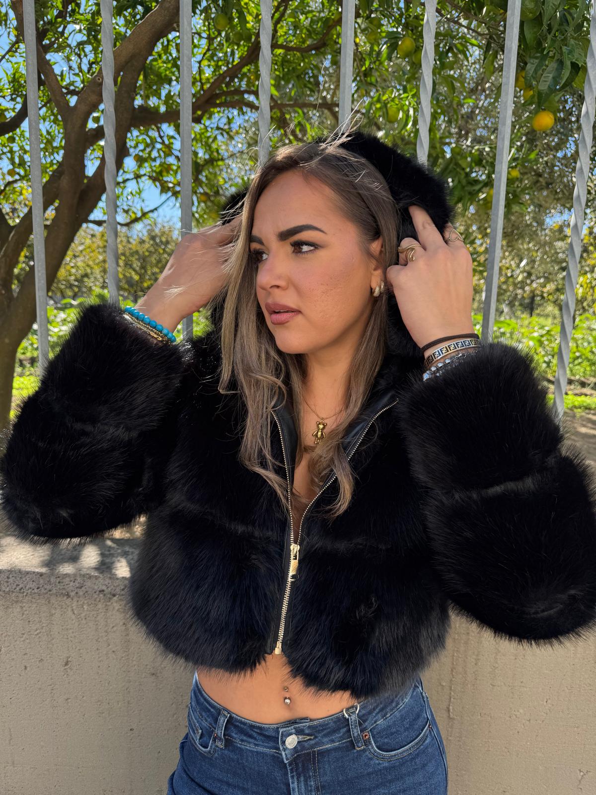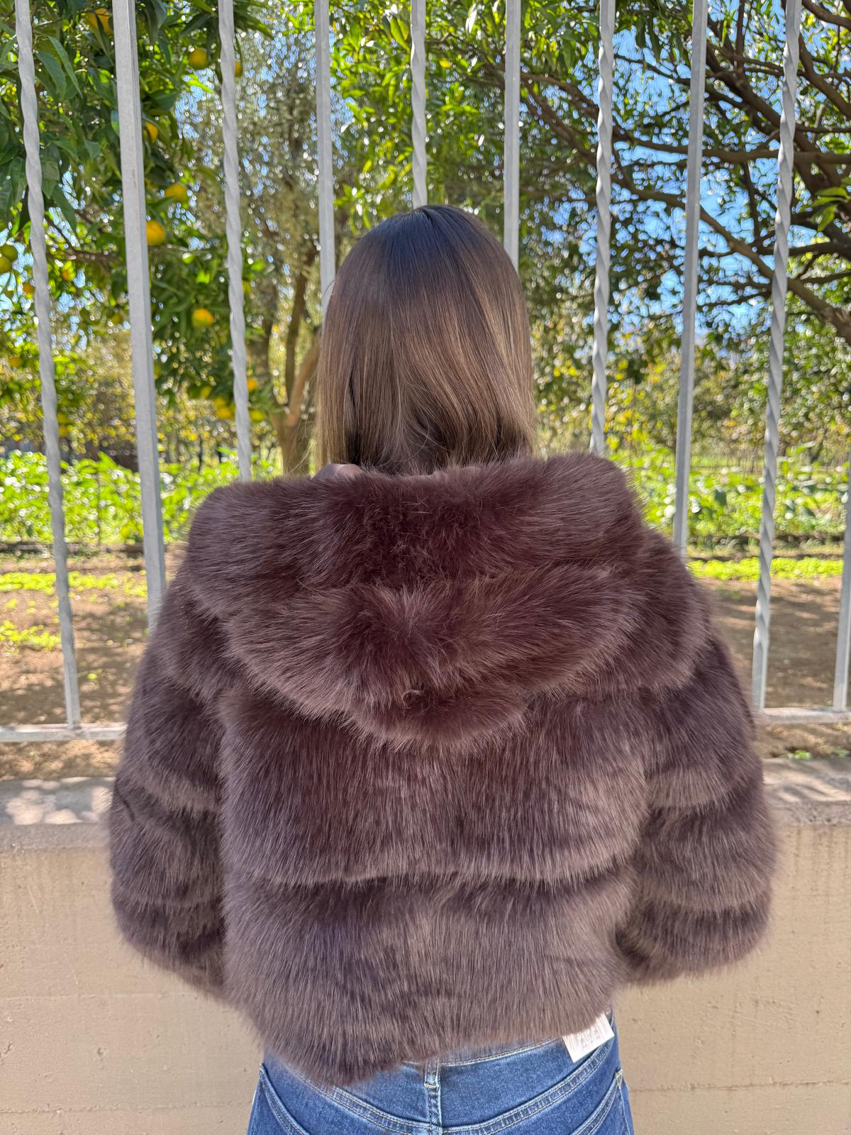 Pelliccia eco crop con zip e cappuccio