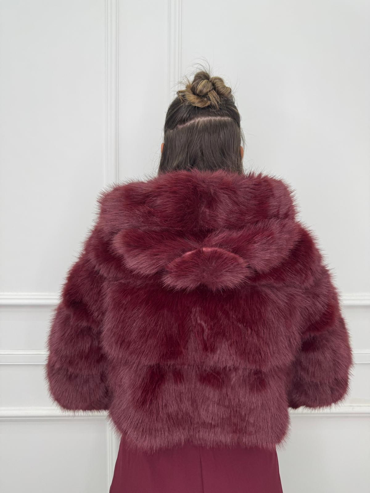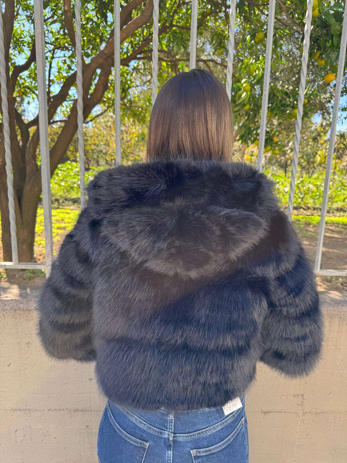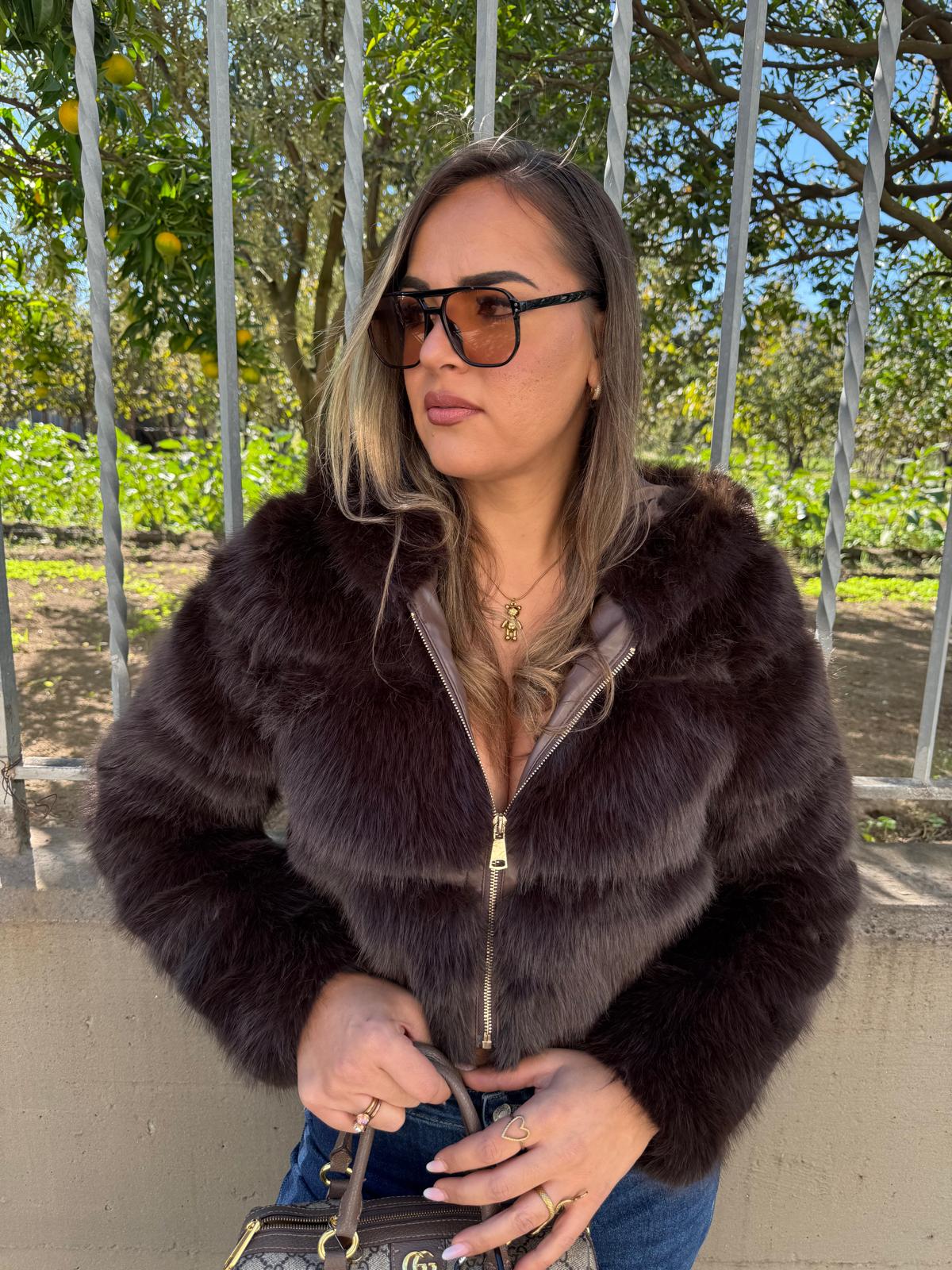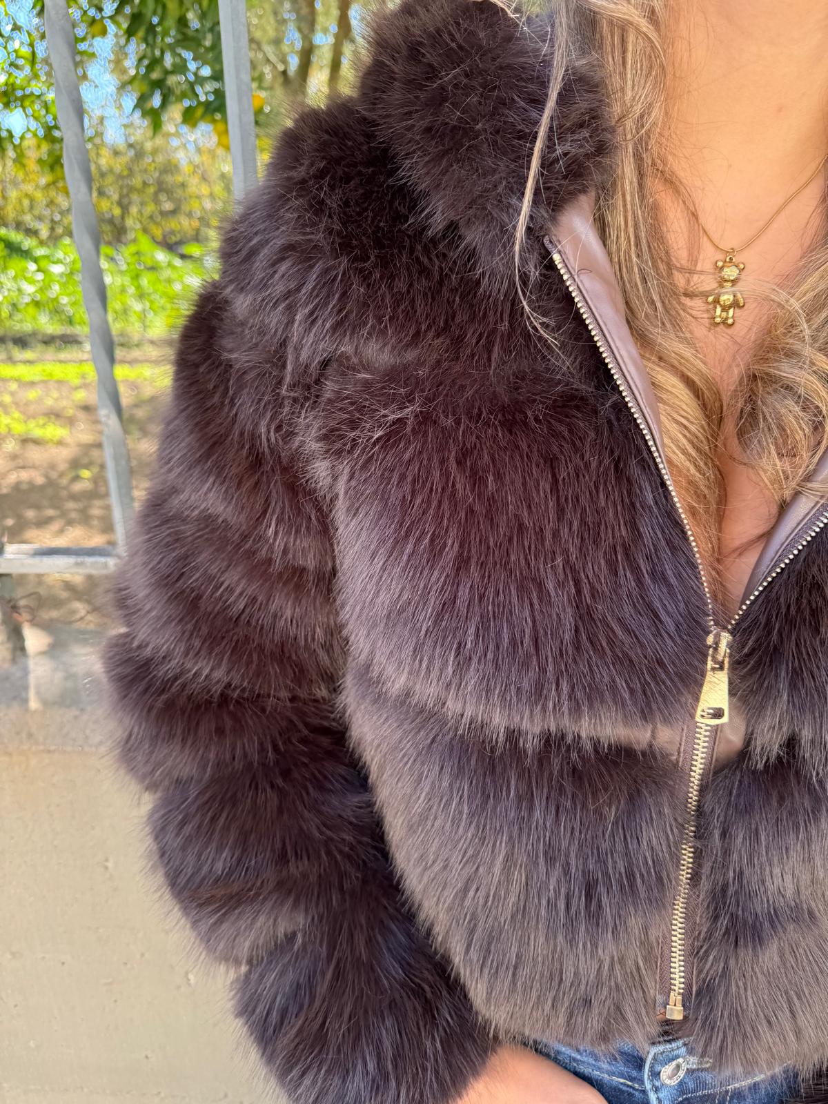 Pelliccia eco crop con zip e cappuccio