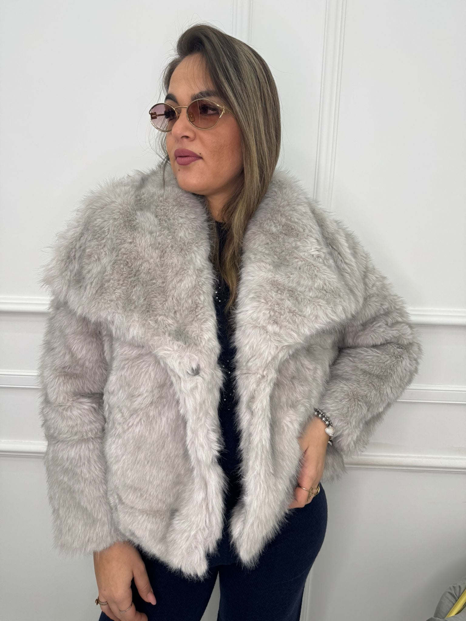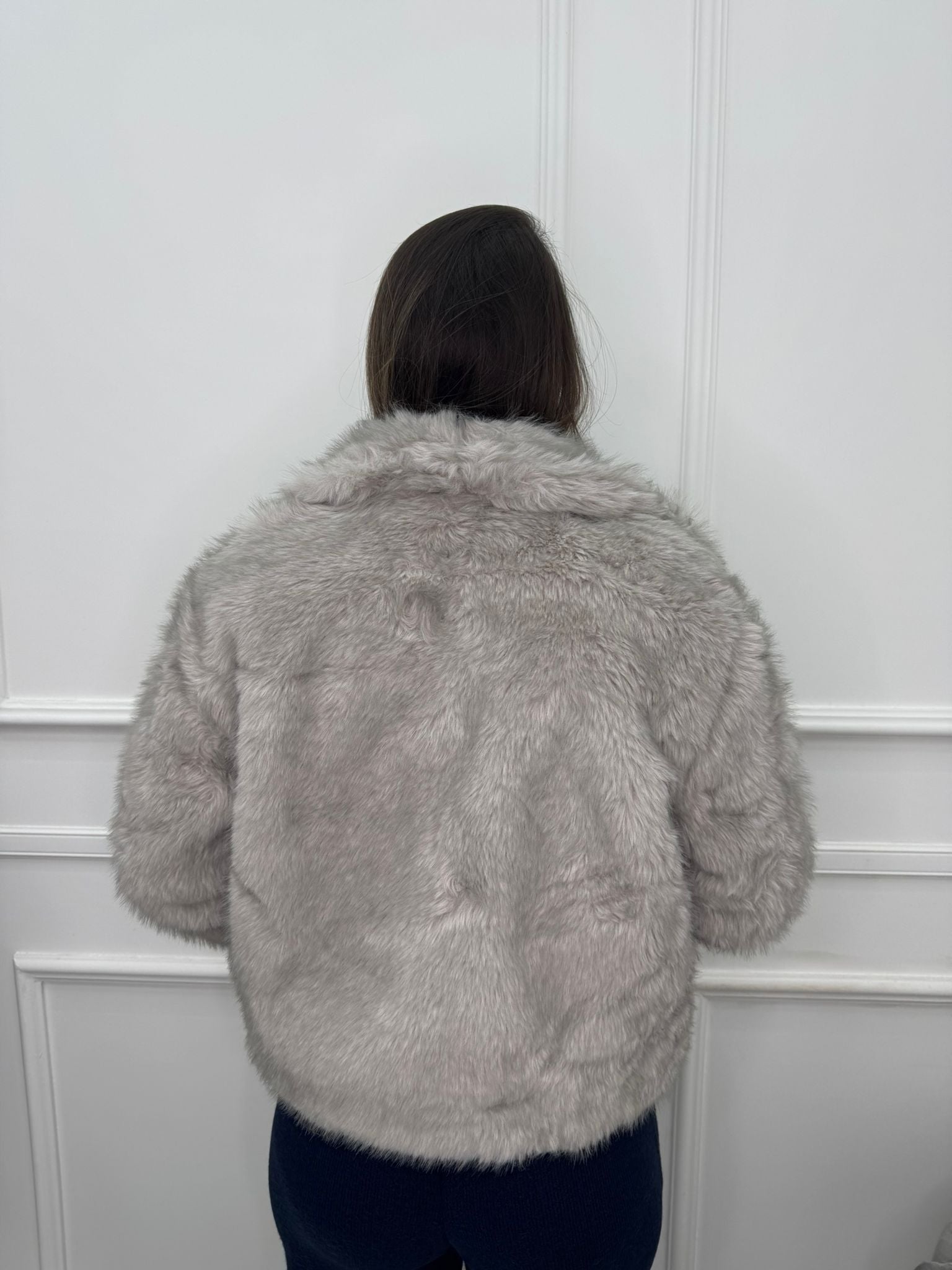 Pelliccia eco grigia con collo ampio