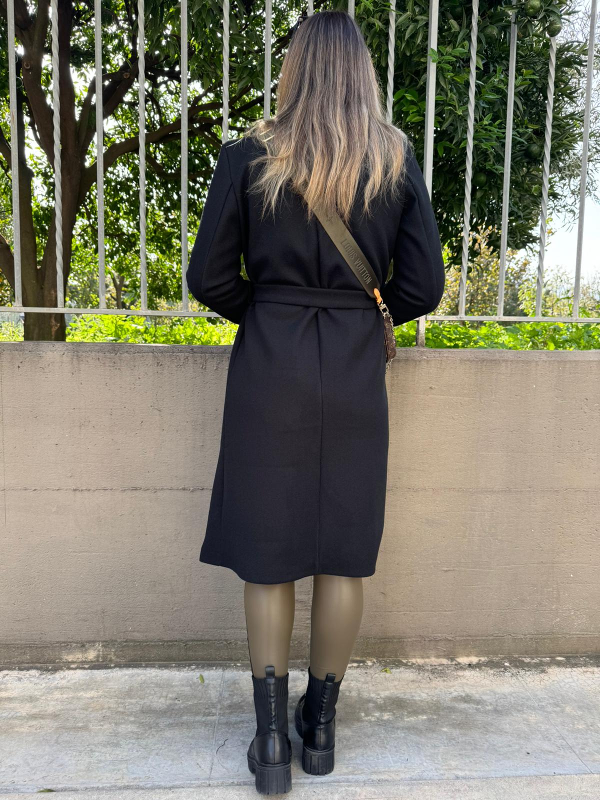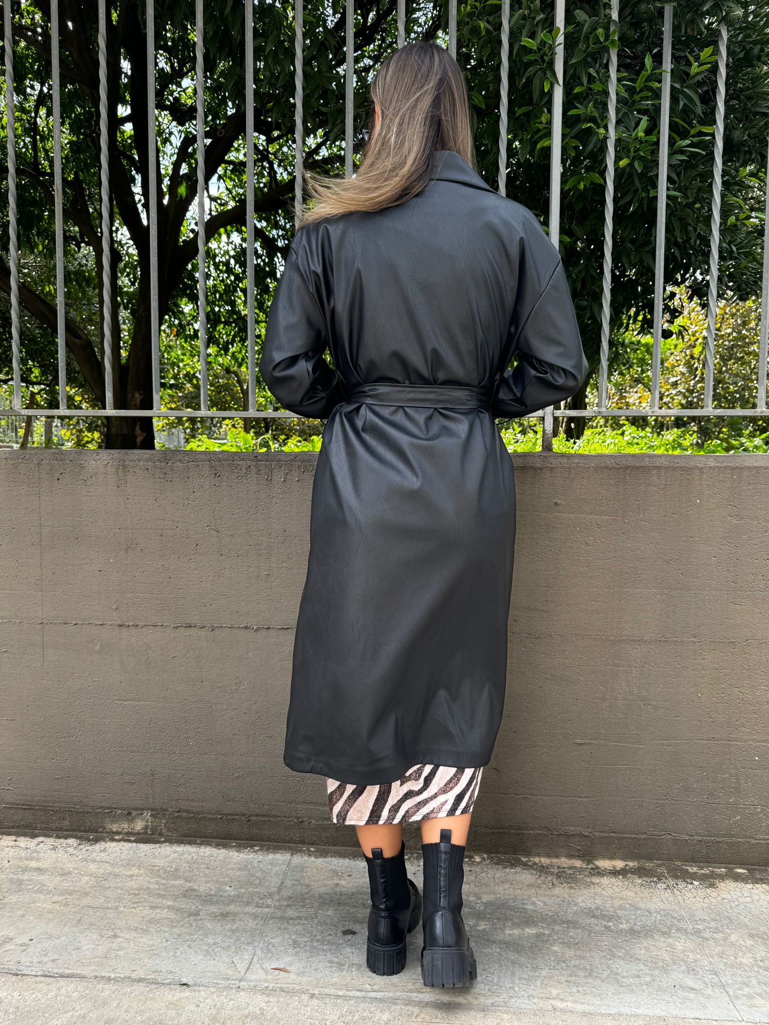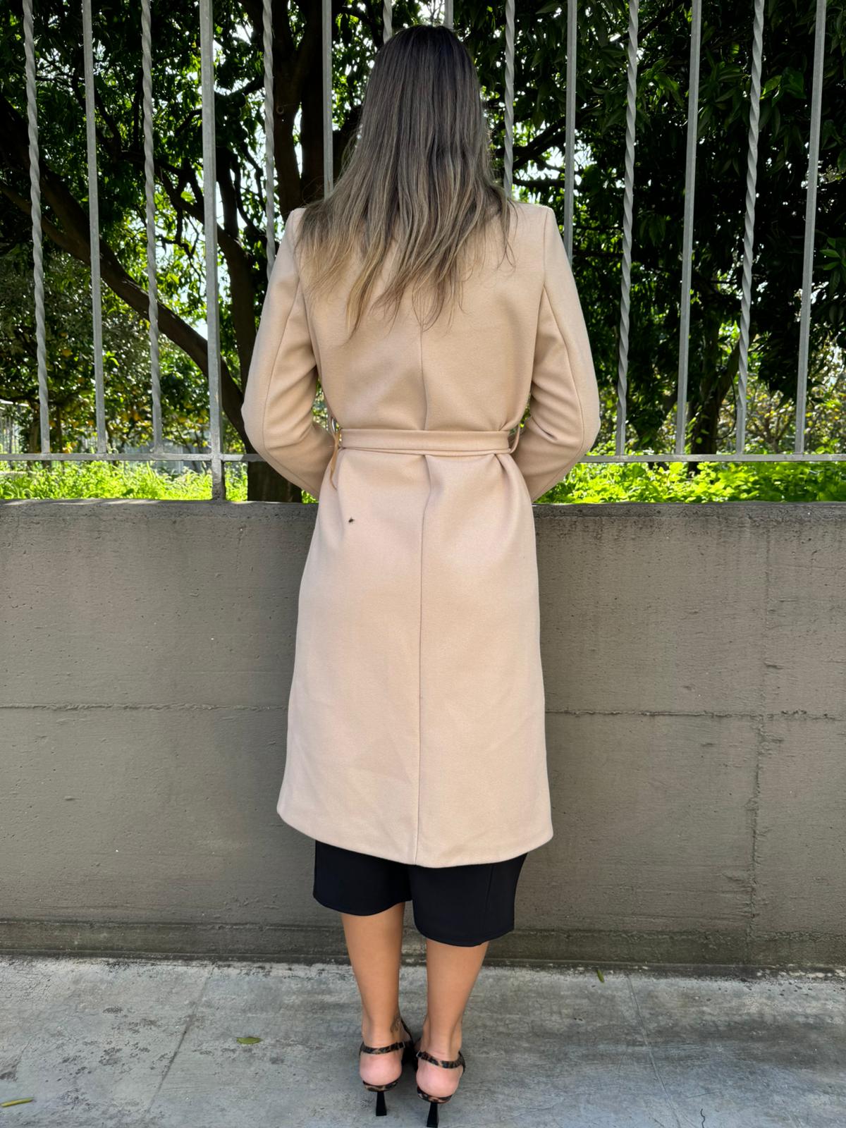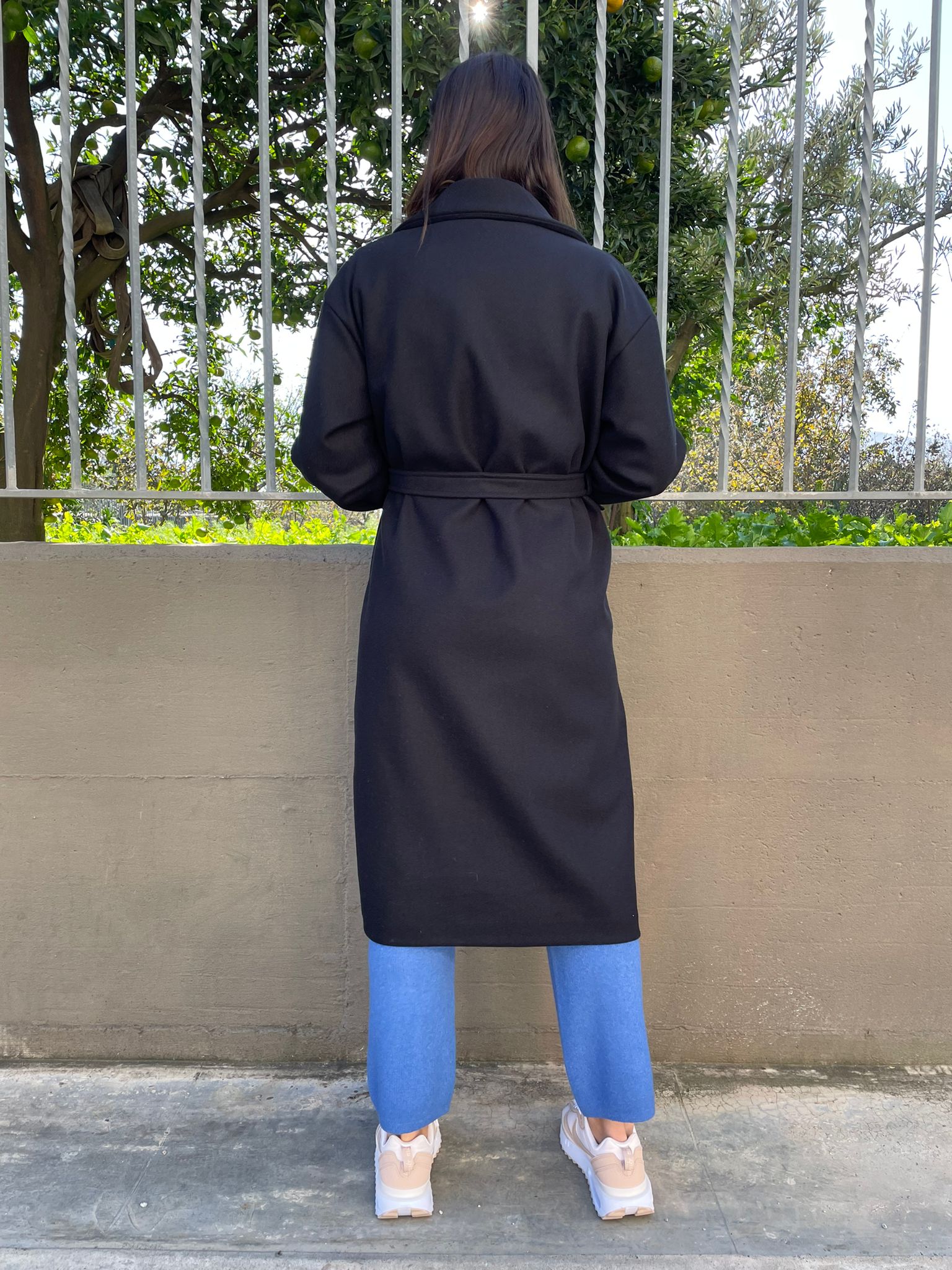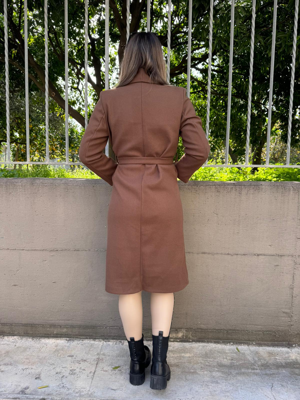 Cappotto doppio petto con cintura e fibbie eco pelle