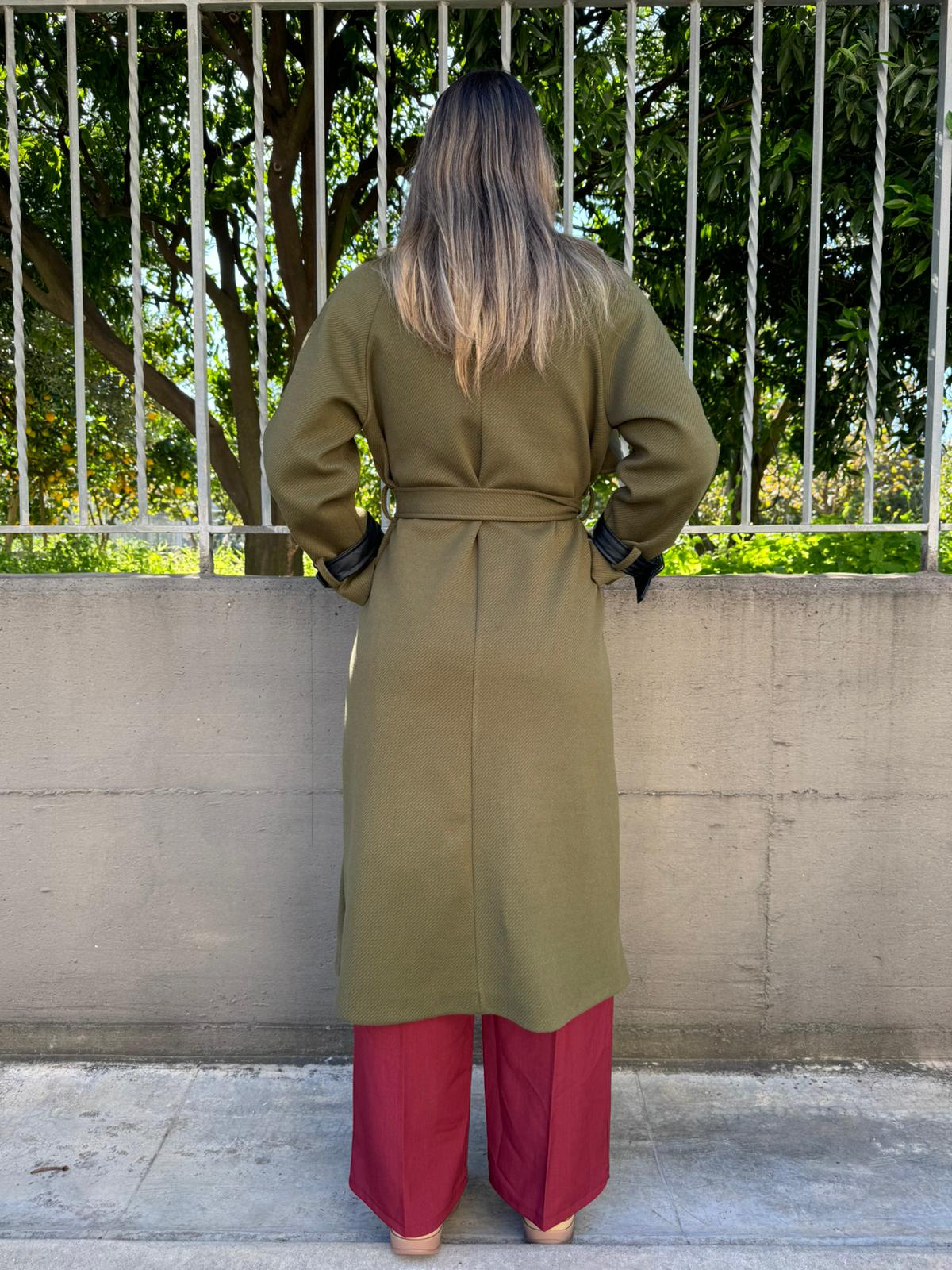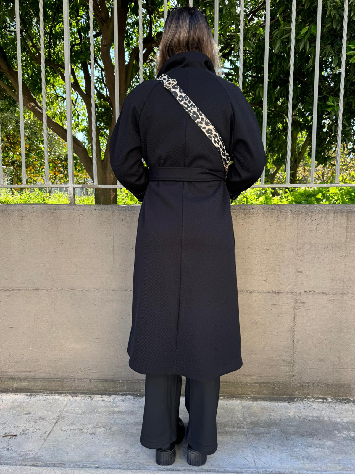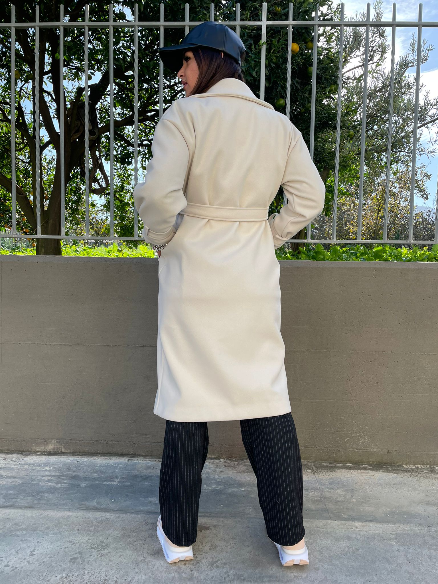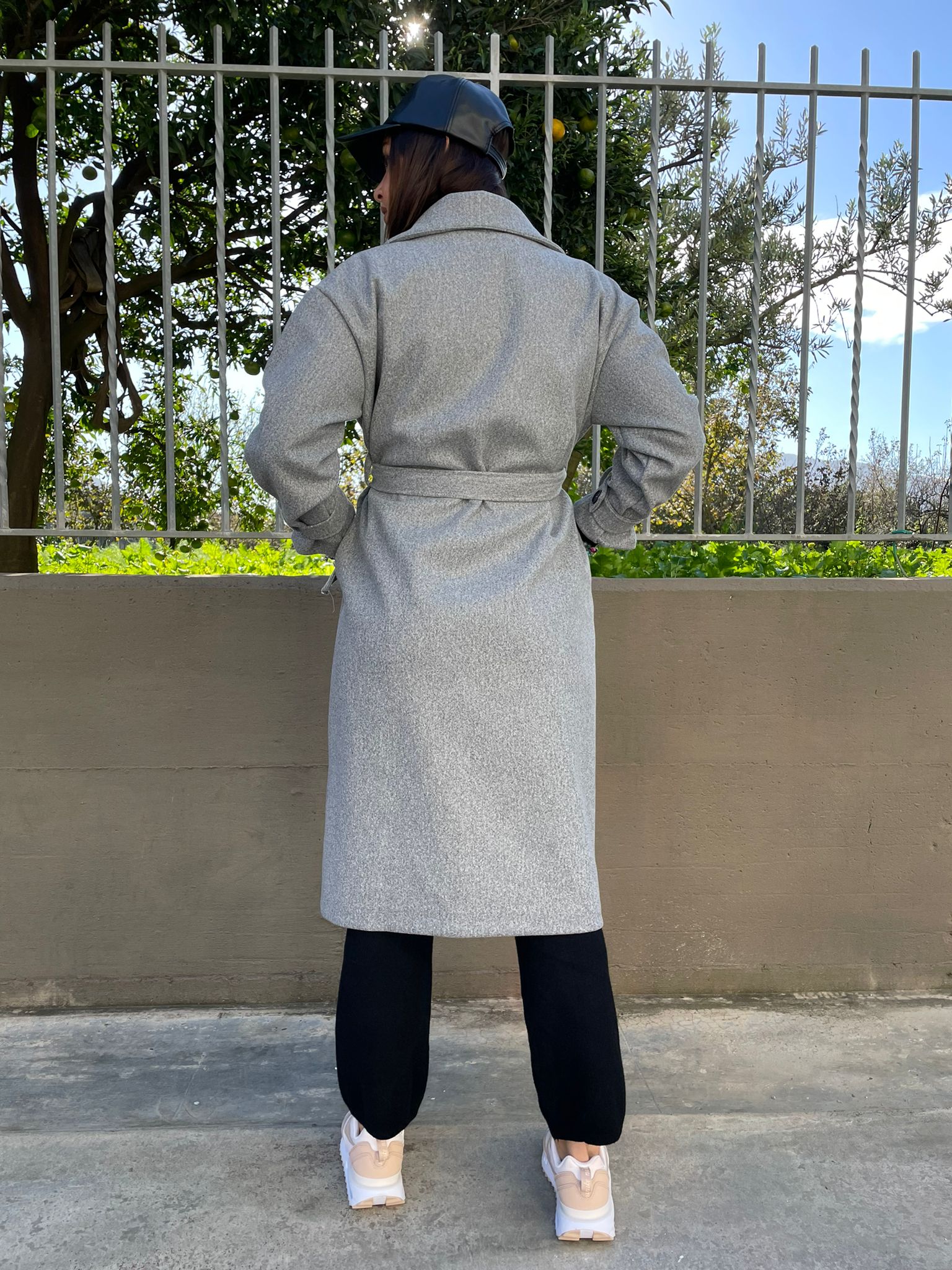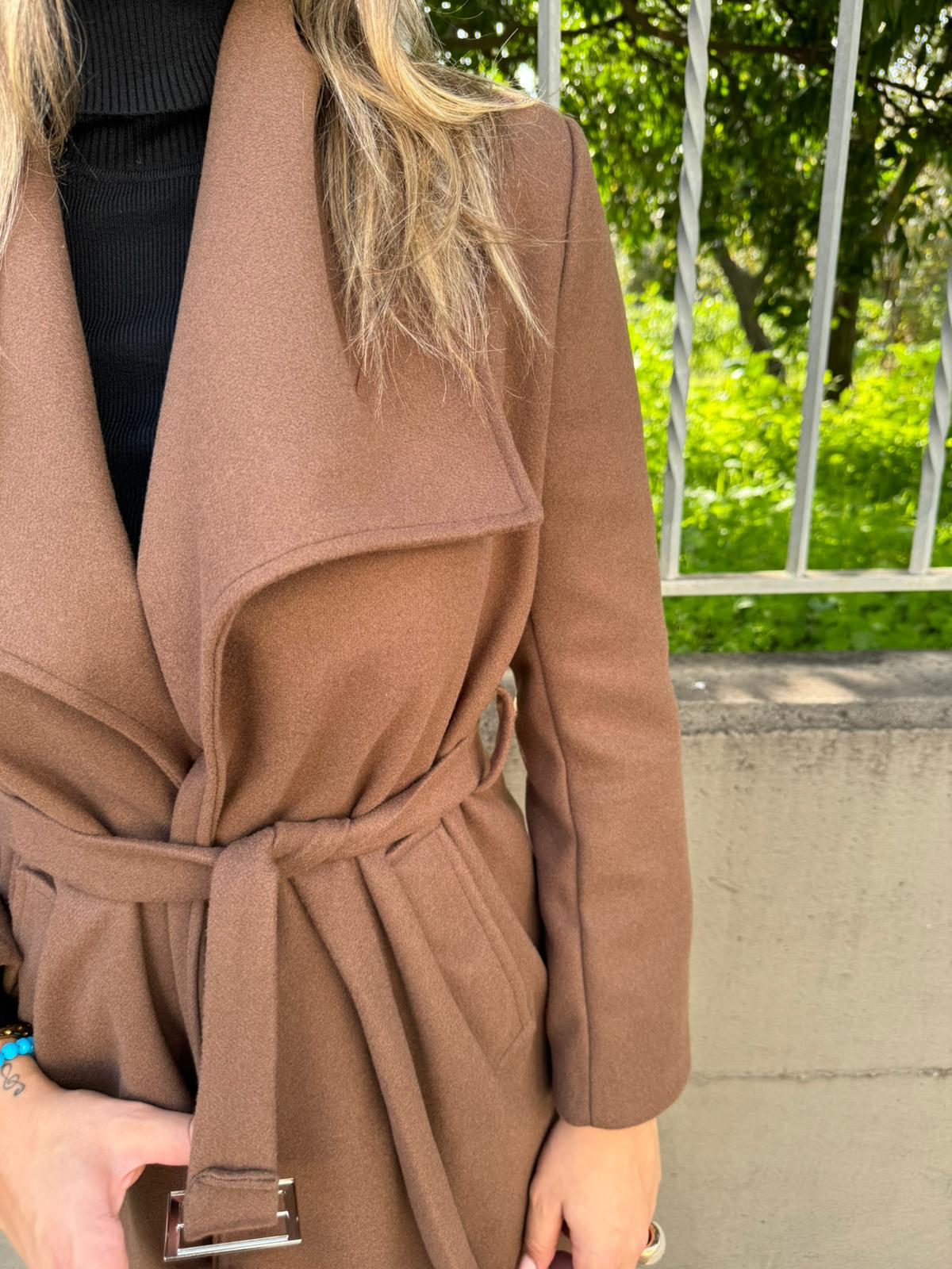 Cappotto doppio petto con cintura e fibbie eco pelle