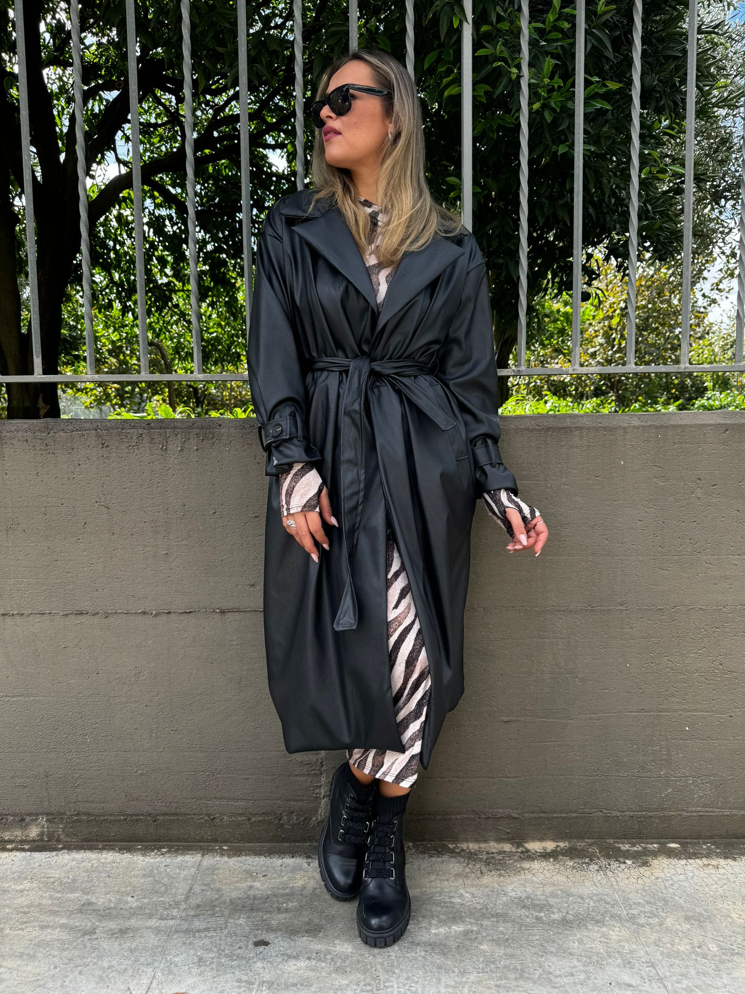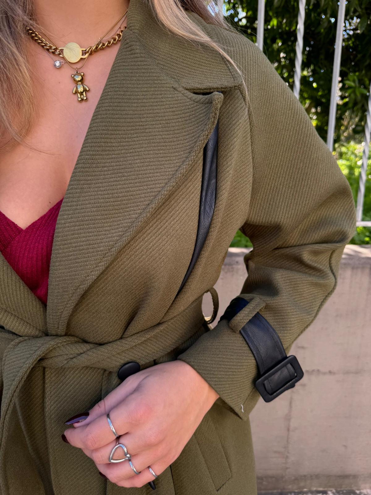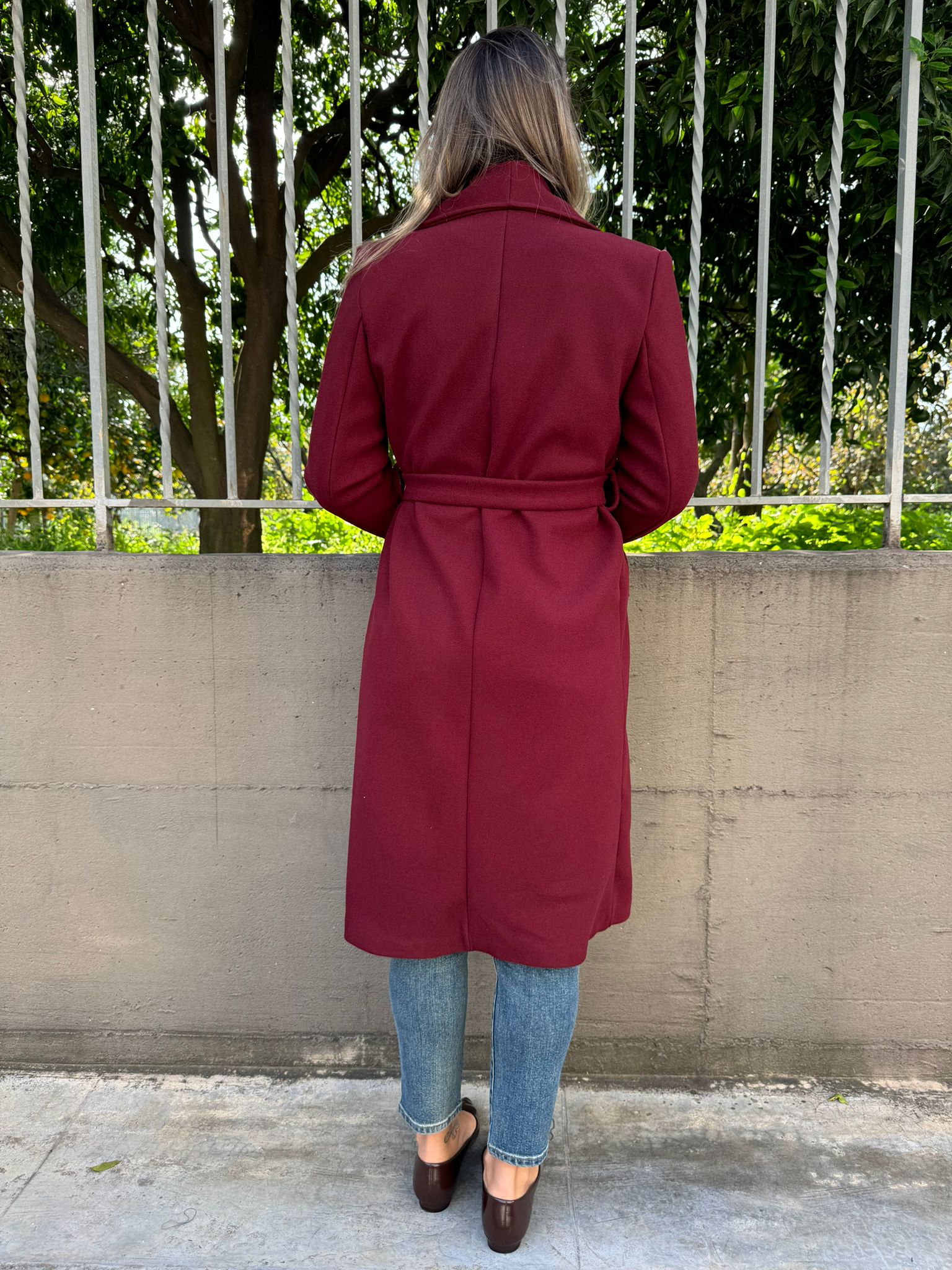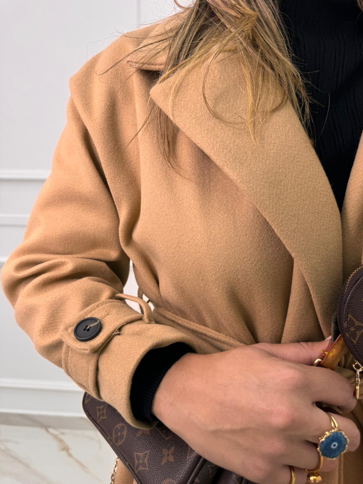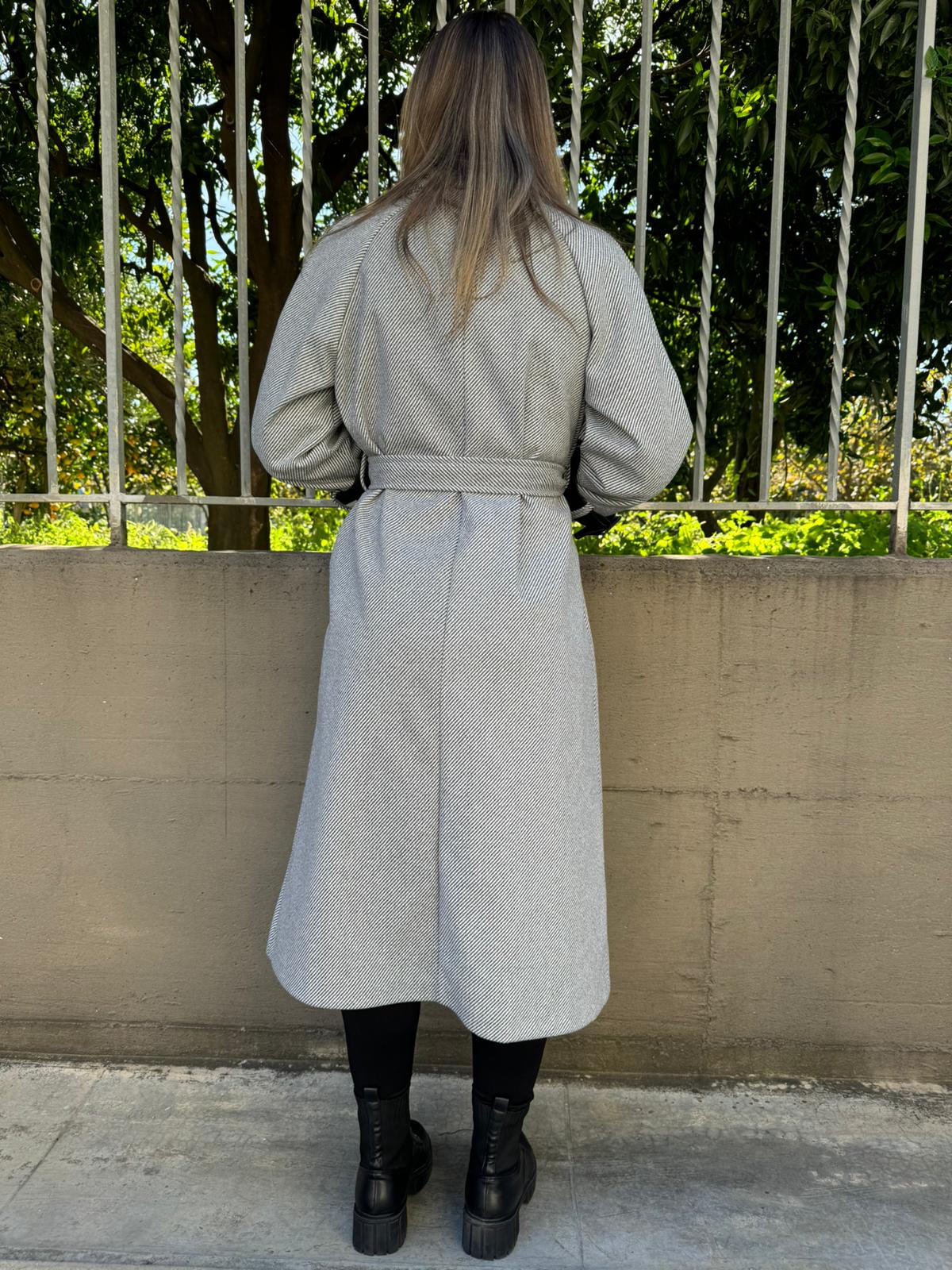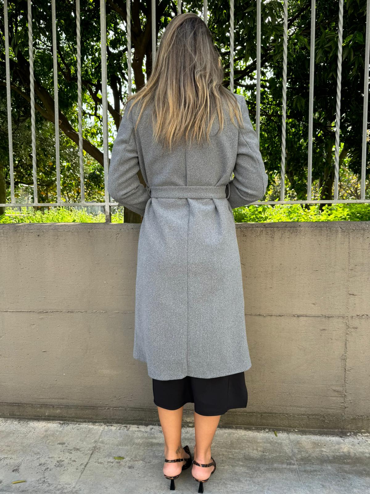 Cappotto doppio petto con cintura e fibbie eco pelle