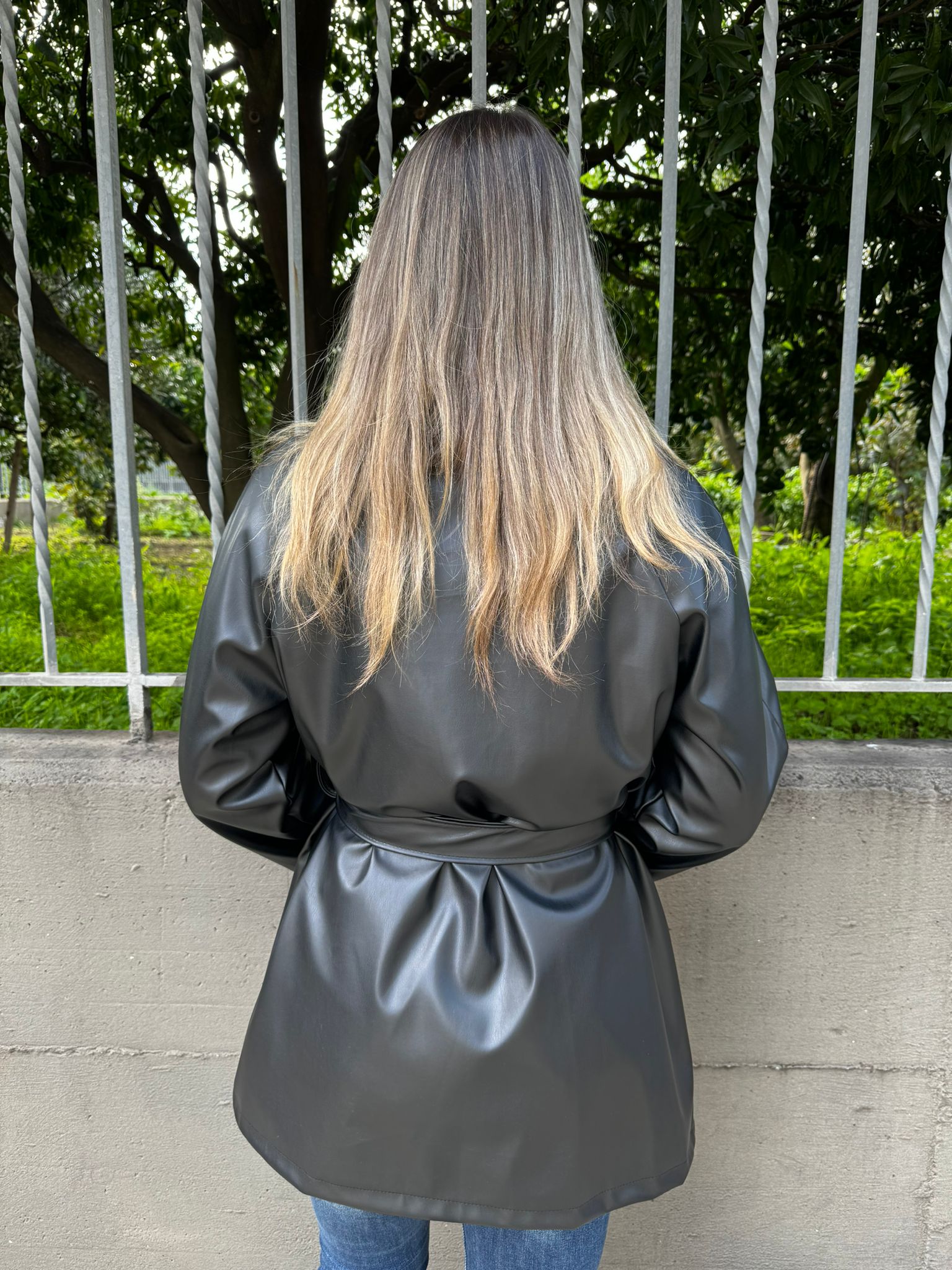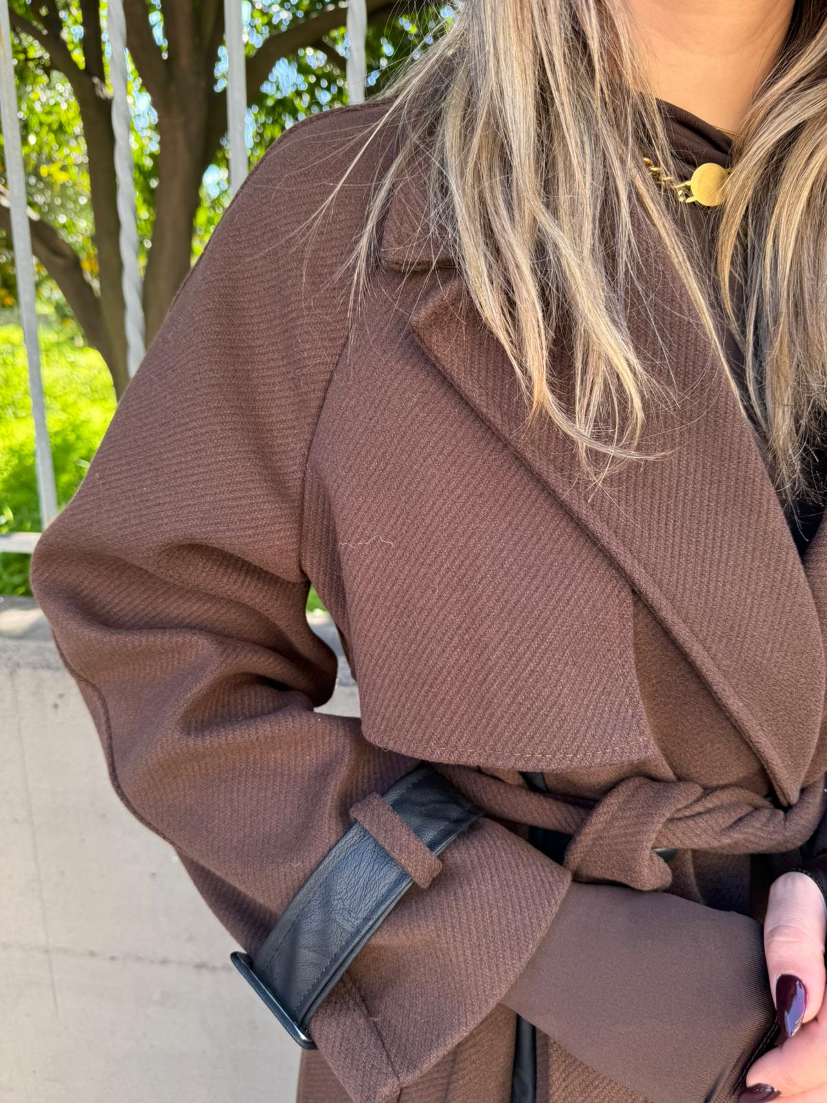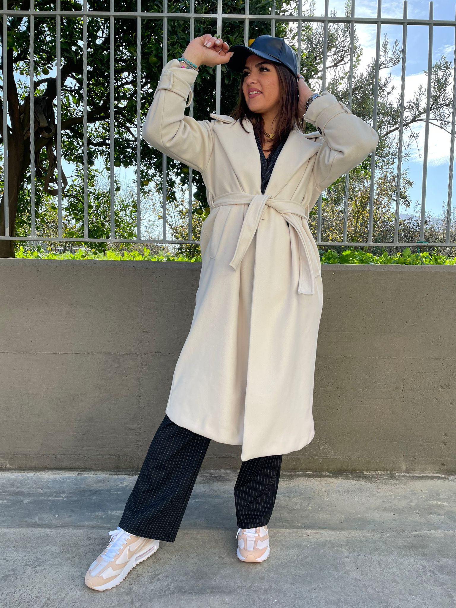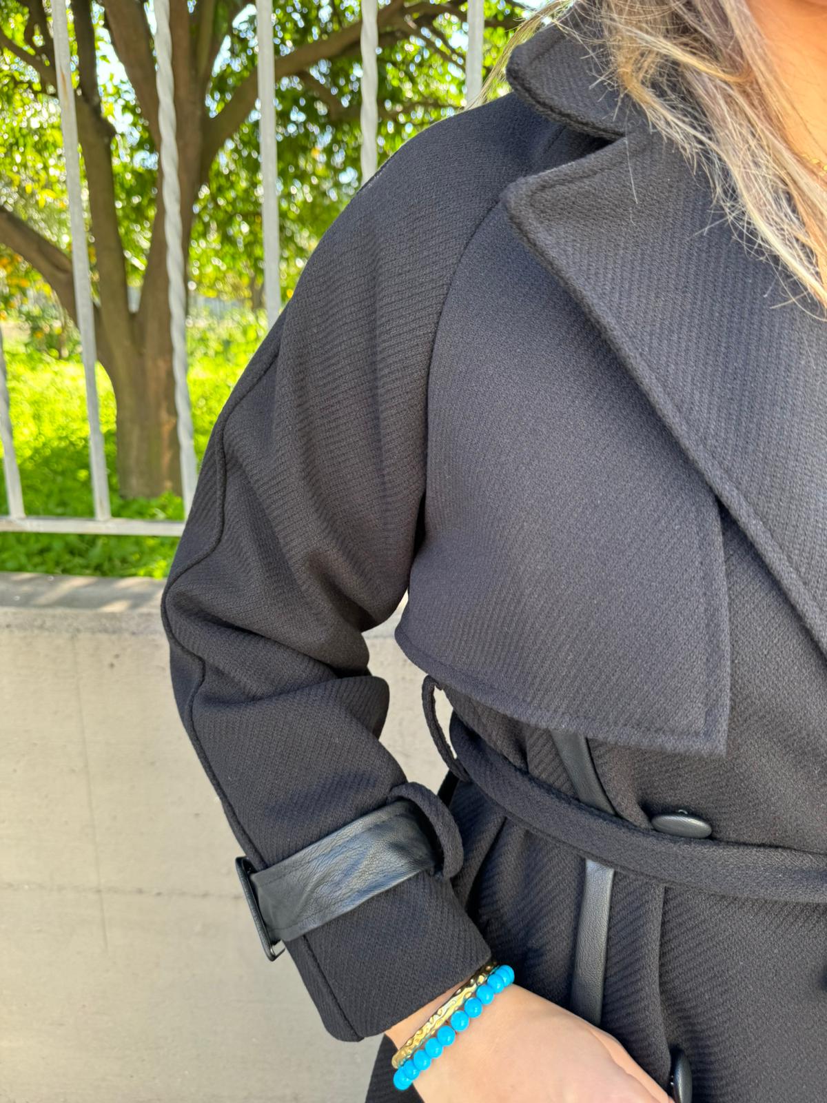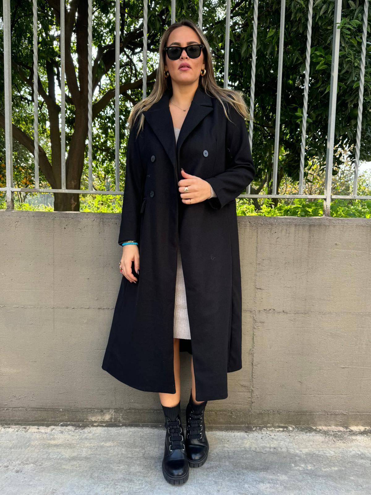 Cappotto doppio petto con cintura e fibbie eco pelle