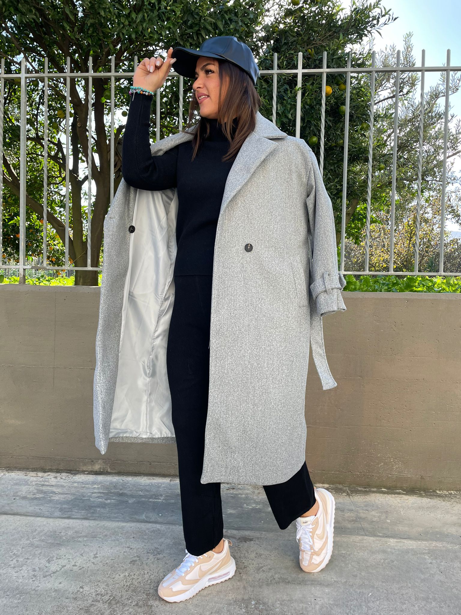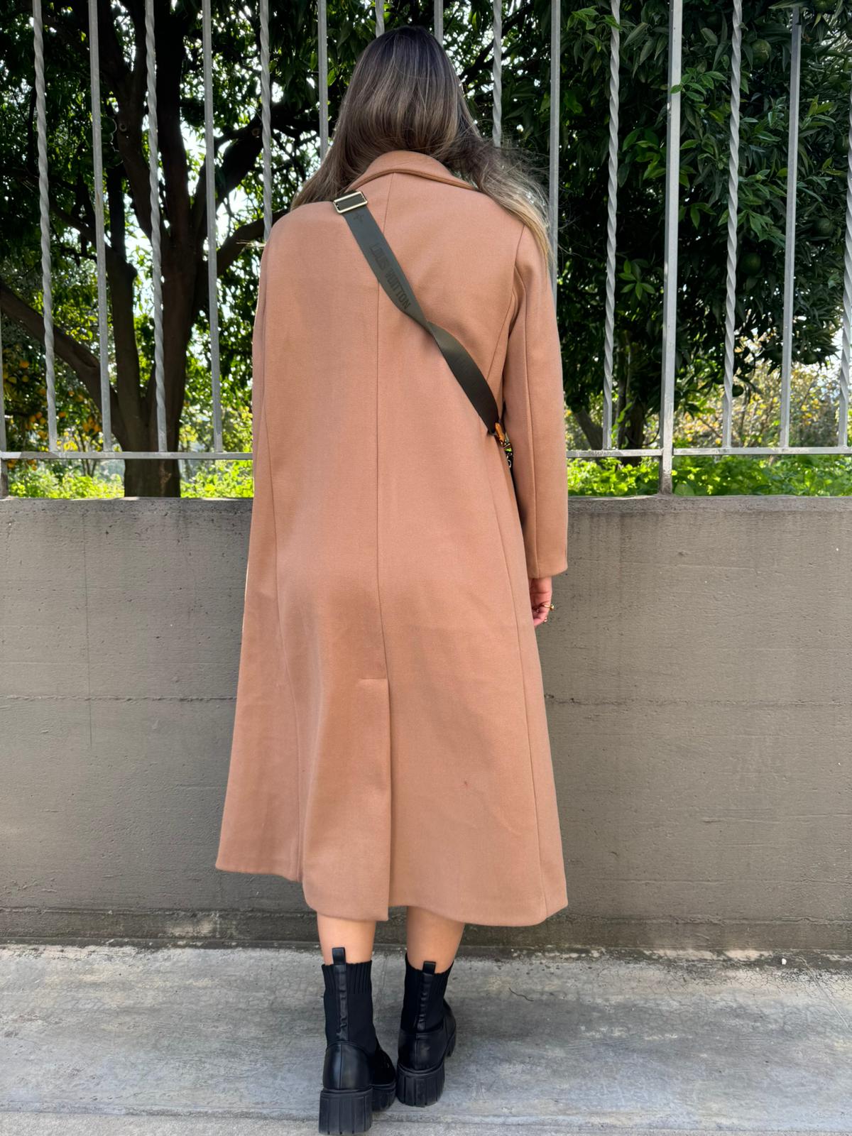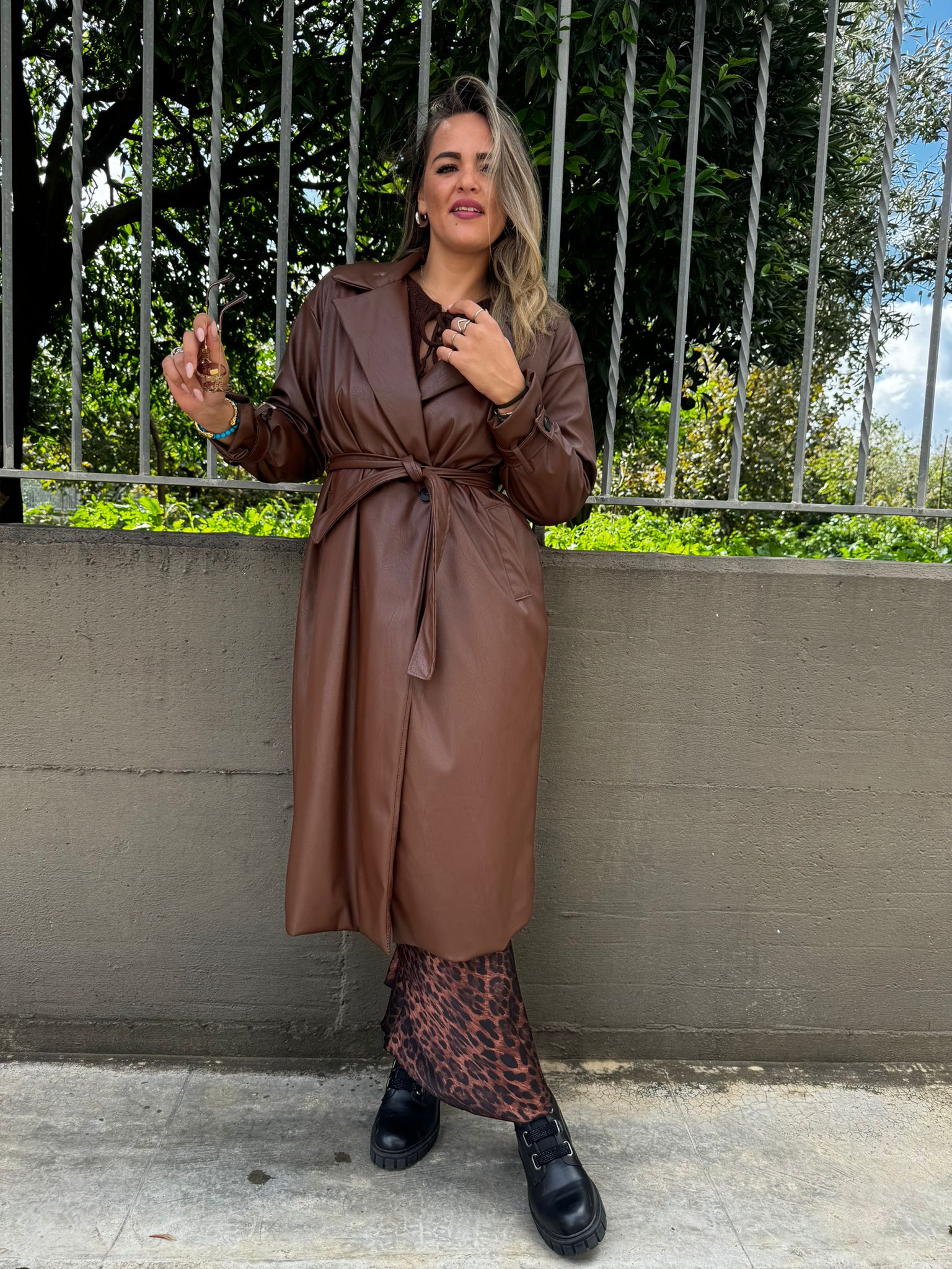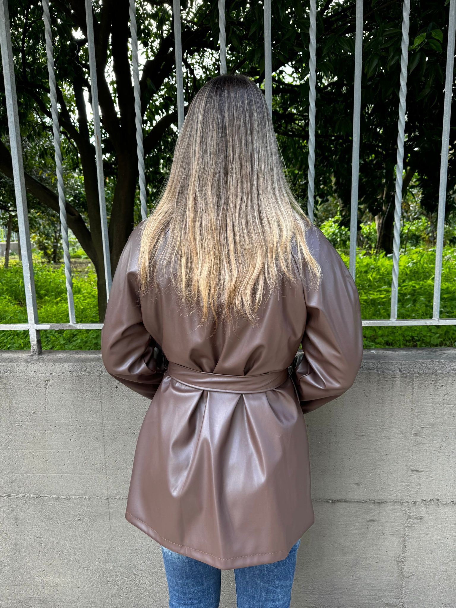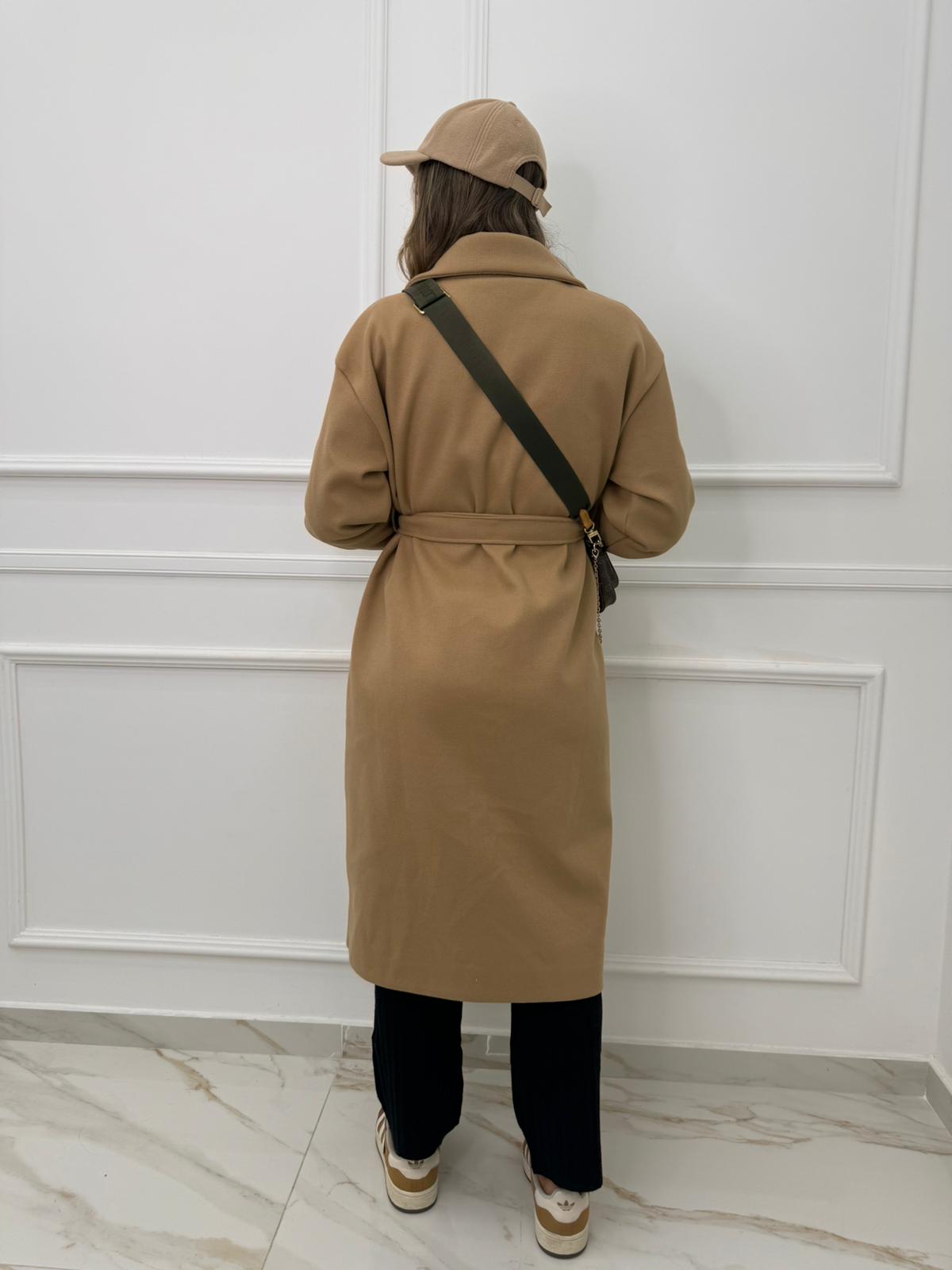 Cappotto doppio petto con cintura e fibbie eco pelle