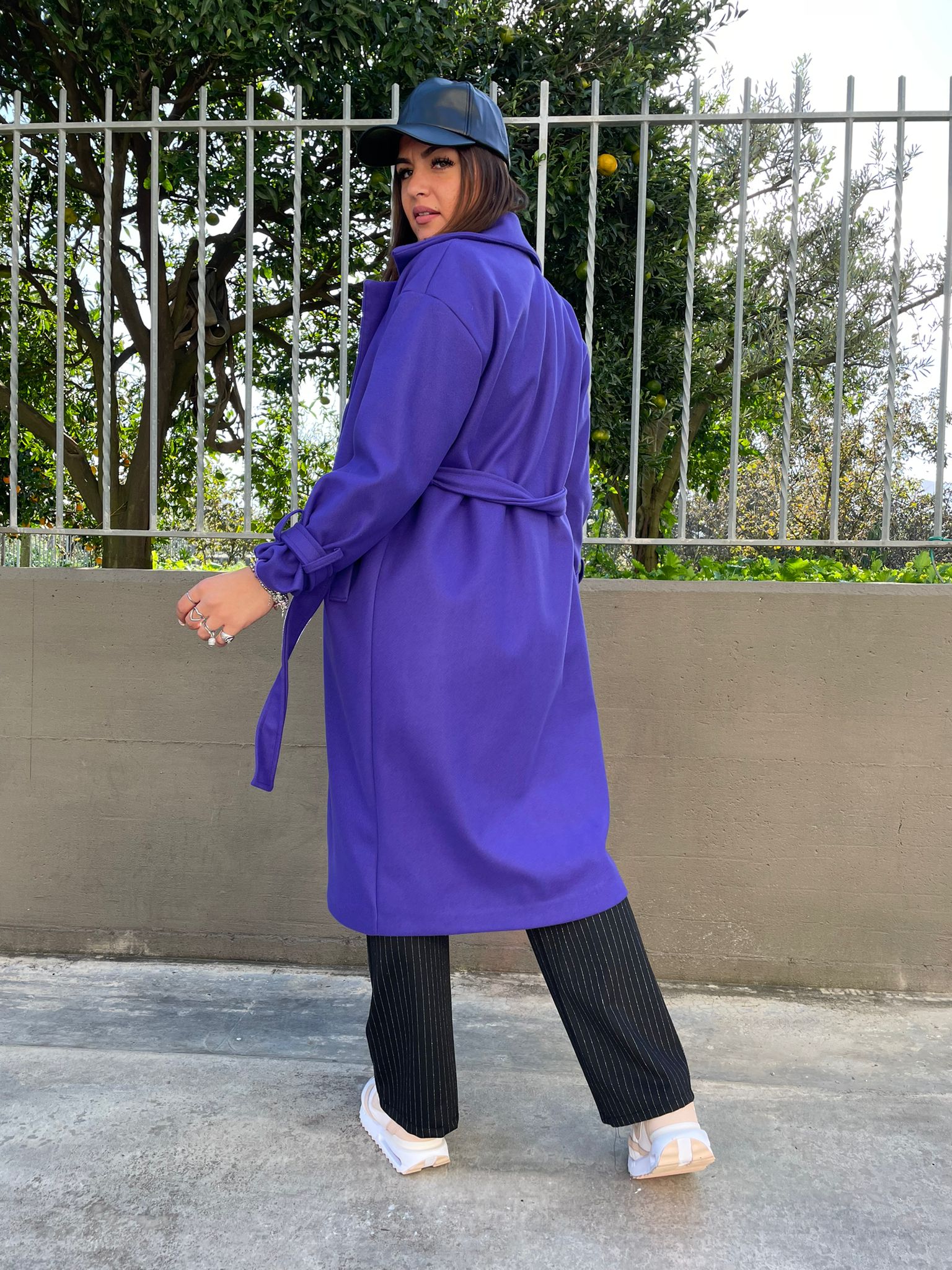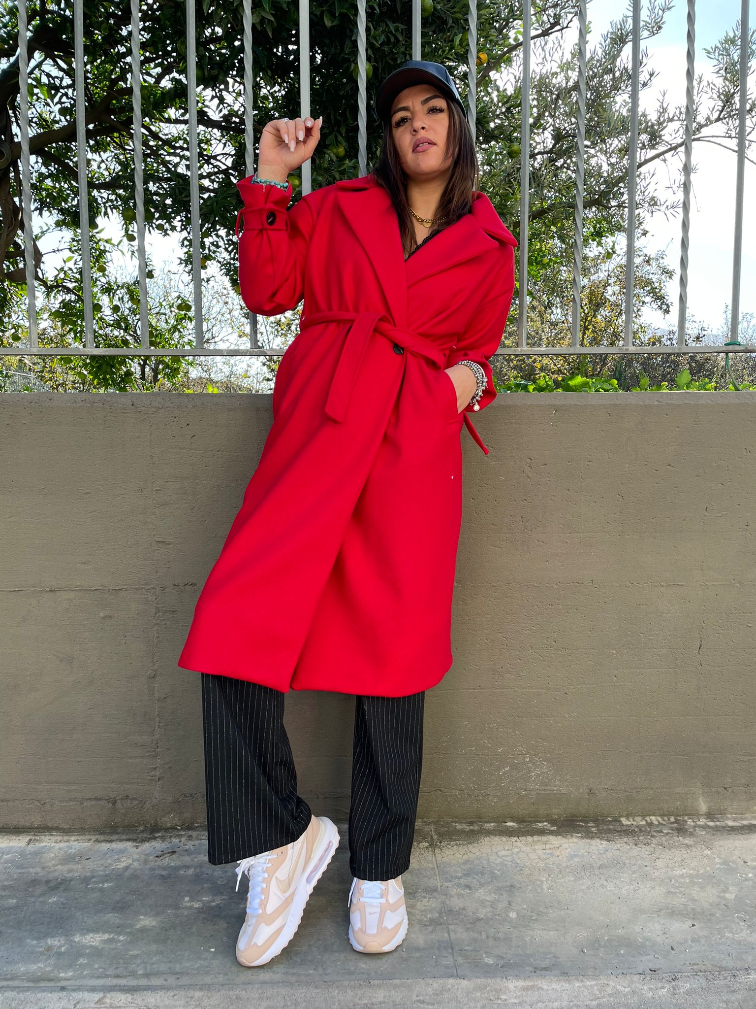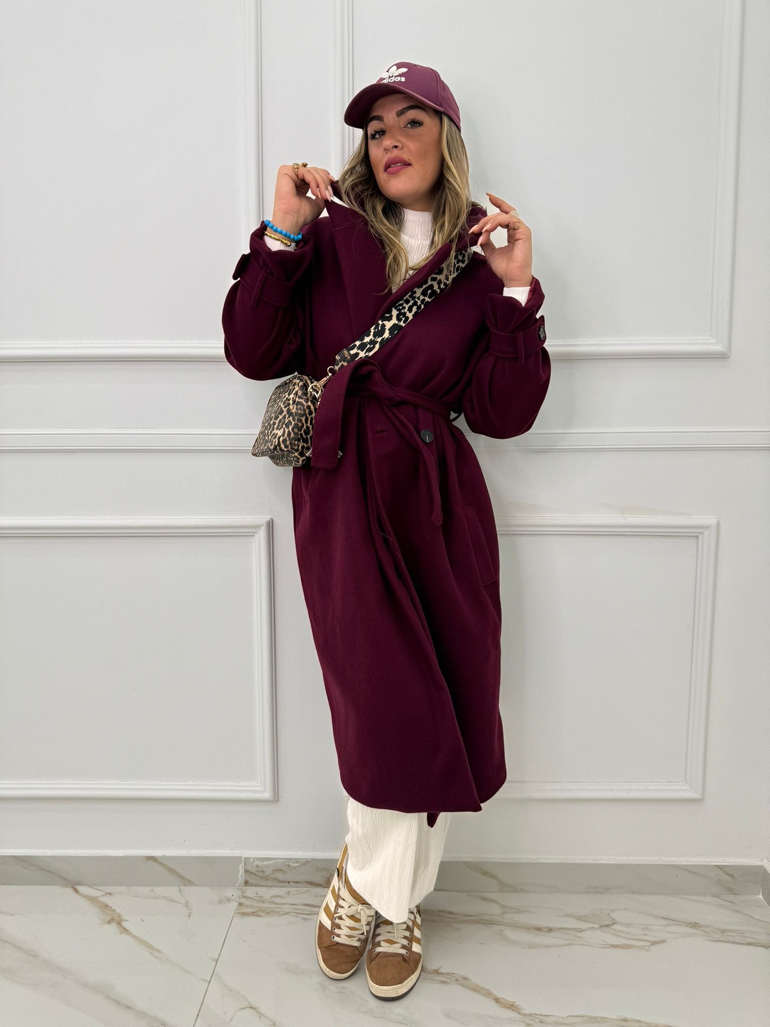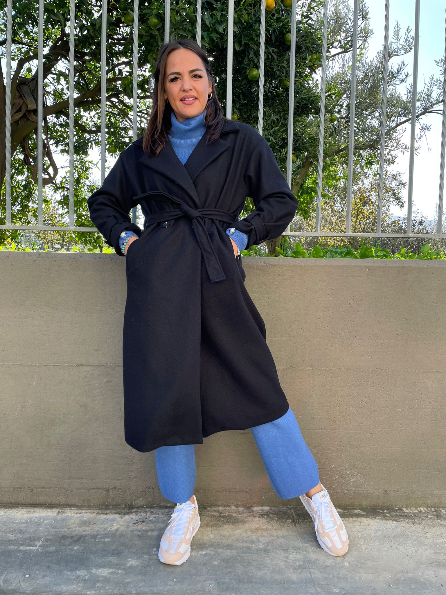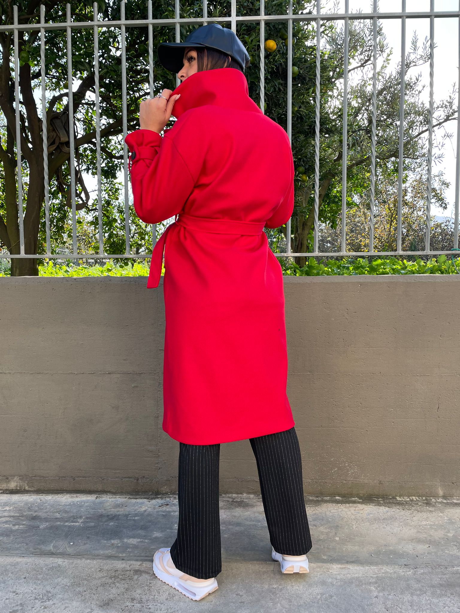Cappotto doppio petto con cintura e fibbie eco pelle