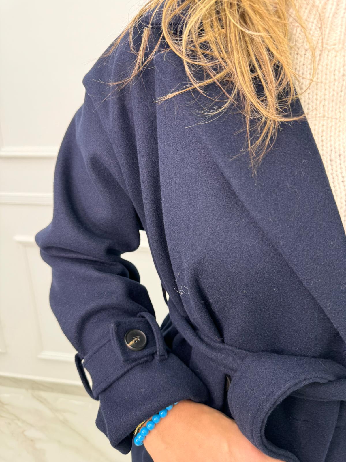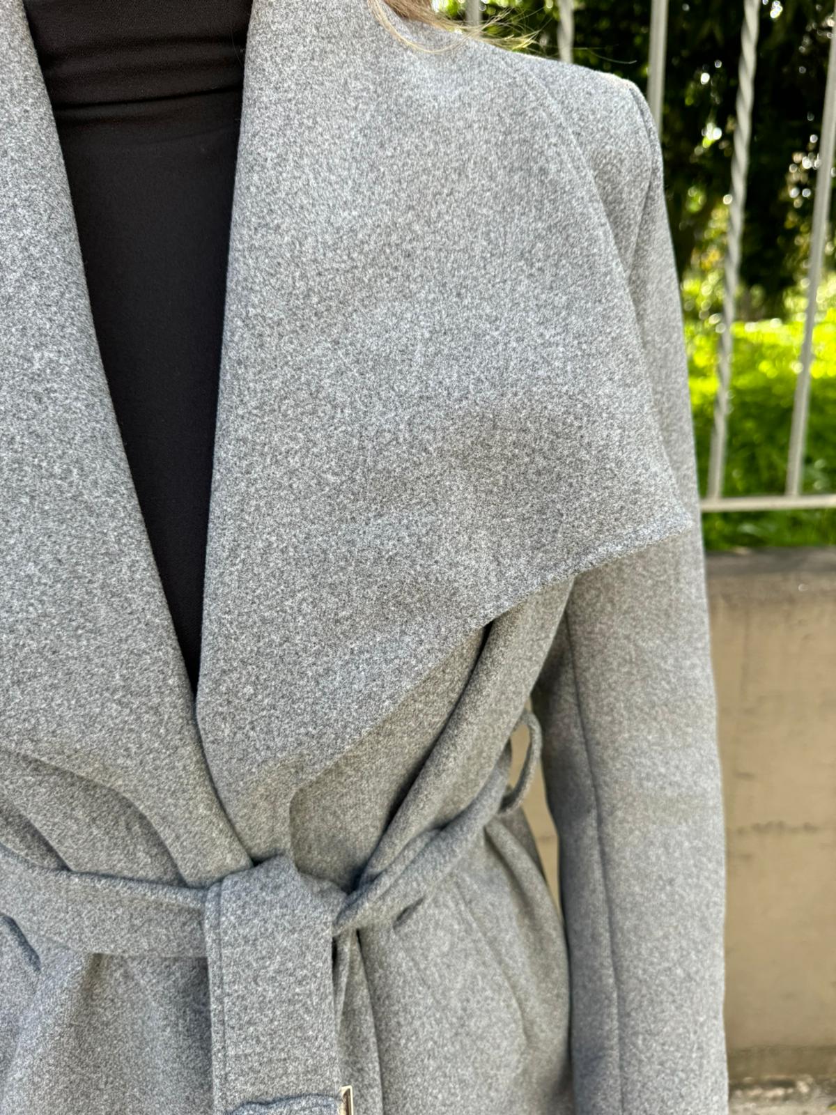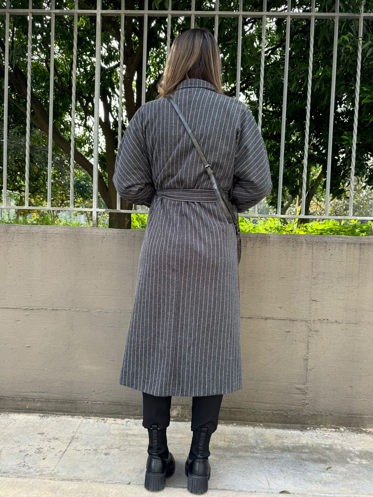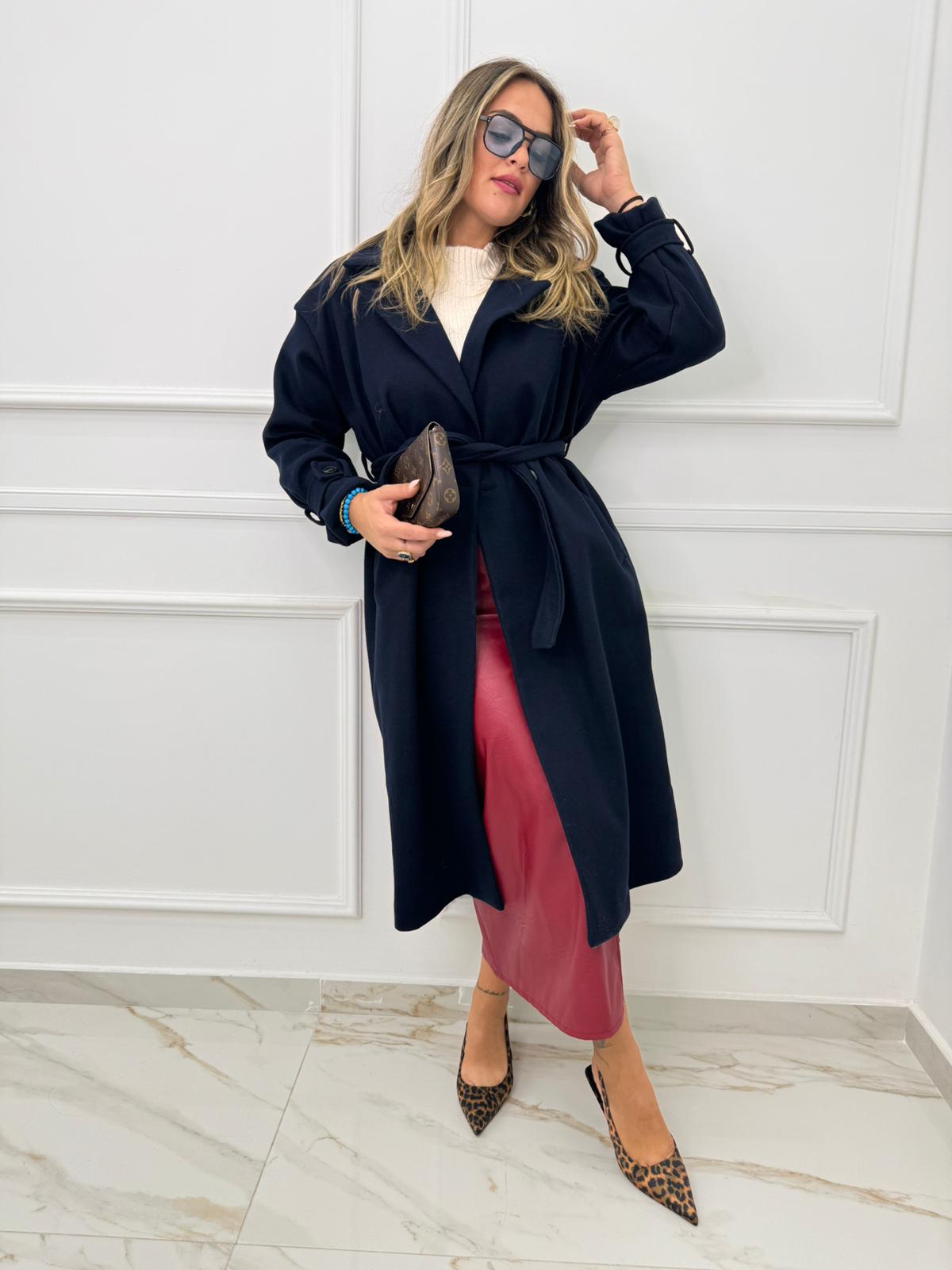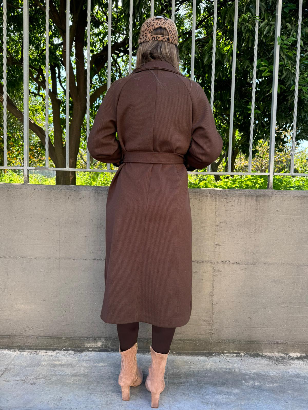 Cappotto doppio petto con cintura e fibbie eco pelle
