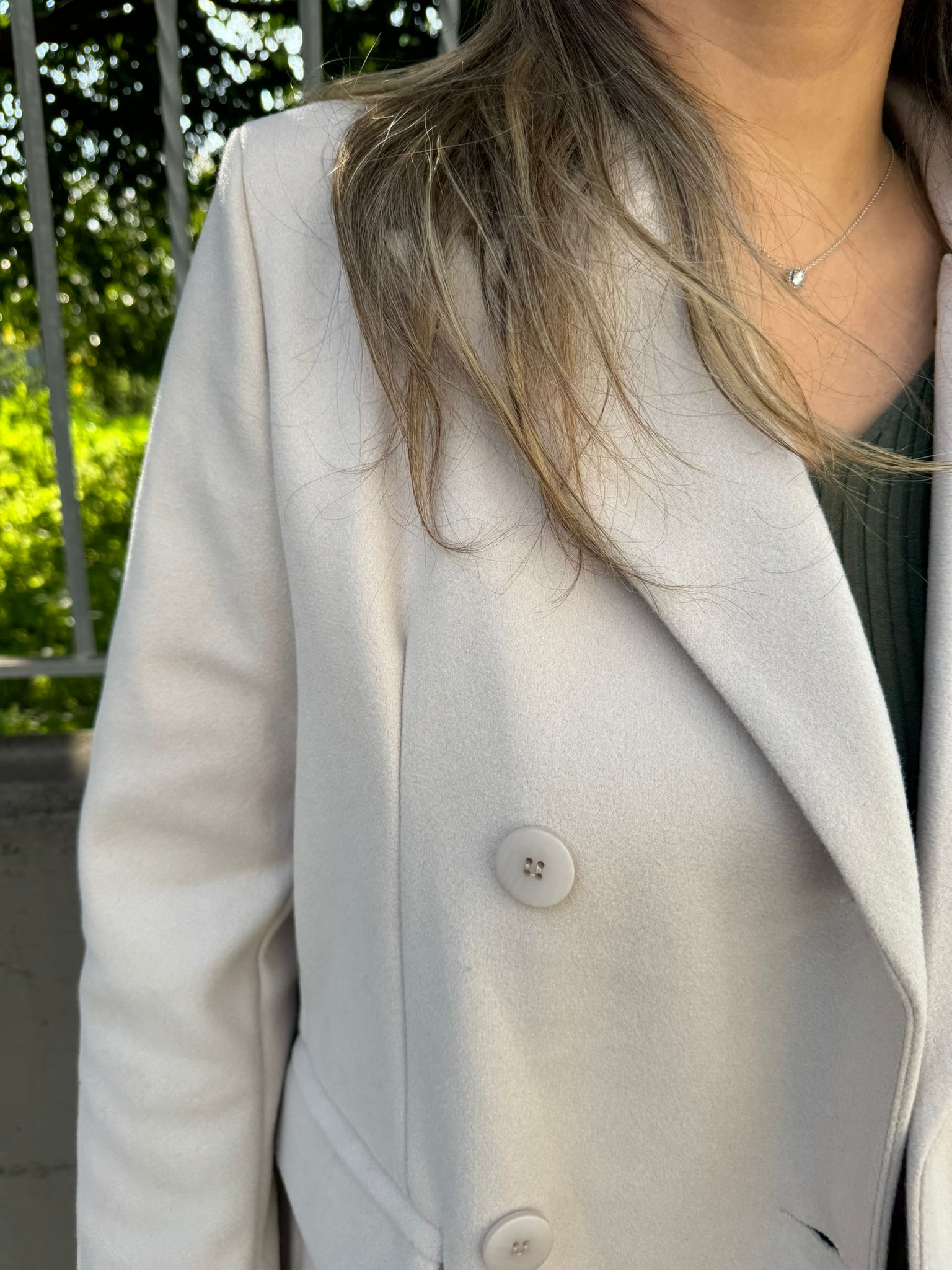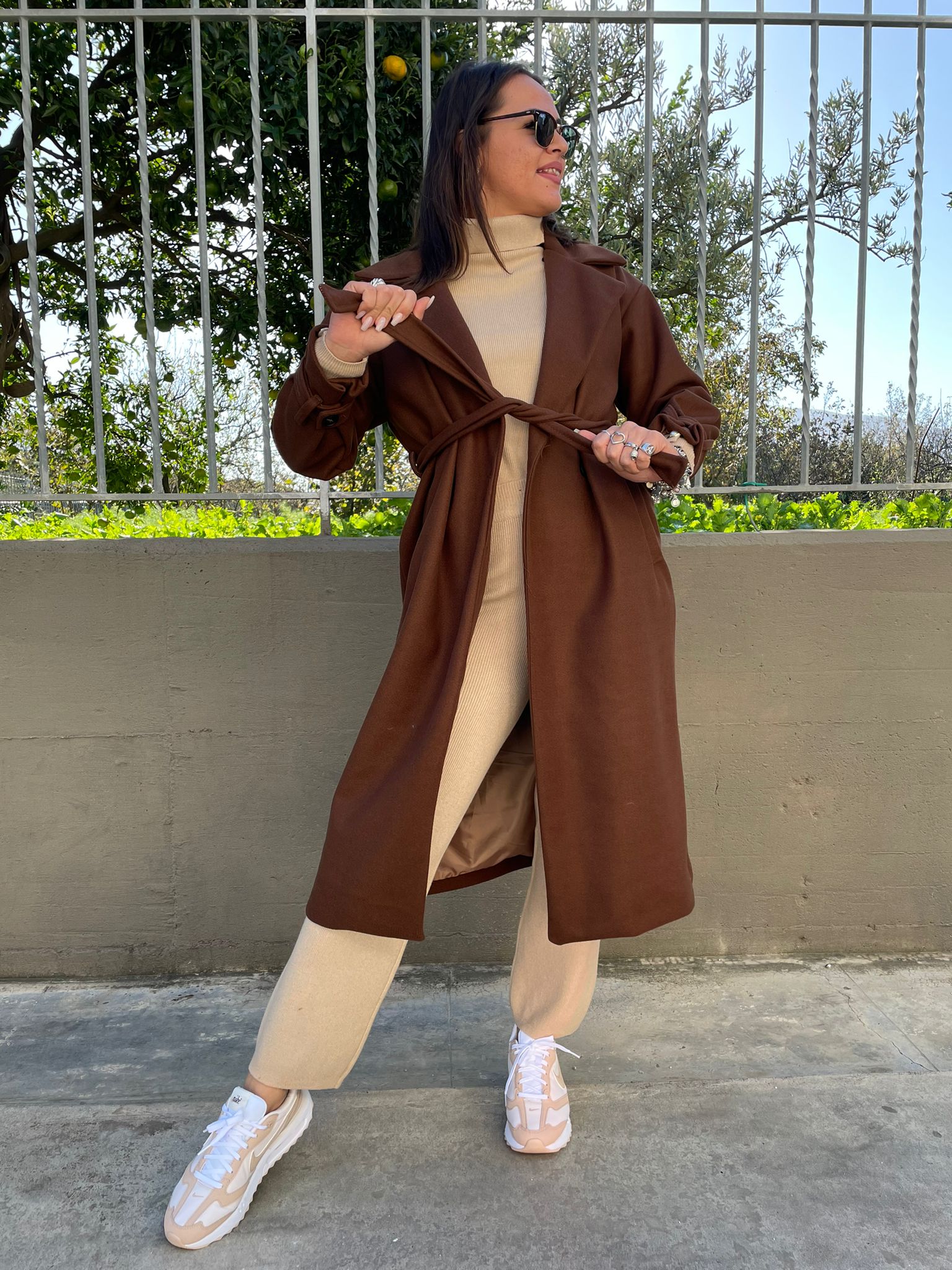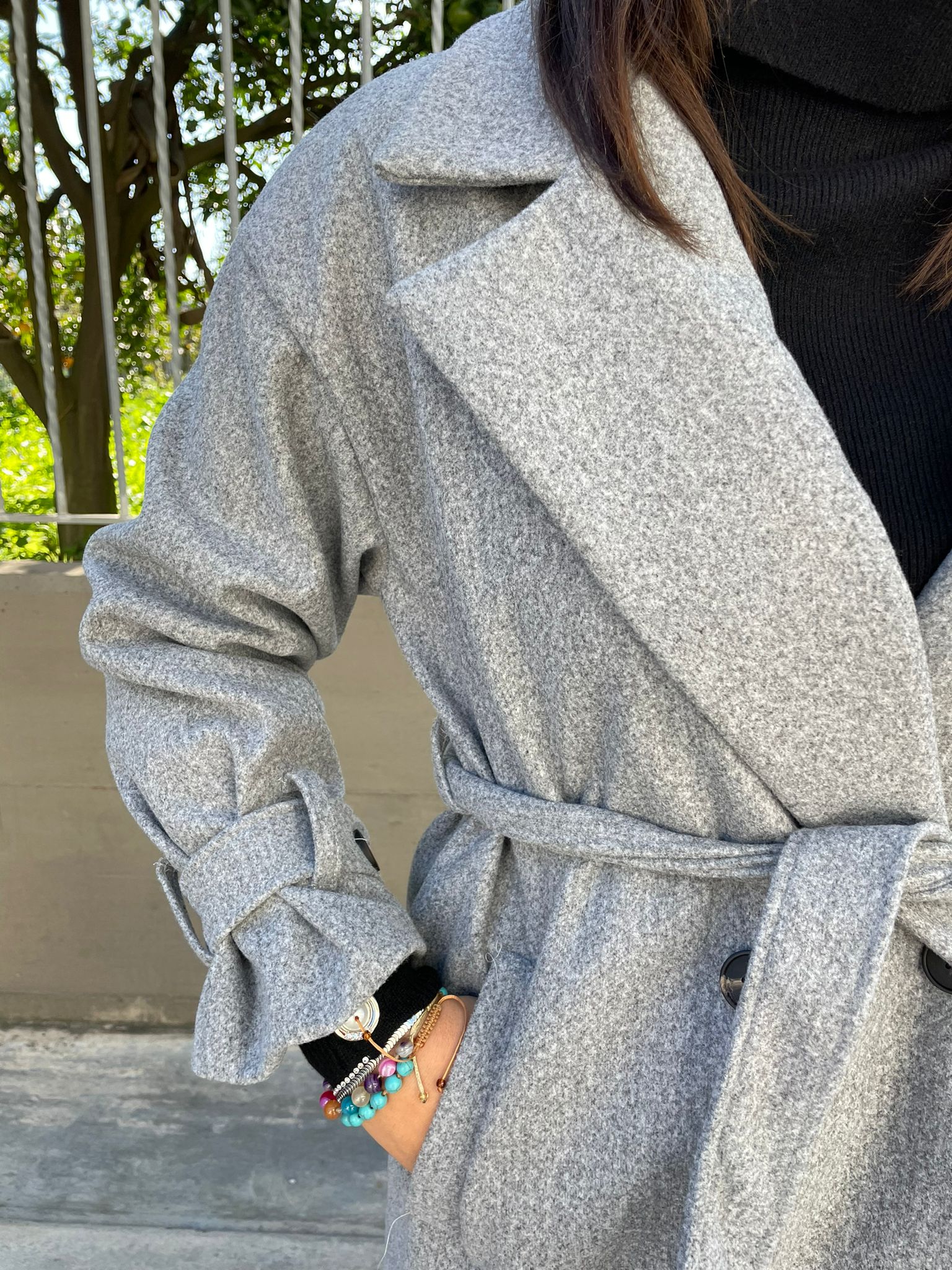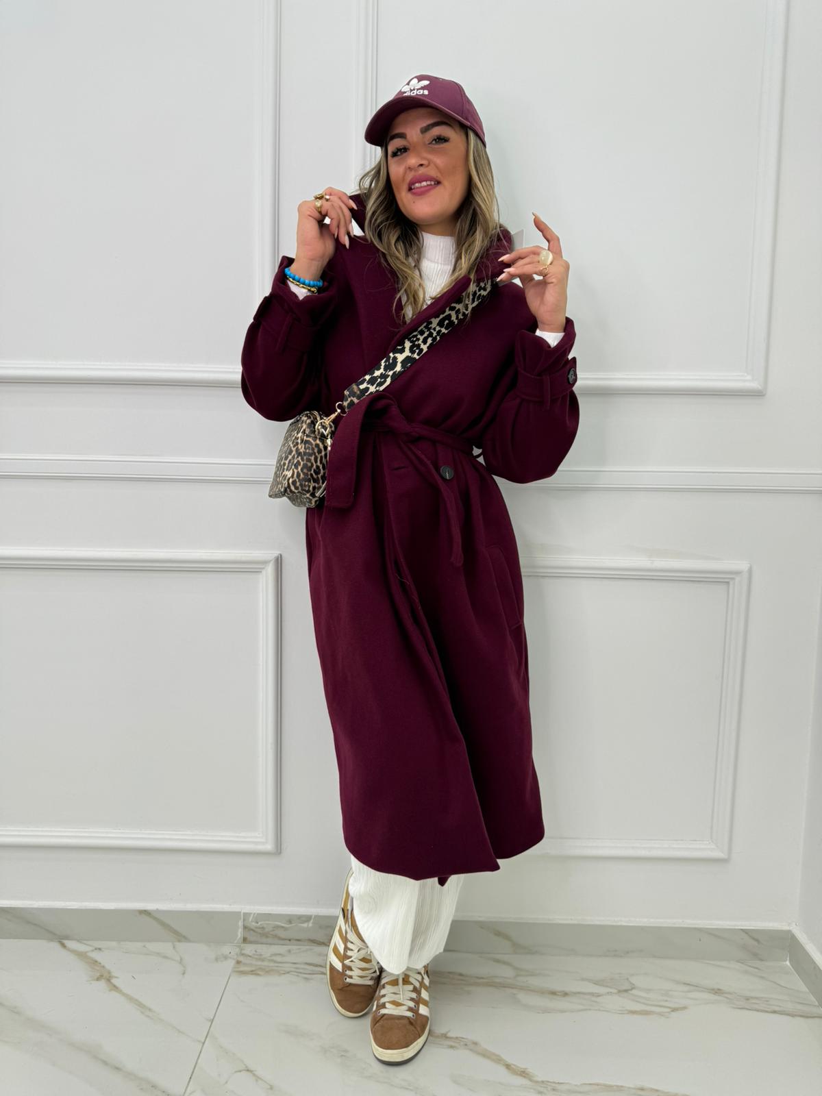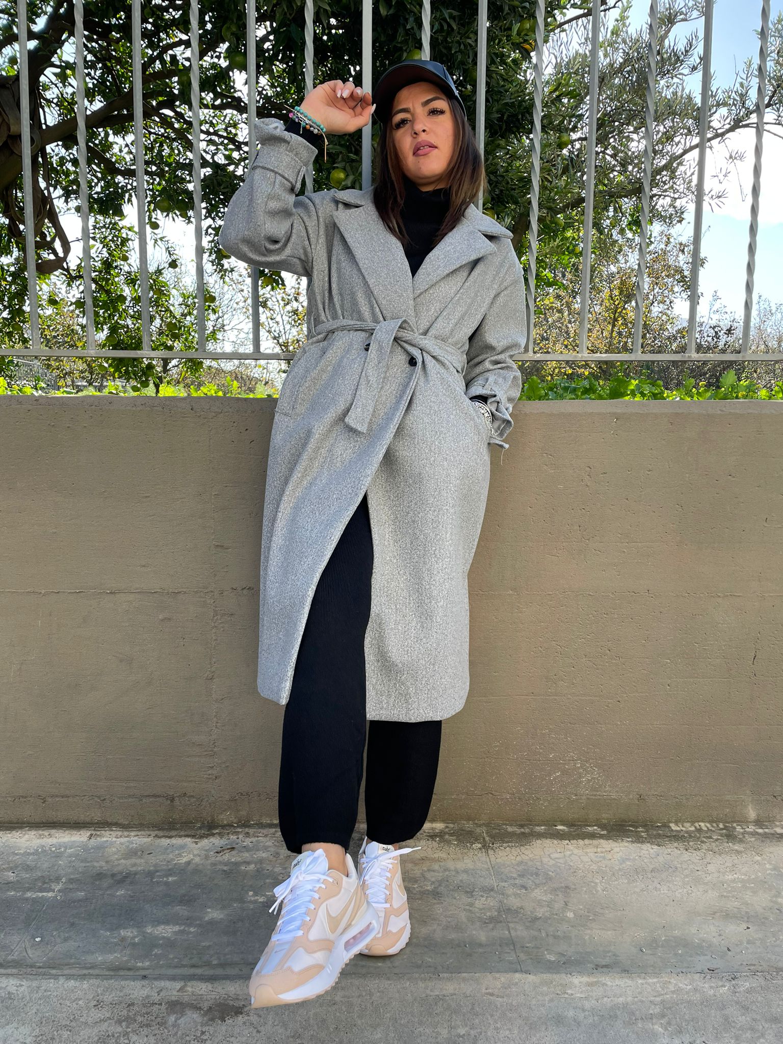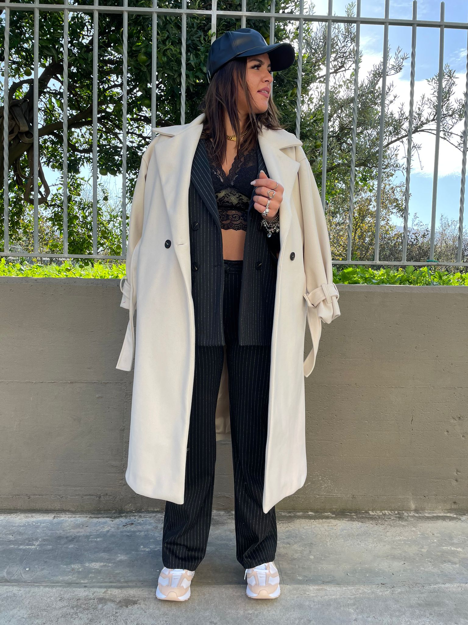 Cappotto doppio petto con cintura e fibbie eco pelle