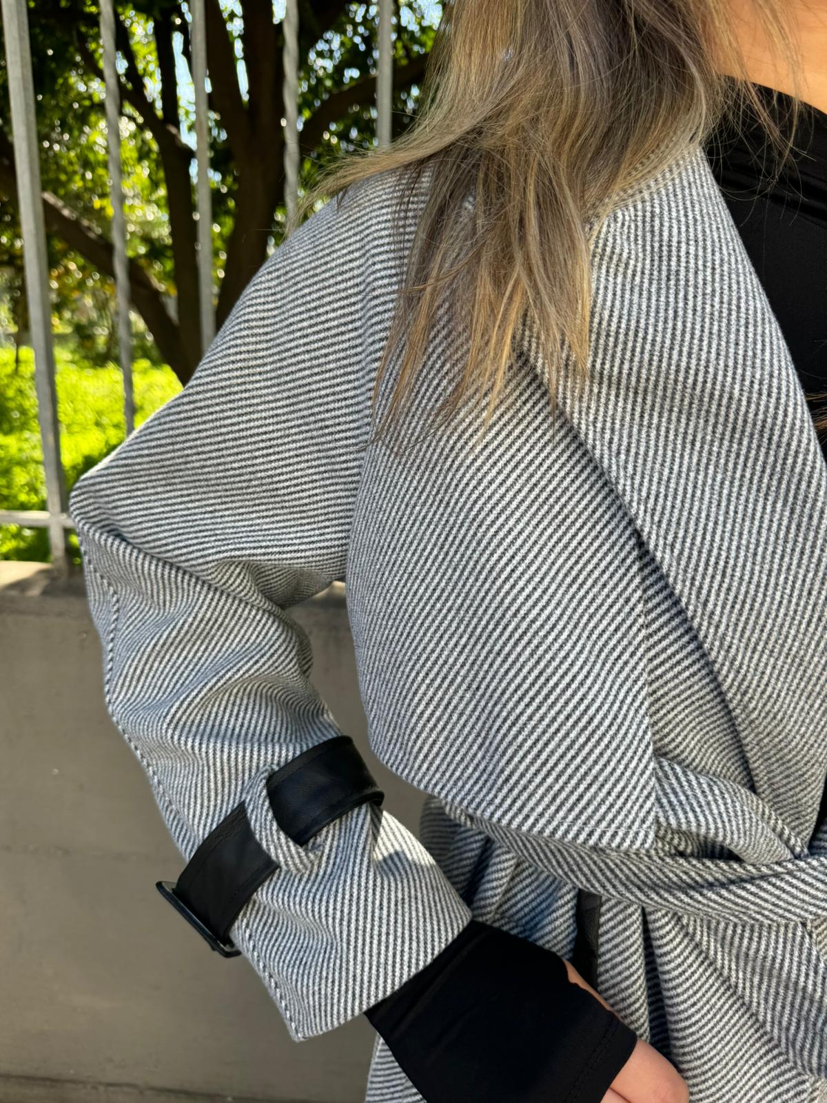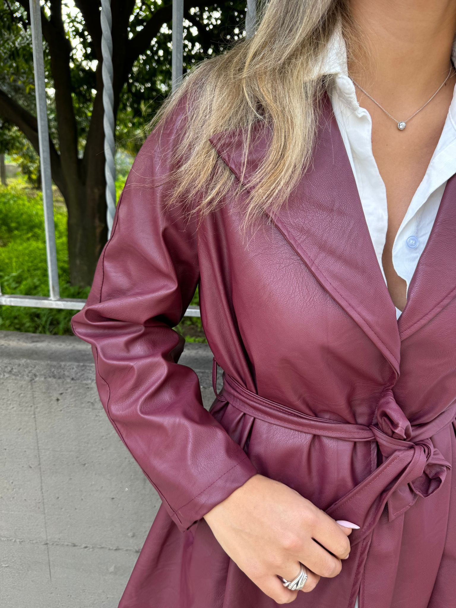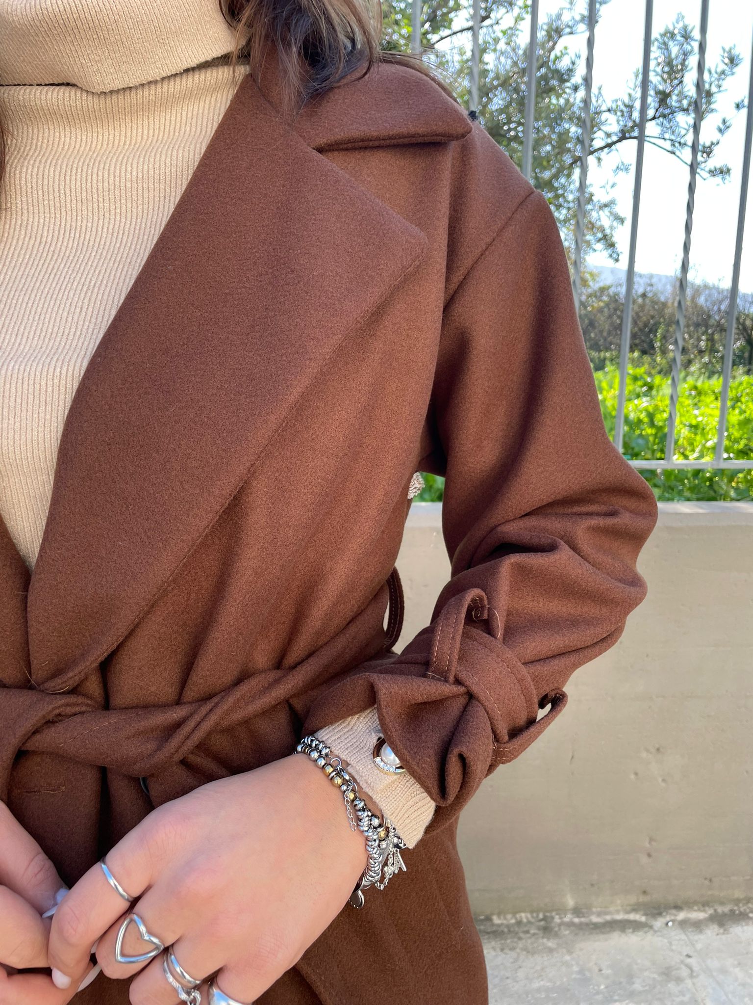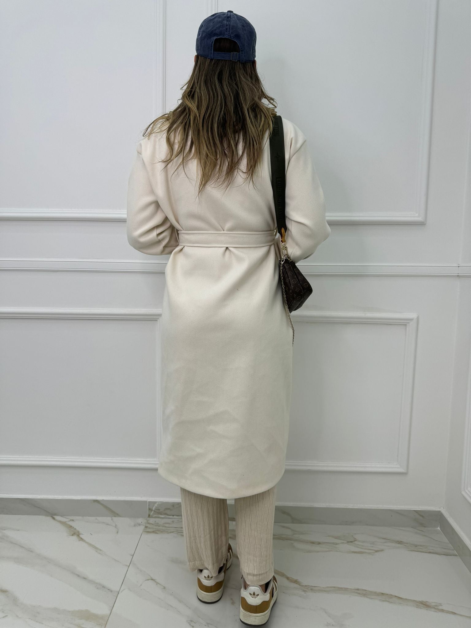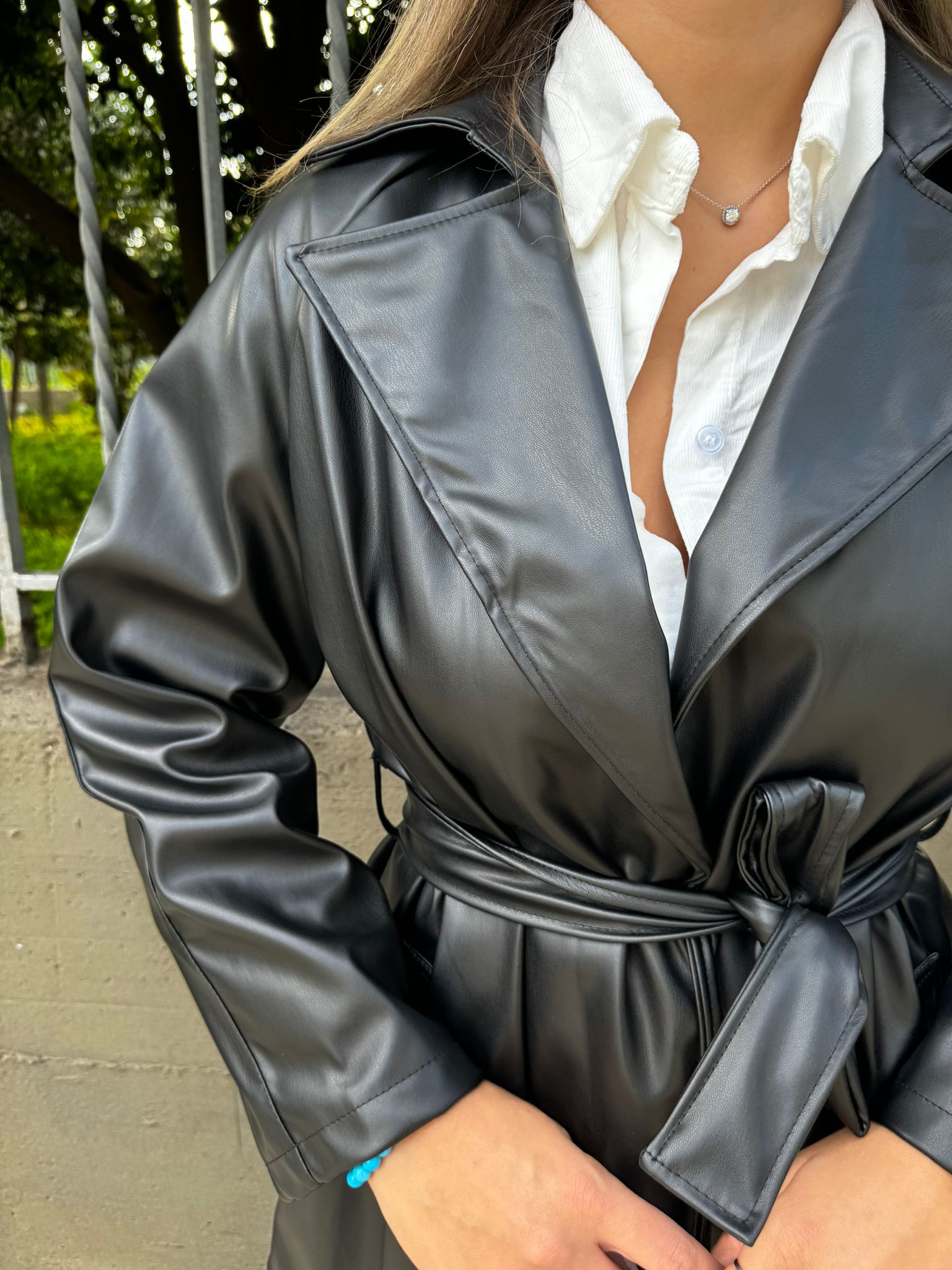 Cappotto doppio petto con cintura e fibbie eco pelle