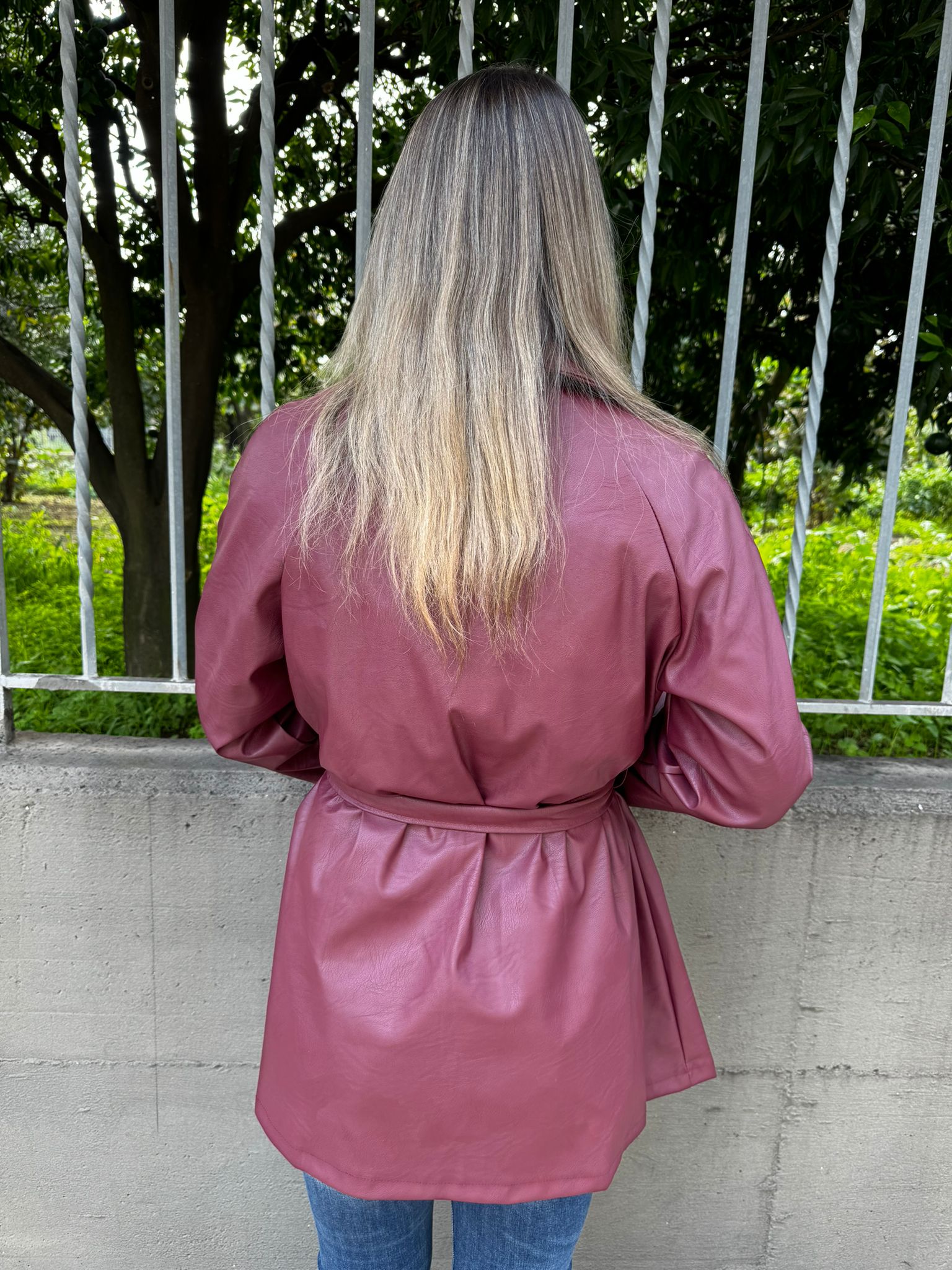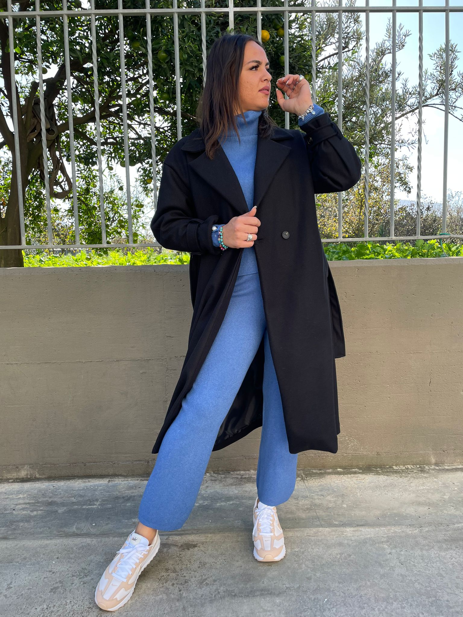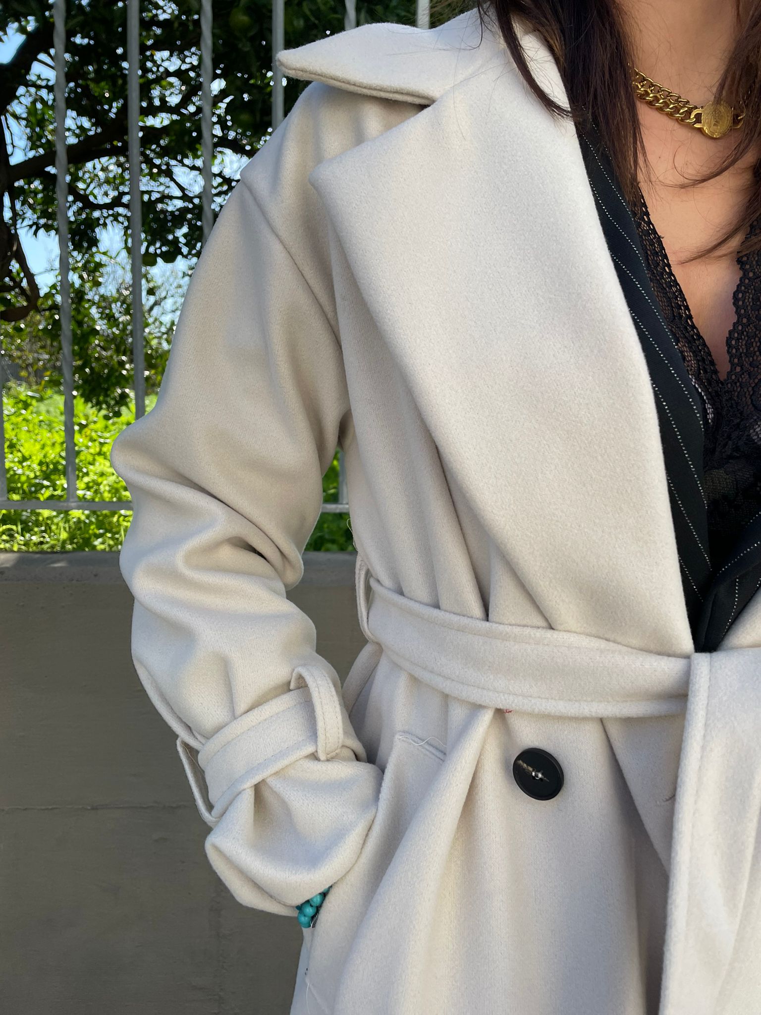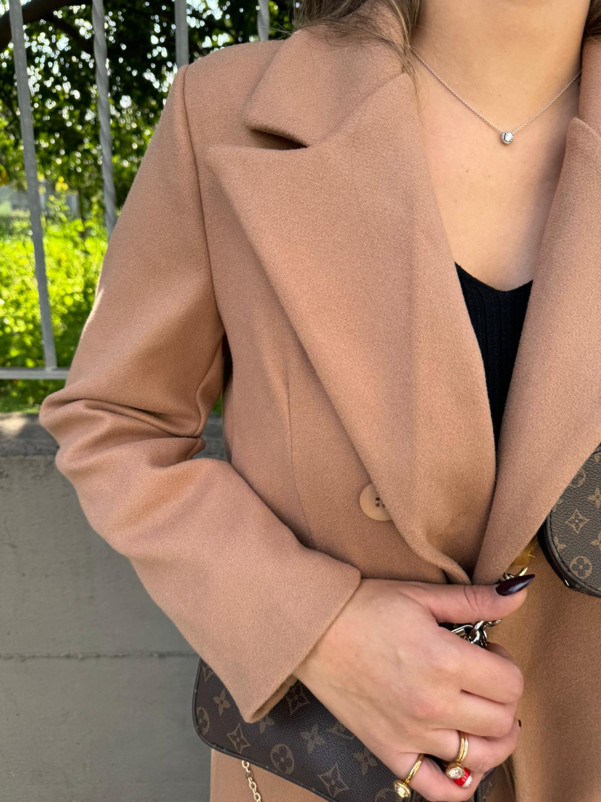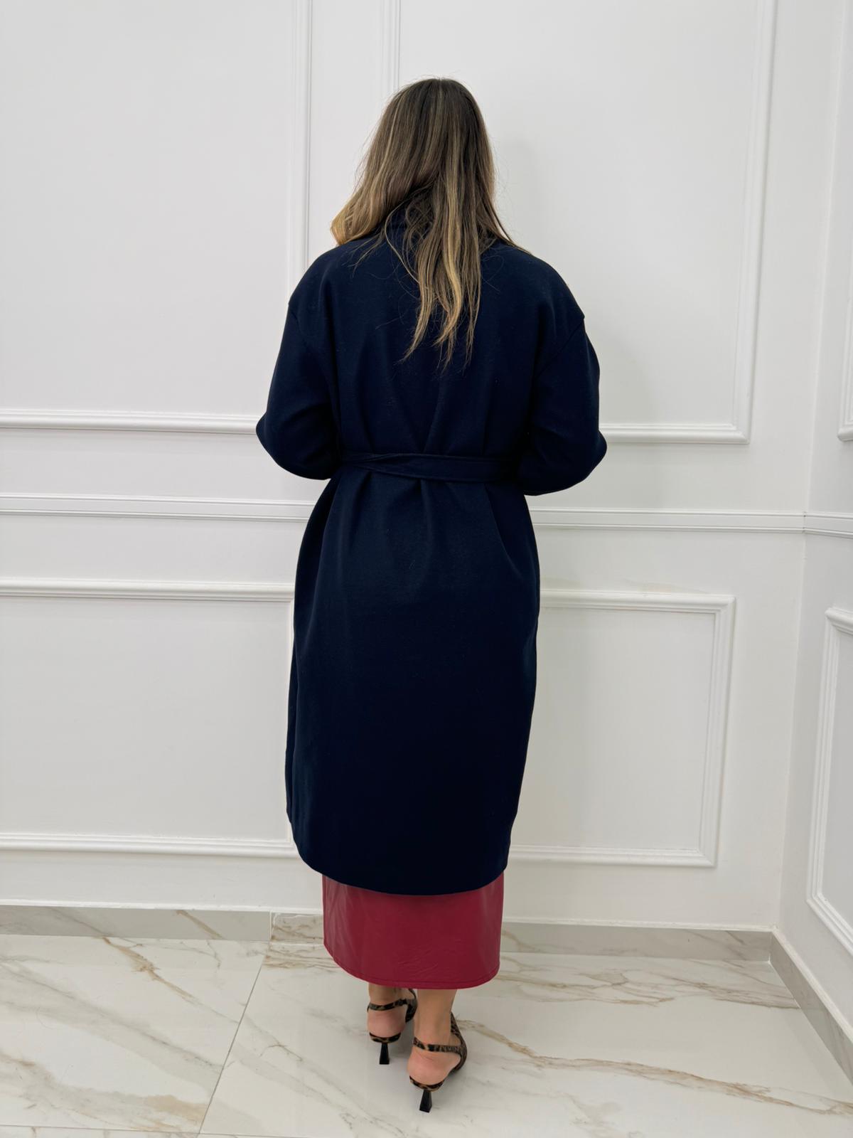 Cappotto doppio petto con cintura e fibbie eco pelle