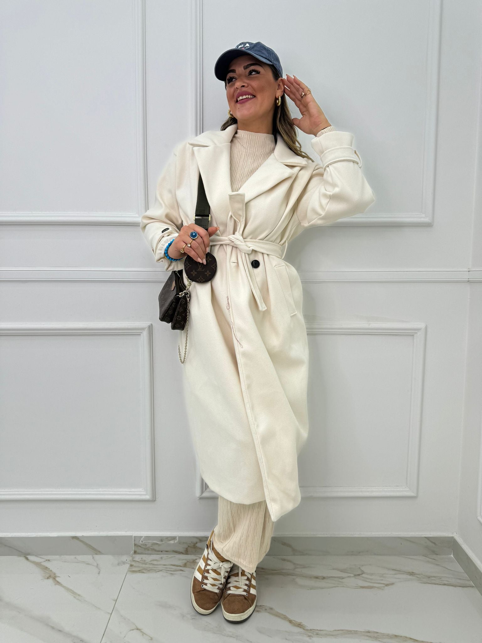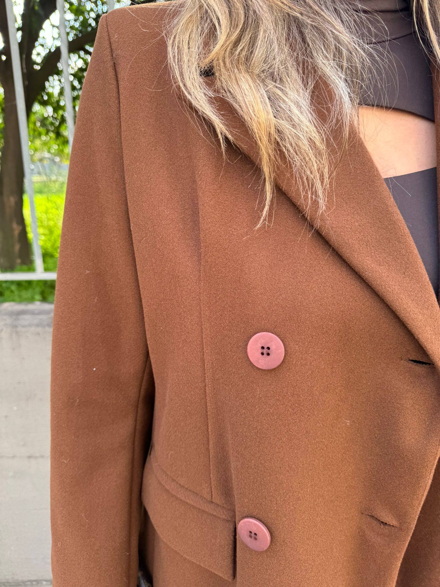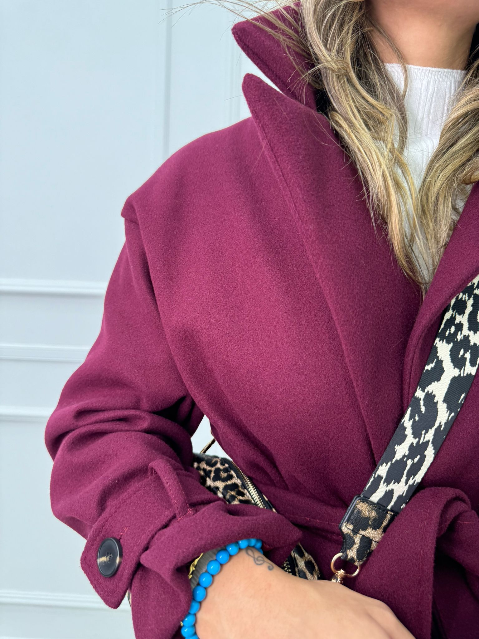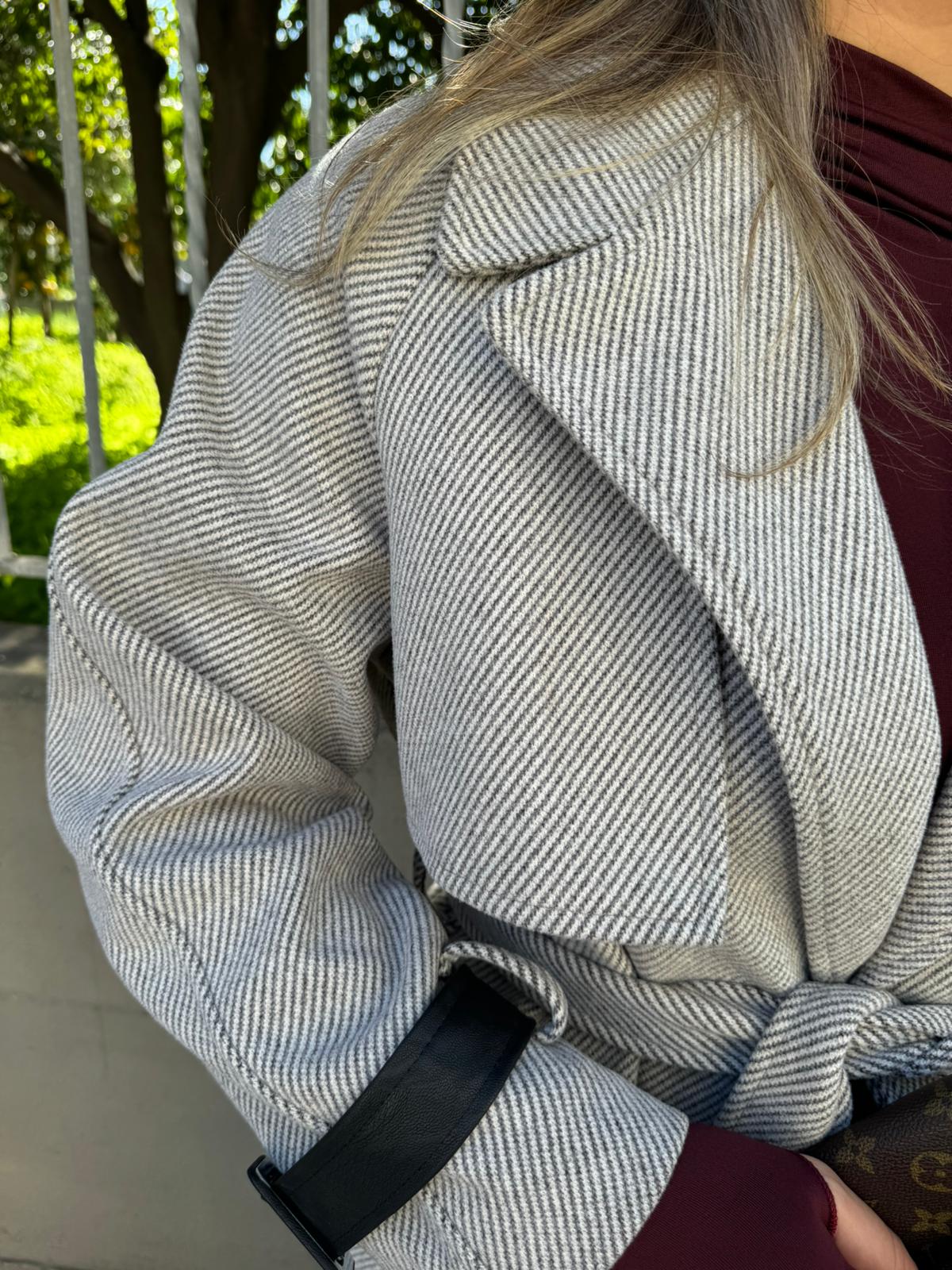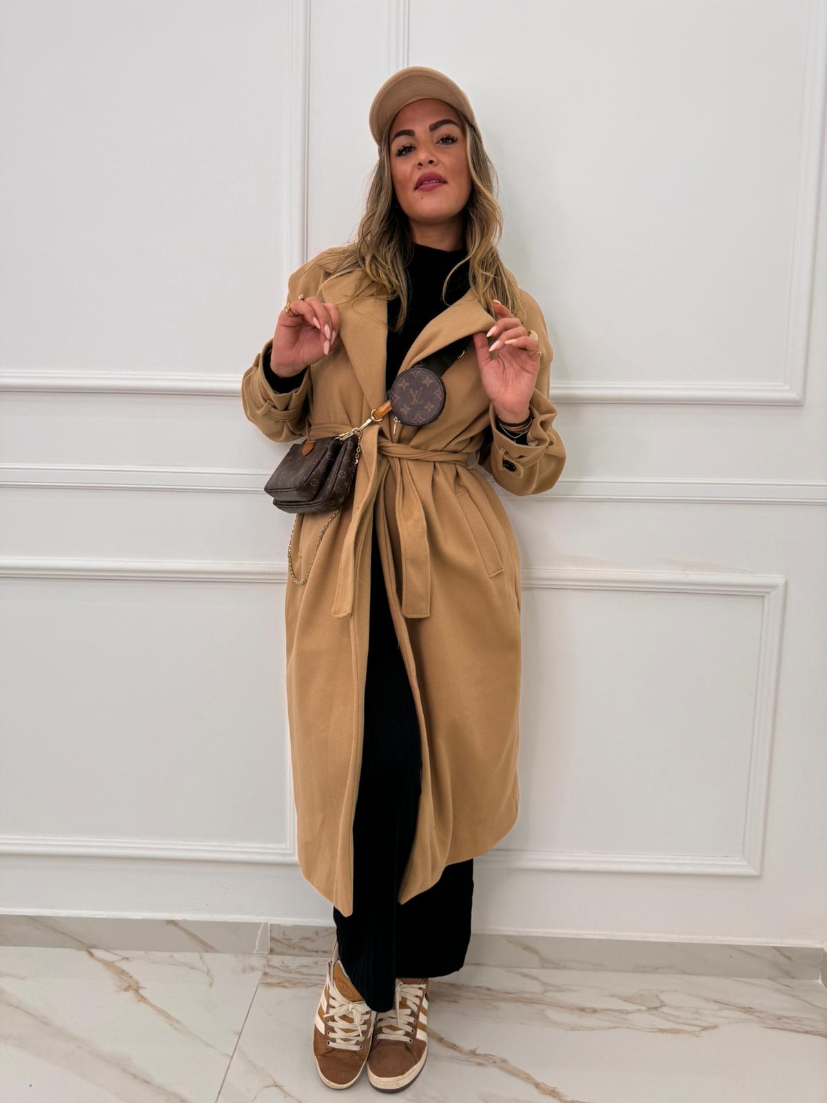Cappotto doppio petto con cintura e fibbie eco pelle