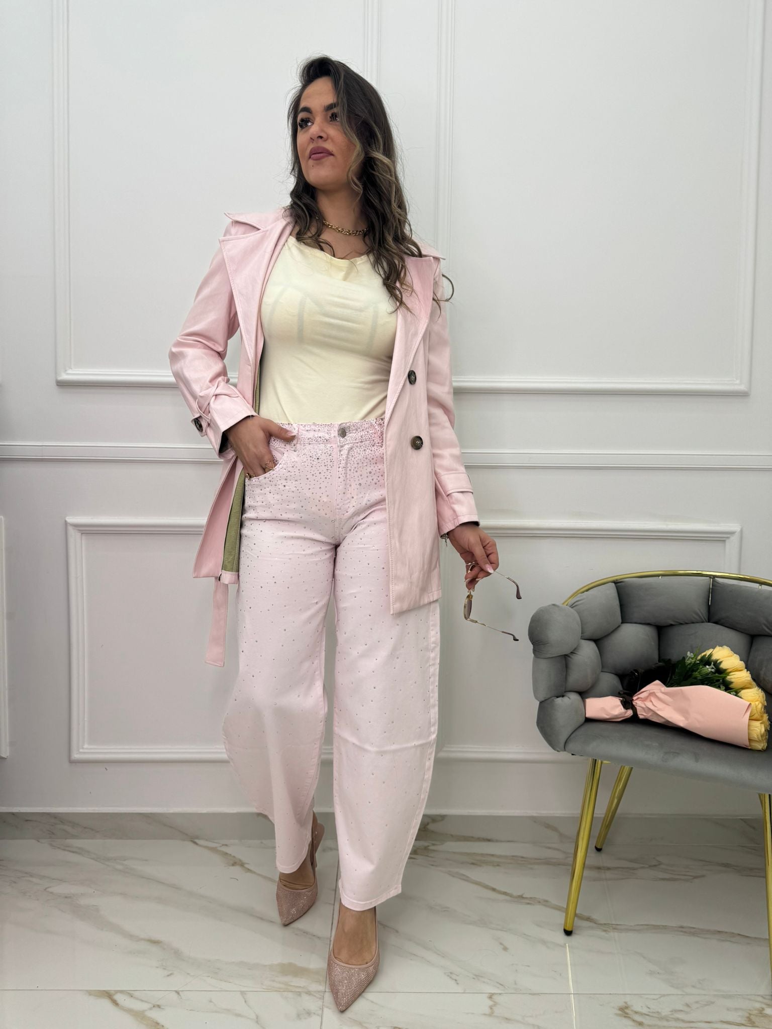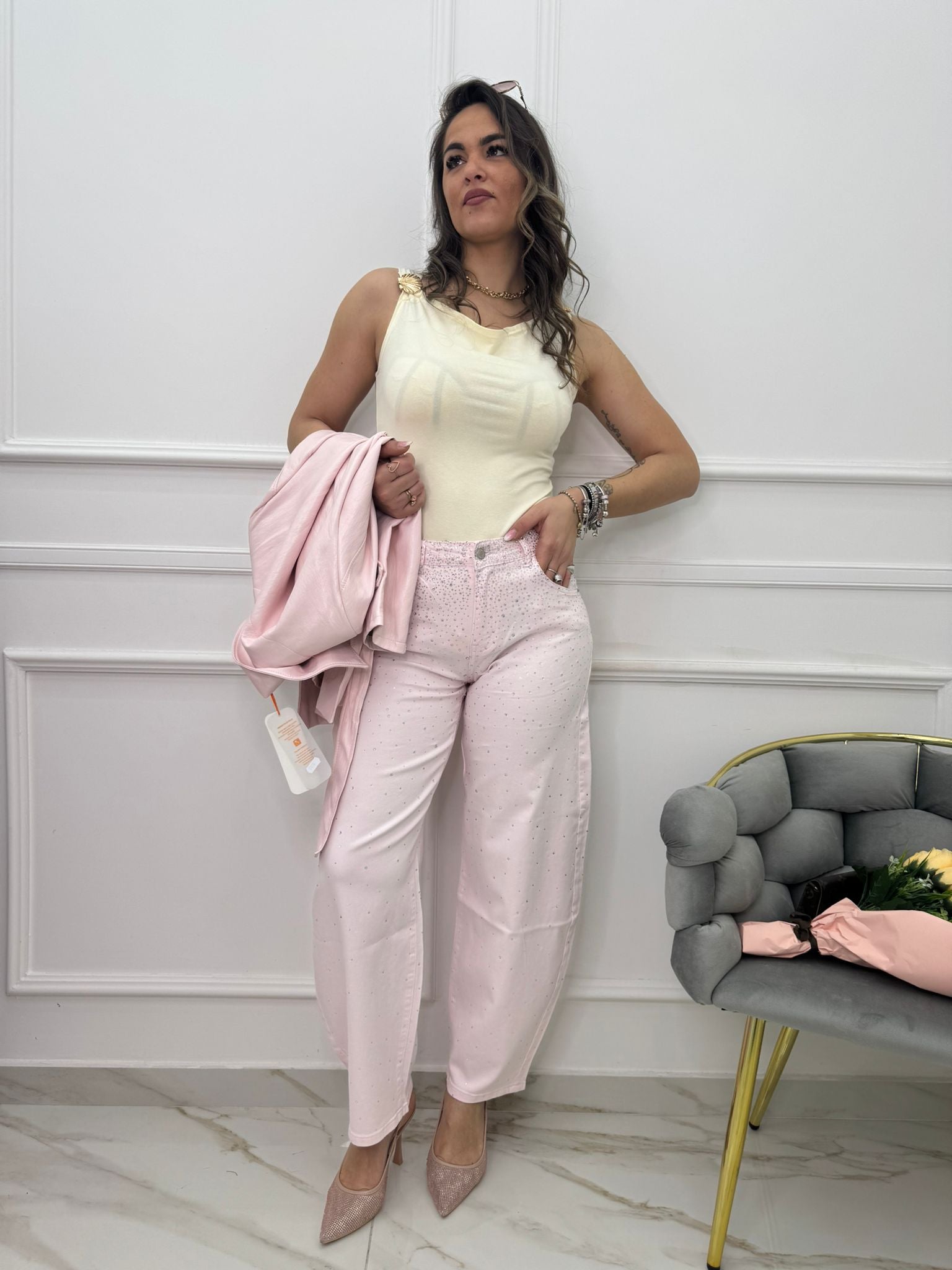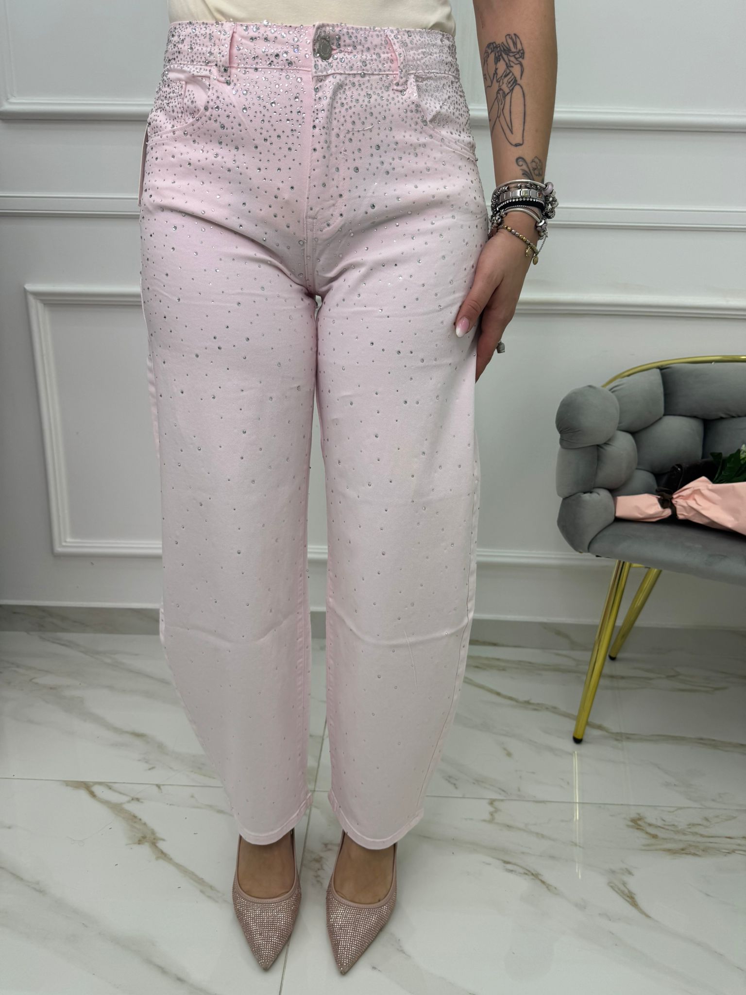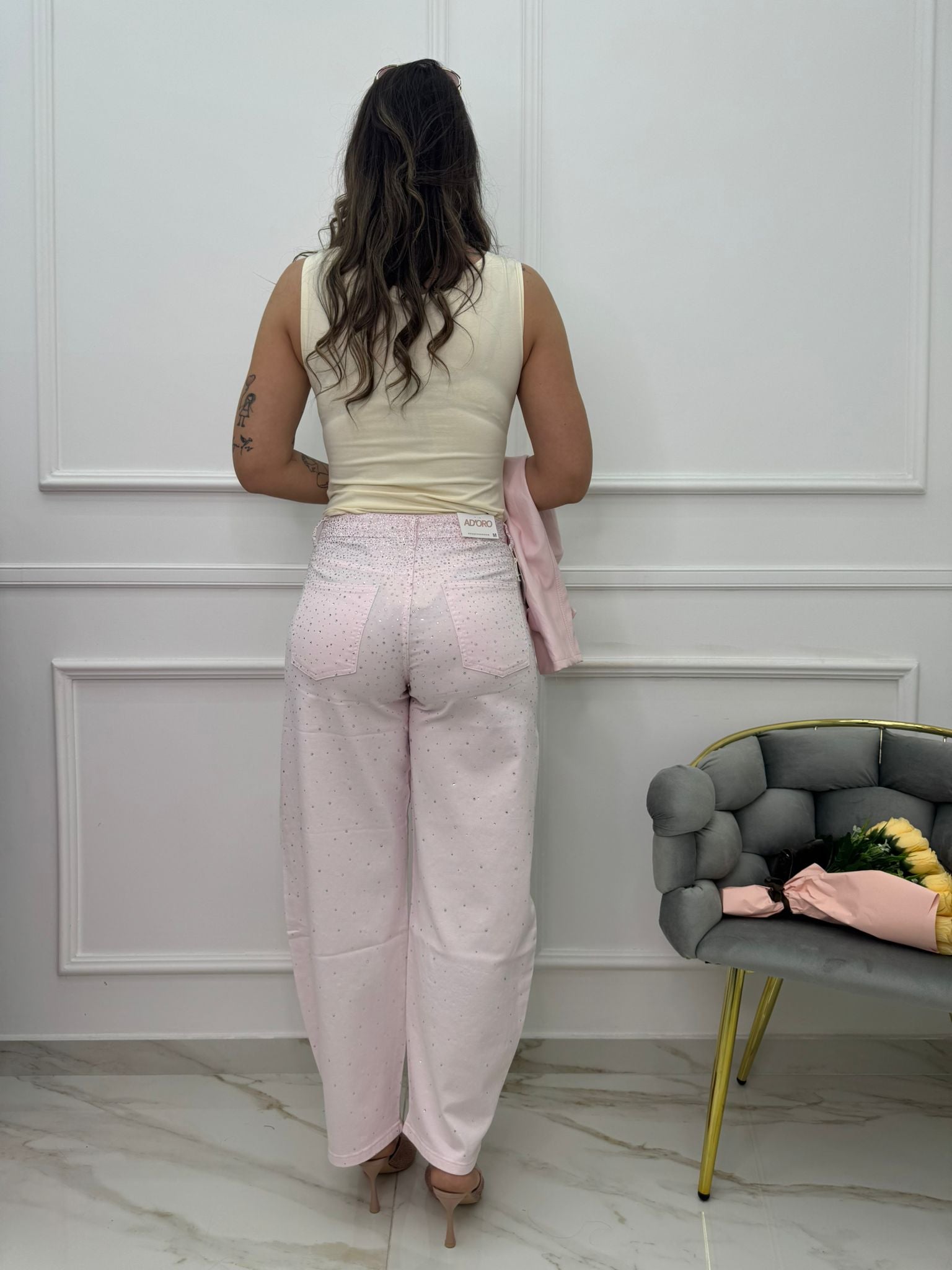 Jeans wide leg lavaggio chiaro con tasca rosa glitterata