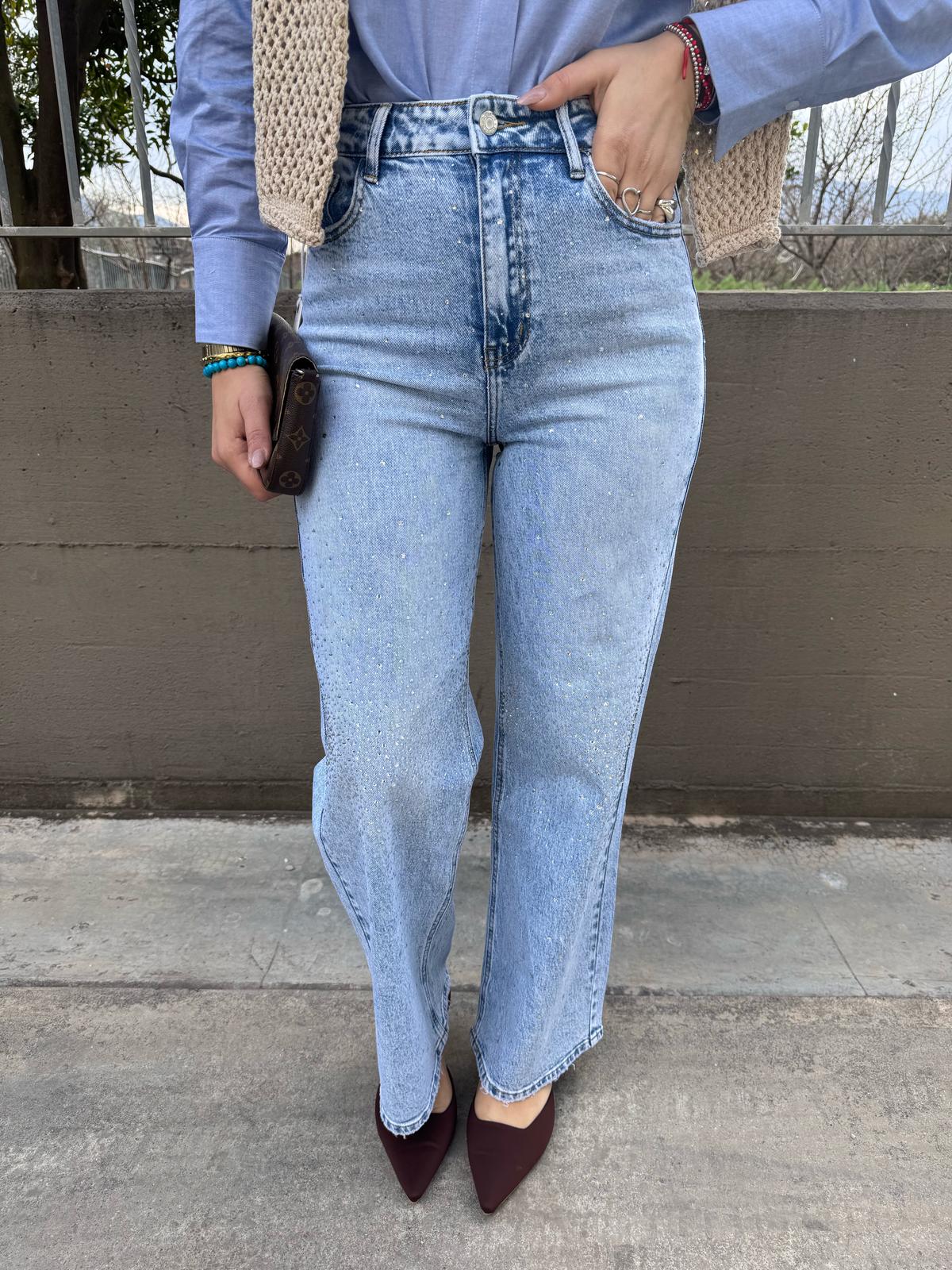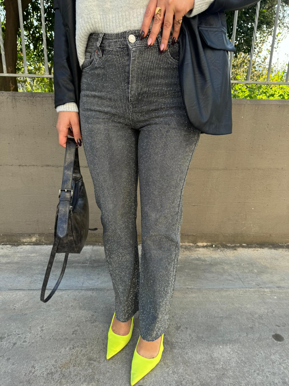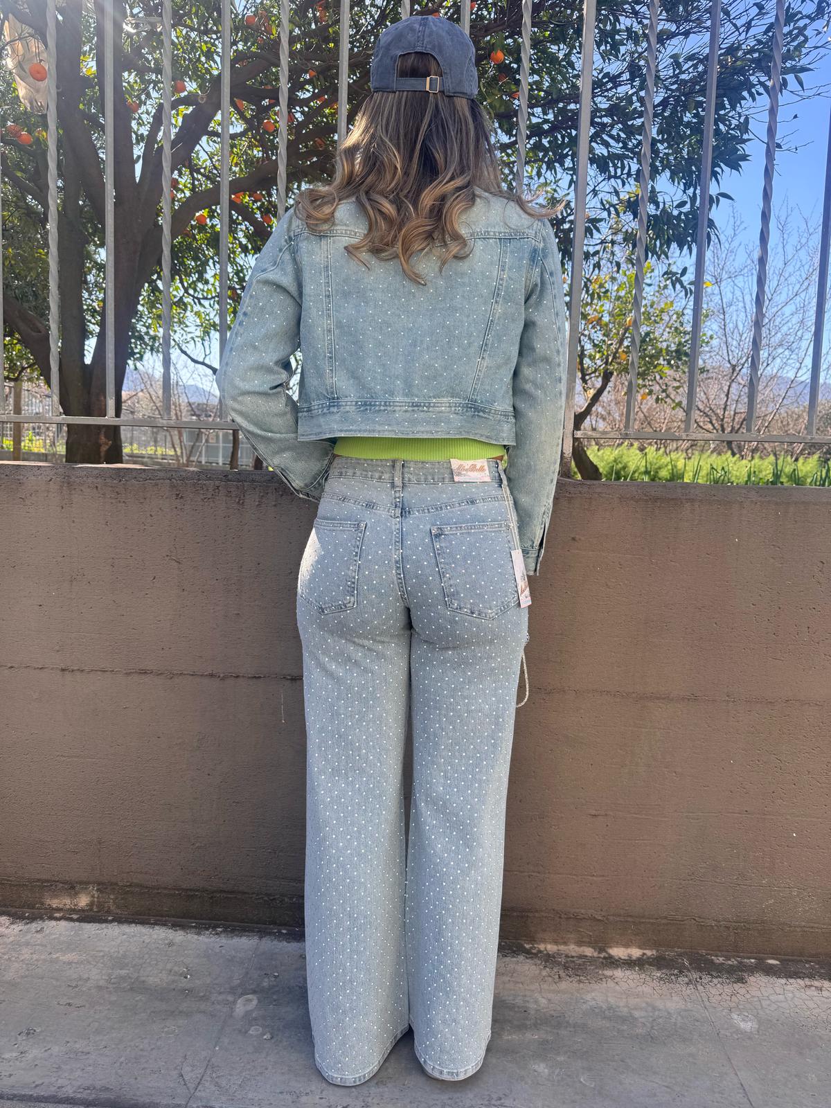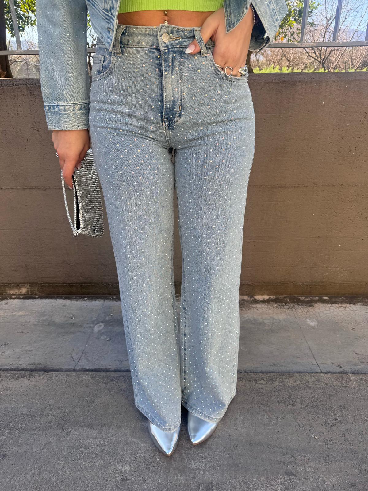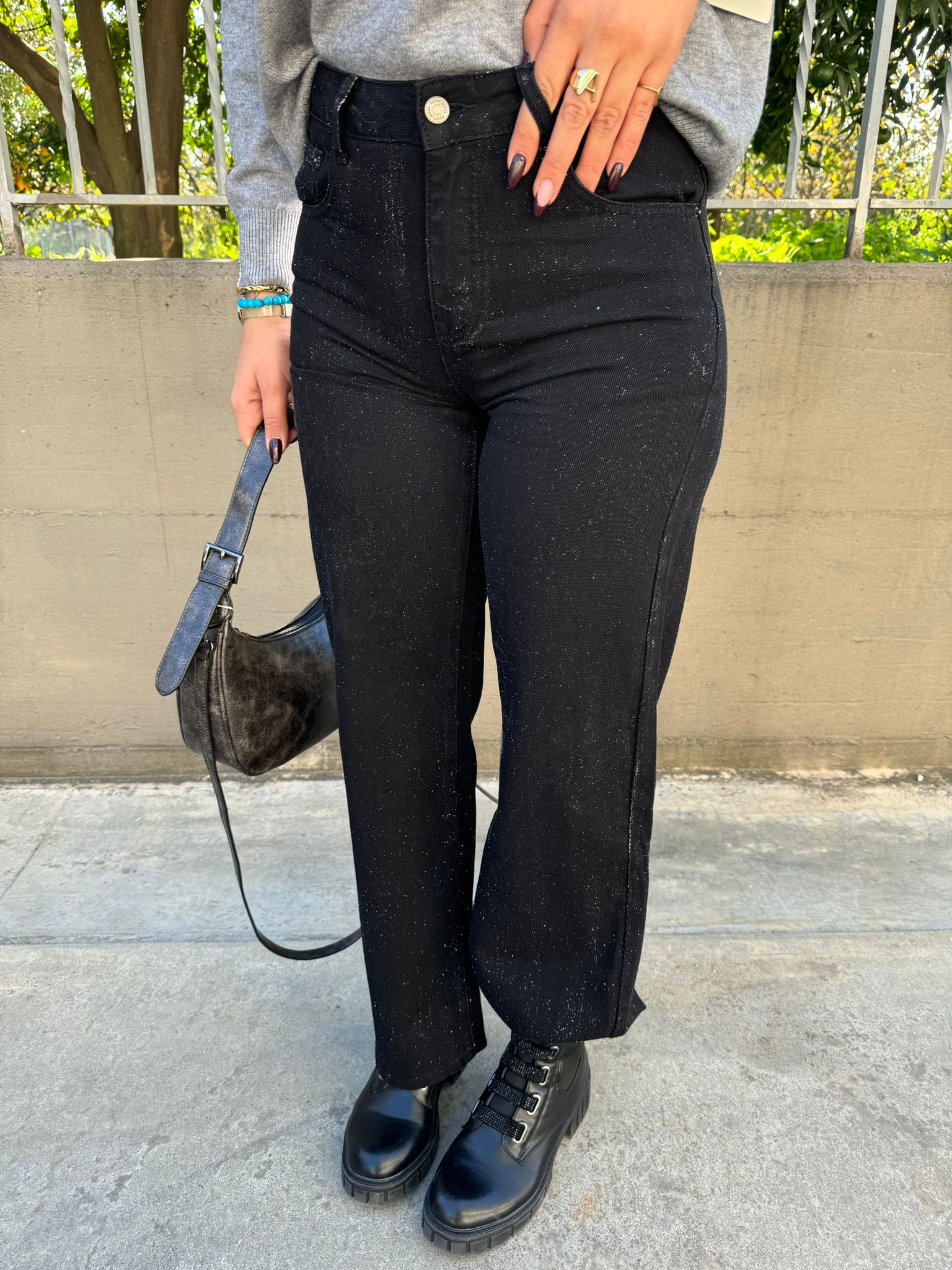 Jeans palazzo con brillantini e taglio laser alle caviglie