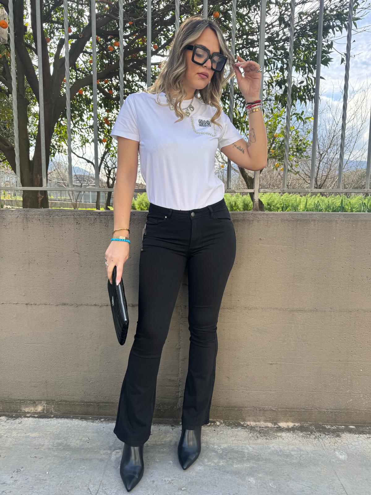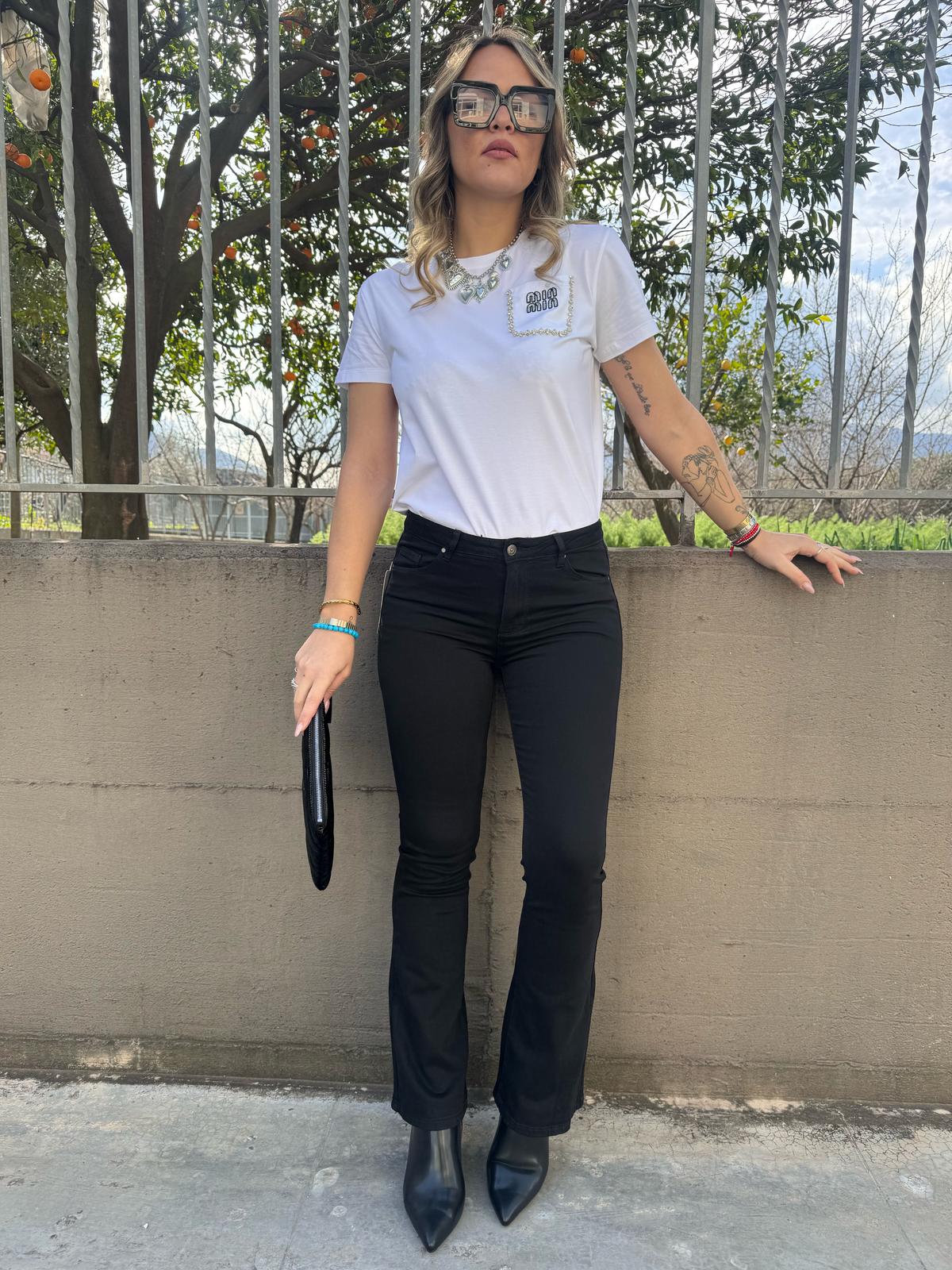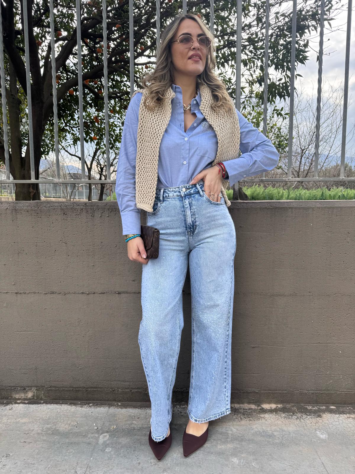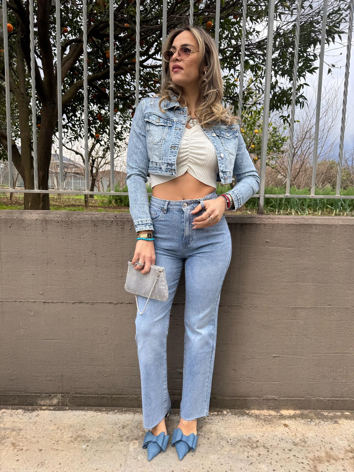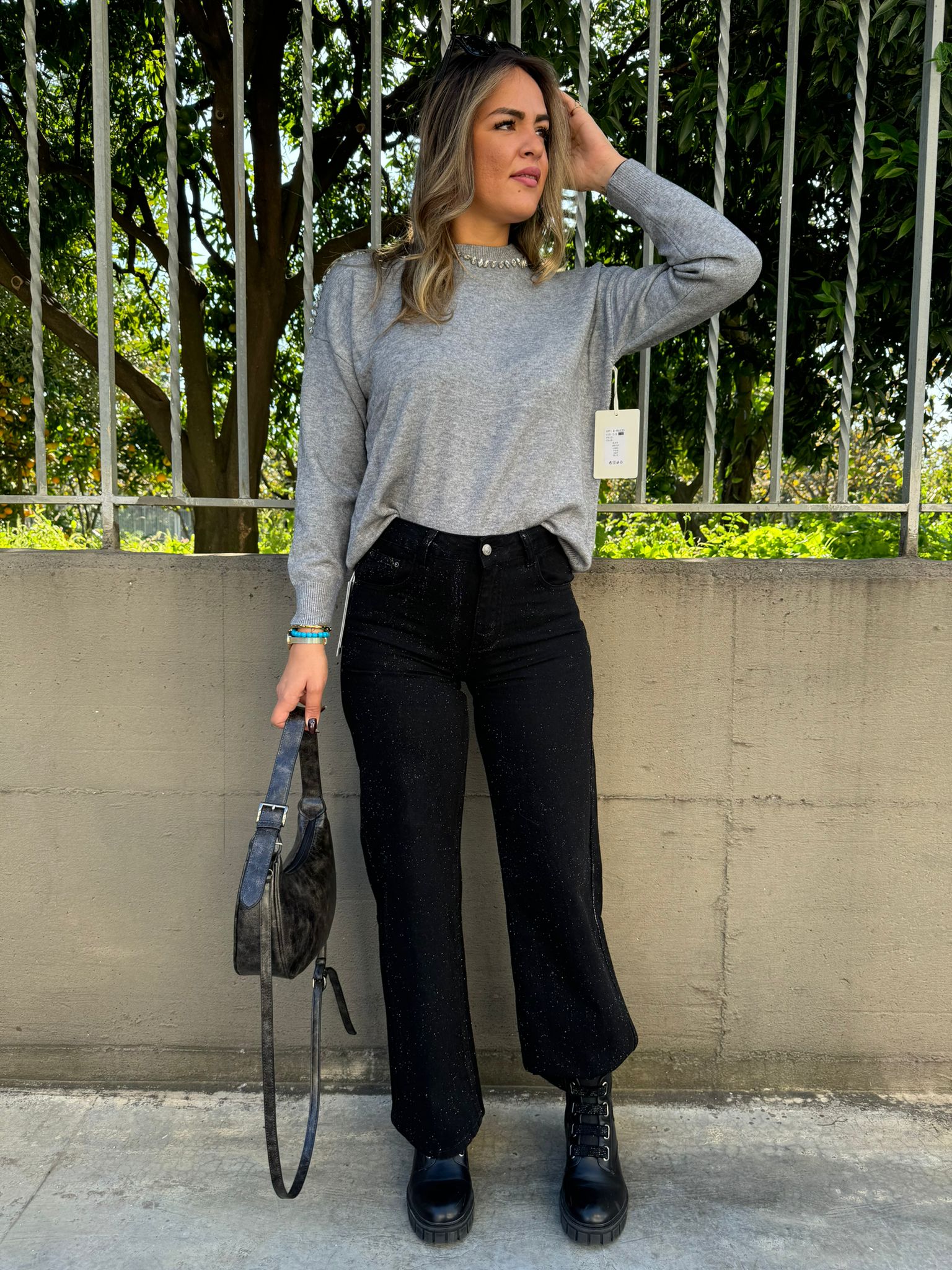 Jeans palazzo con brillantini e taglio laser alle caviglie