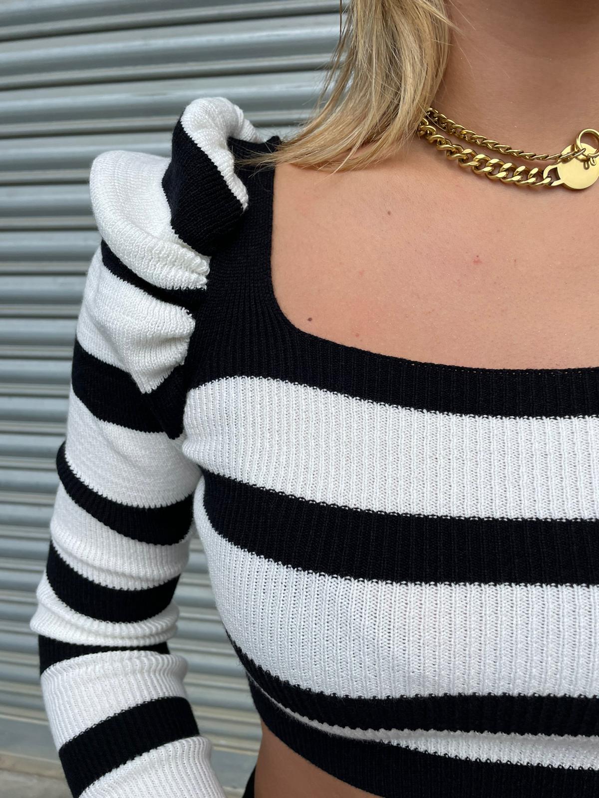 Maglia corta in filo a righe con manica a sbuffo