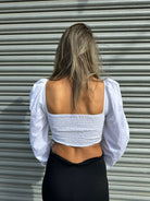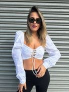 Camicia crop con maniche a sbuffo e laccetti