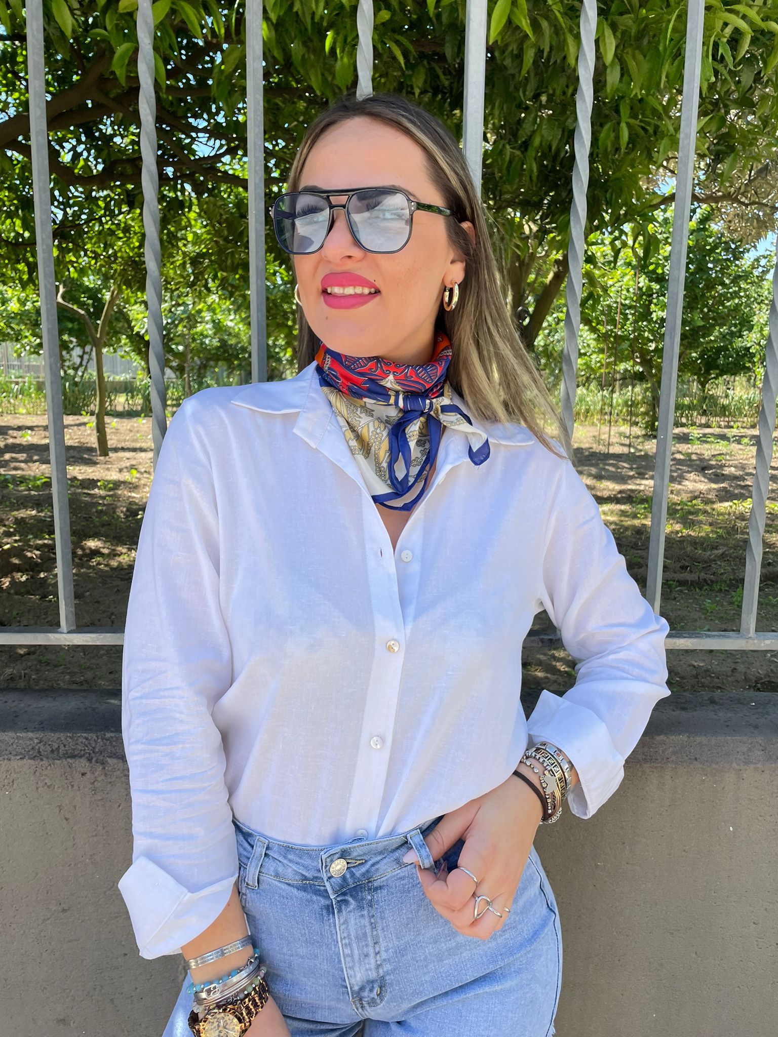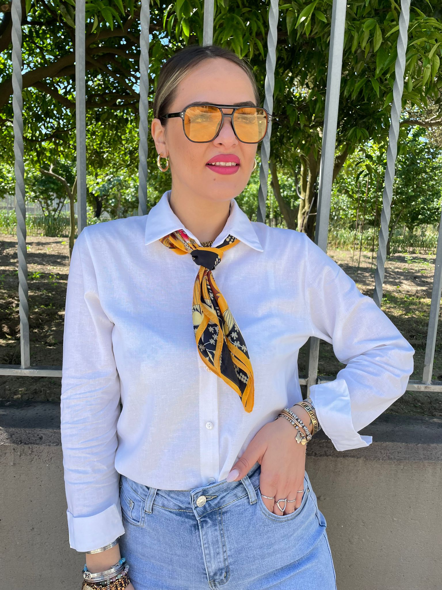 Camicia in lino tinta unita con foulard colorato