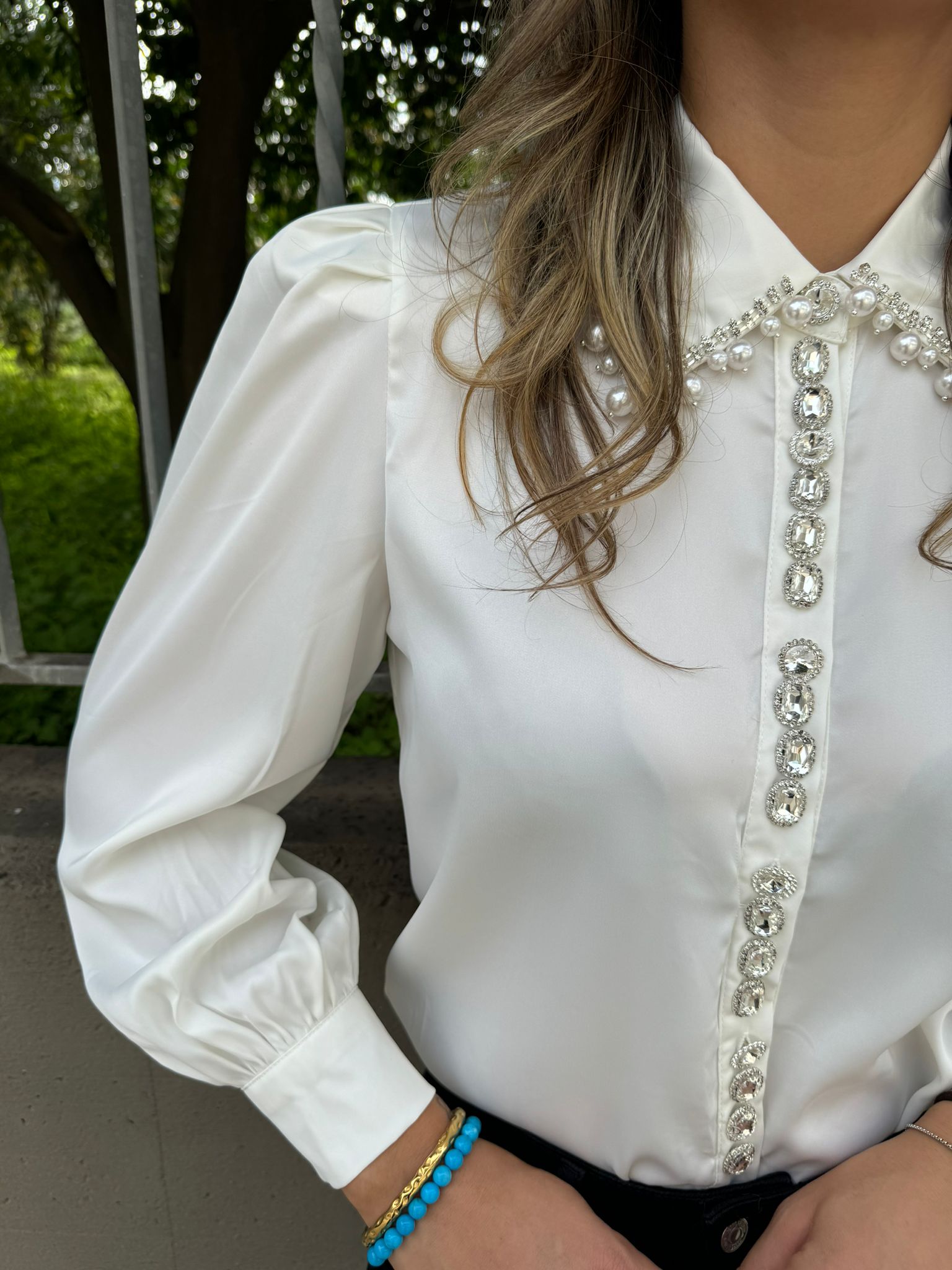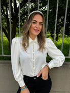 Camicia tinta unita con perle al colletto