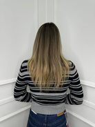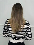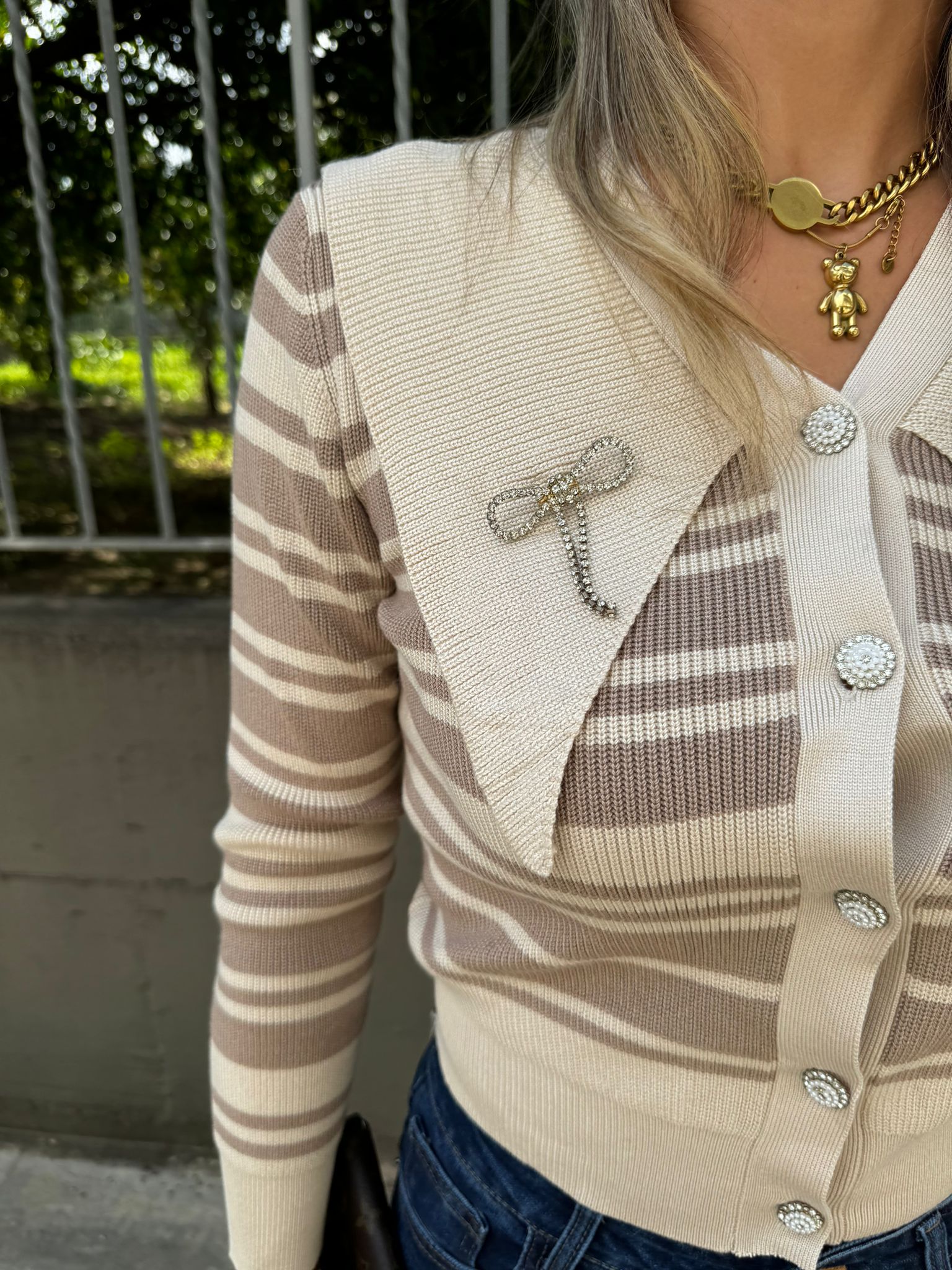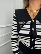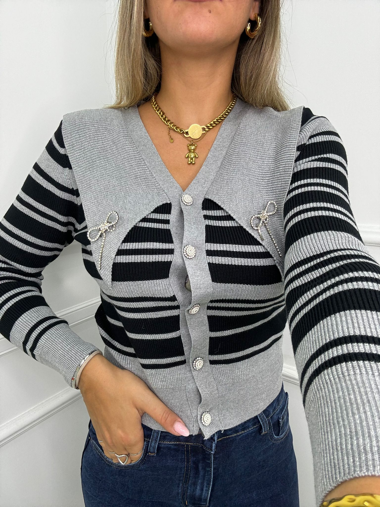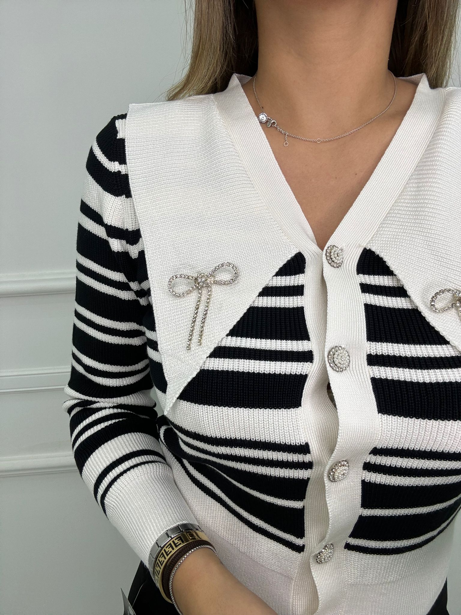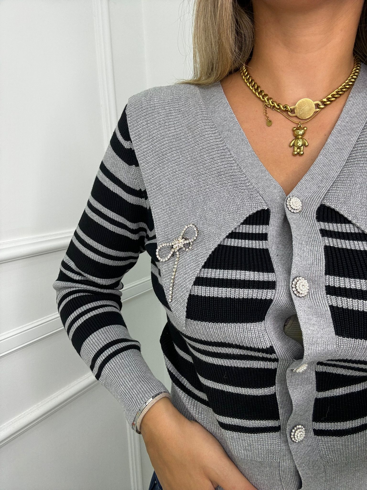 Cardigan a righe con collo a punta e swarovski