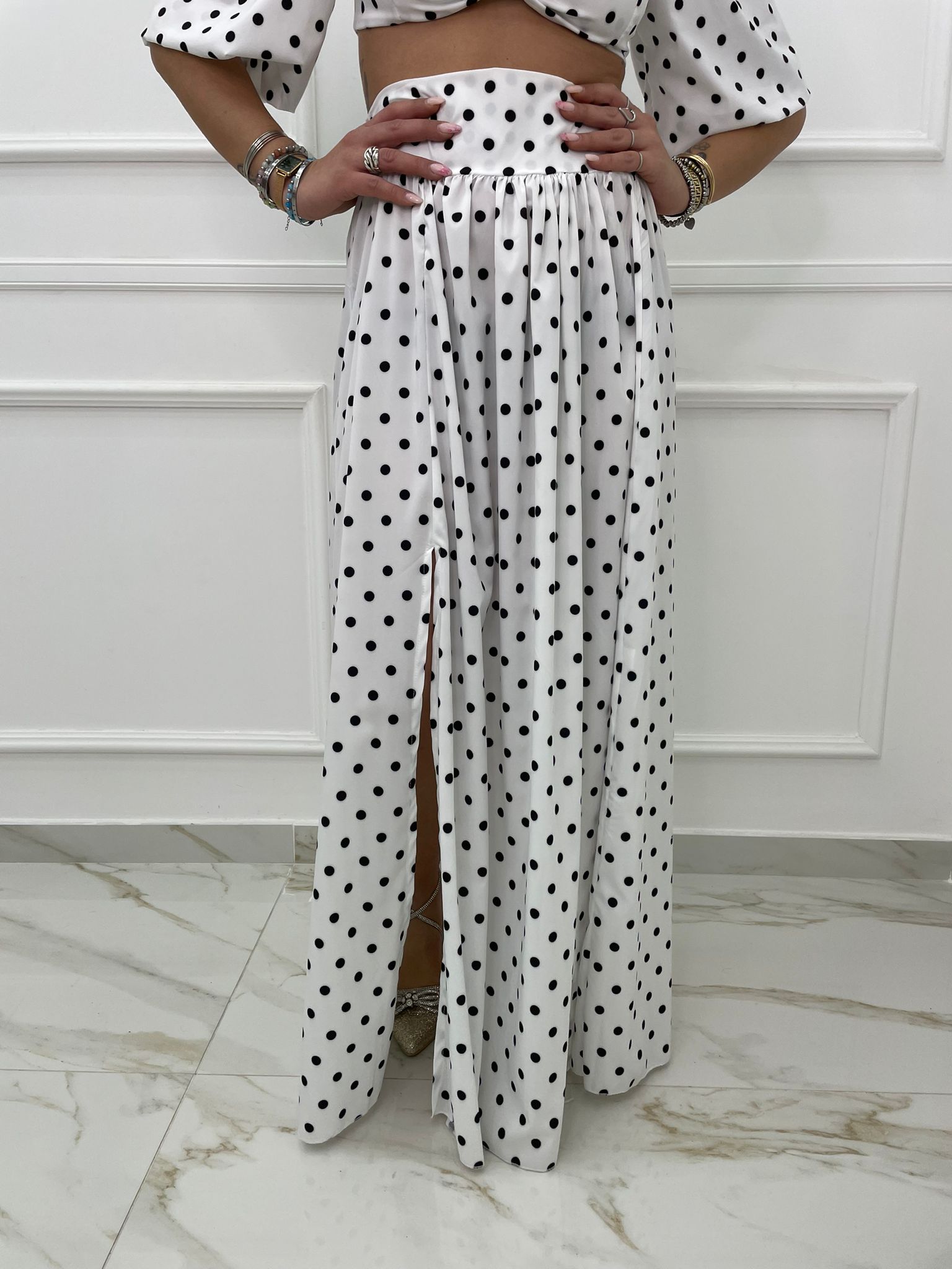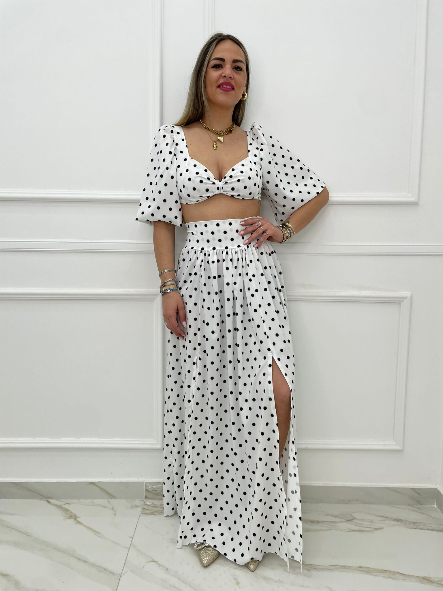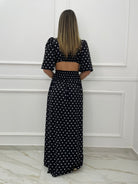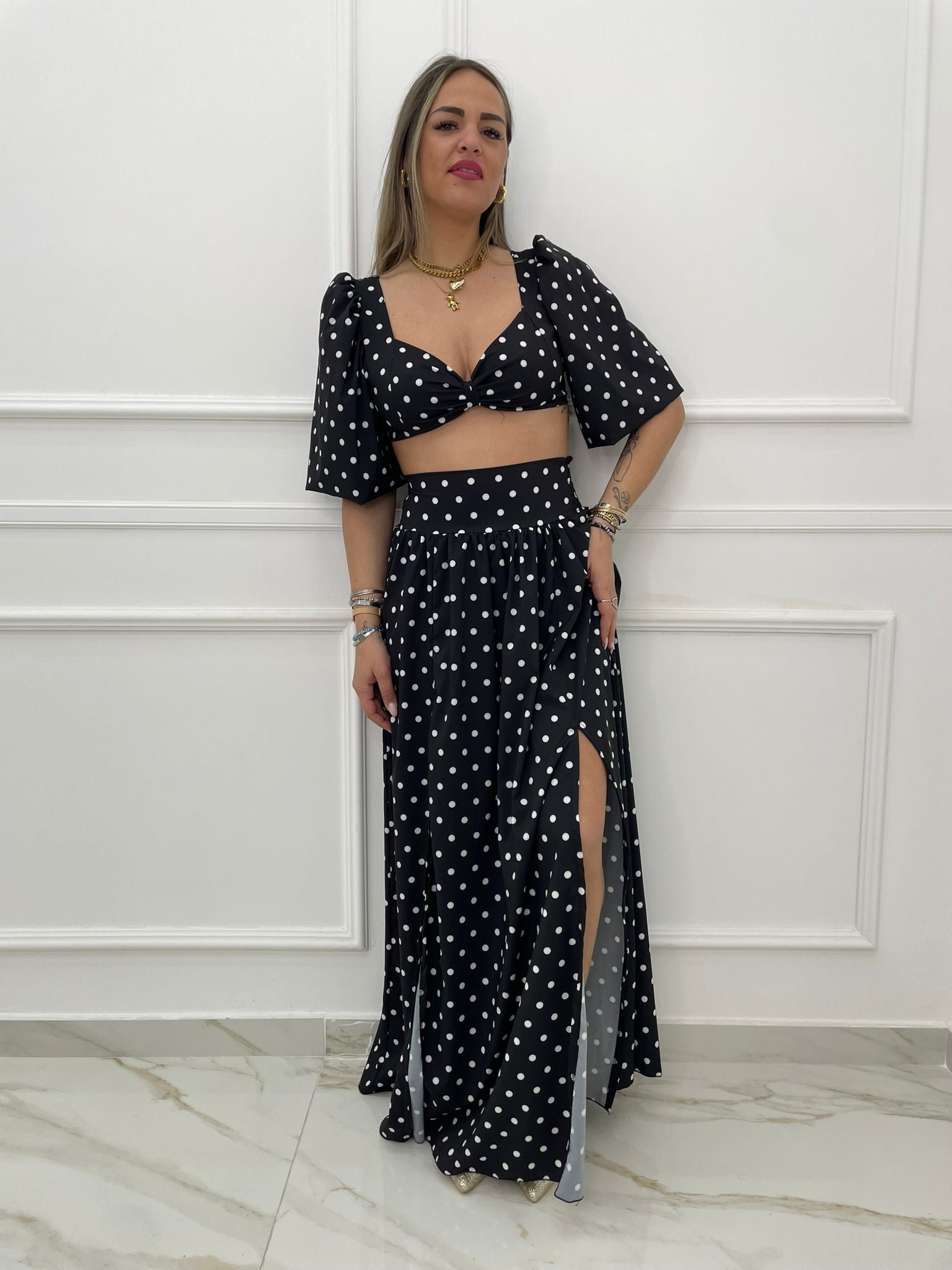 Coordinato 2 pezzi fantasia pois con gonnellone