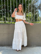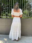 Coordinato 2 pezzi in pizzo san gallo con gonnellone e camicia crop