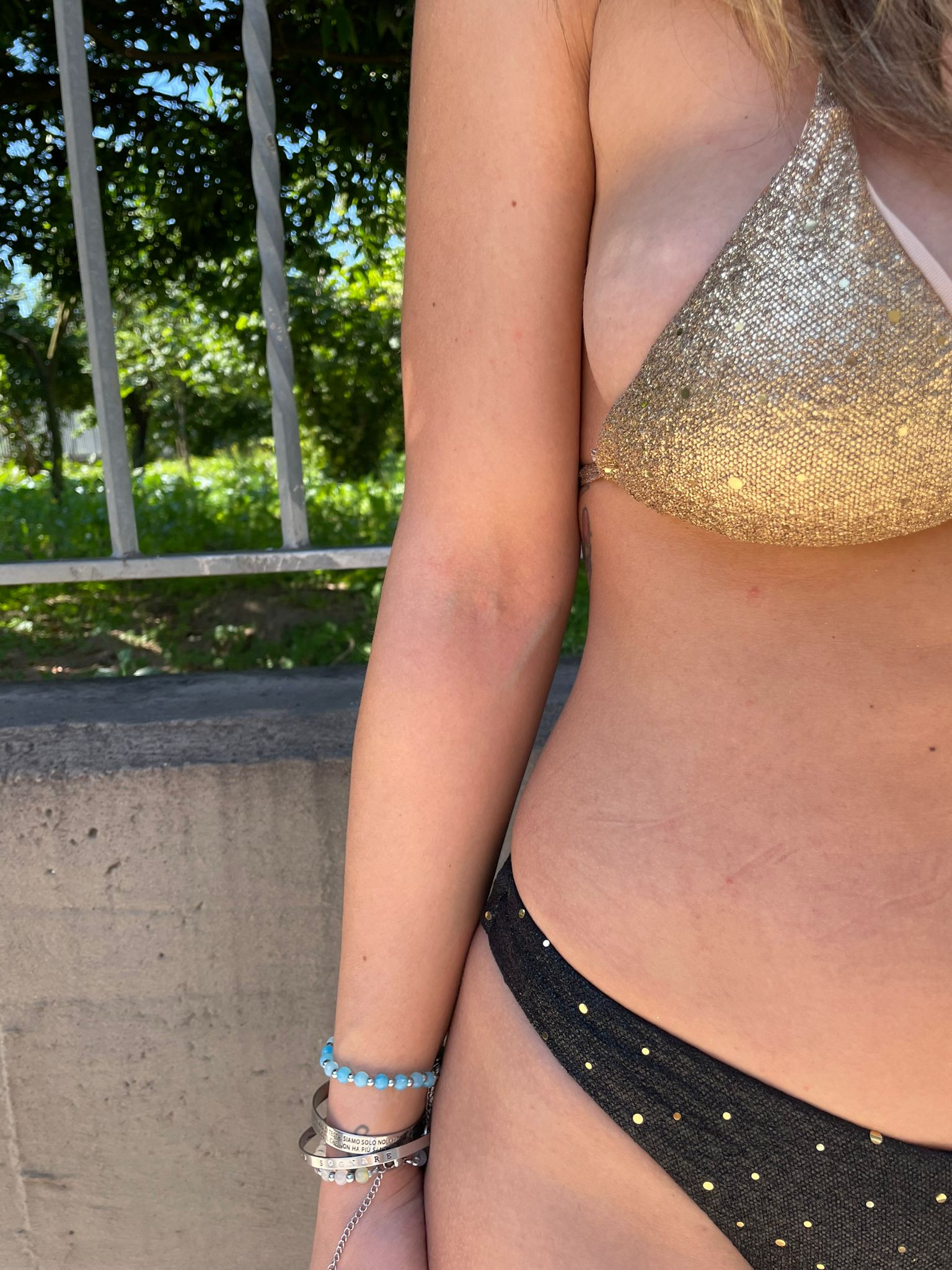 - LA modella è una taglia 44, 4^ di seno e indossa la taglia "L"