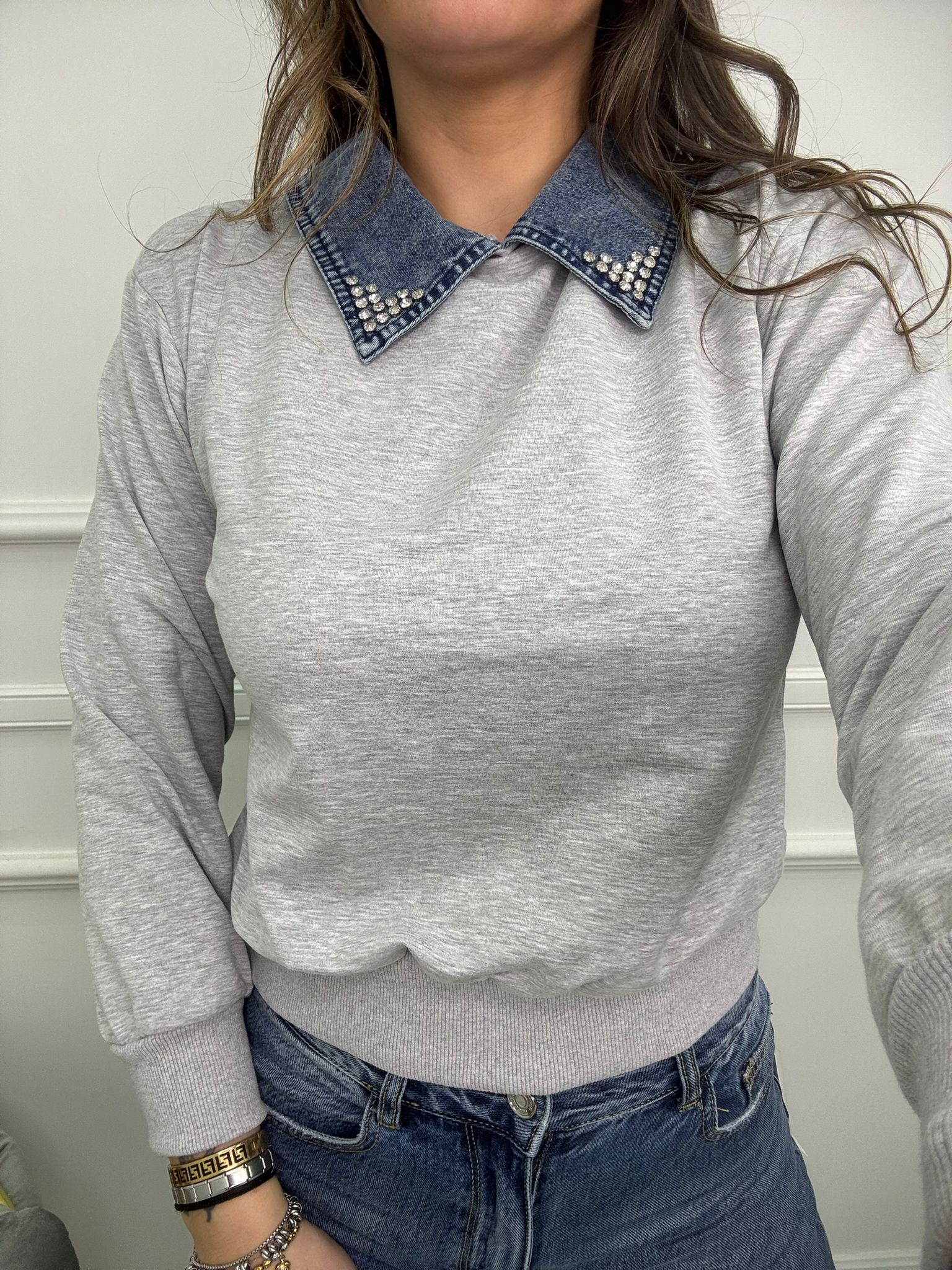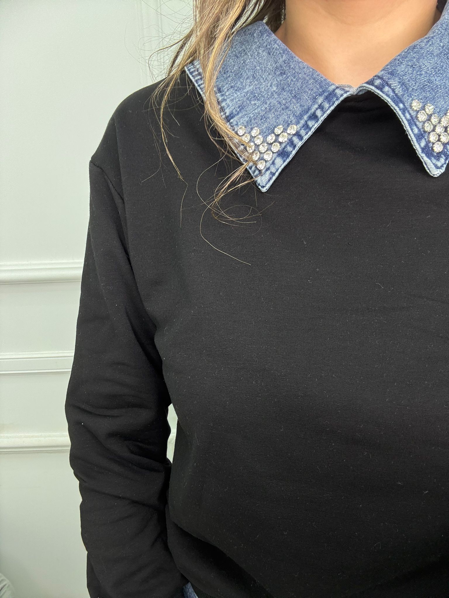 Felpa con colletto in jeans e swarovski