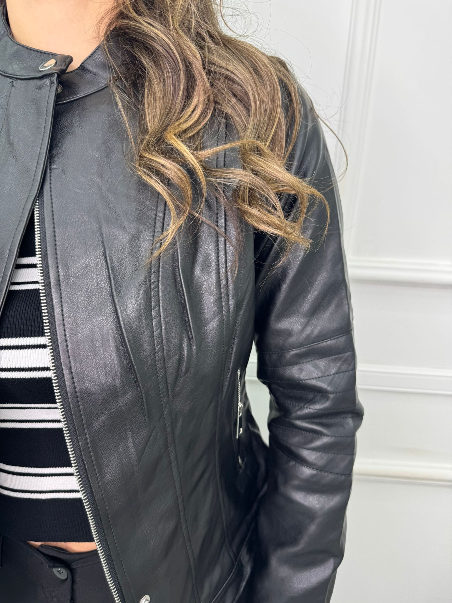 Giubbino nero eco pelle con zip e tasche laterali