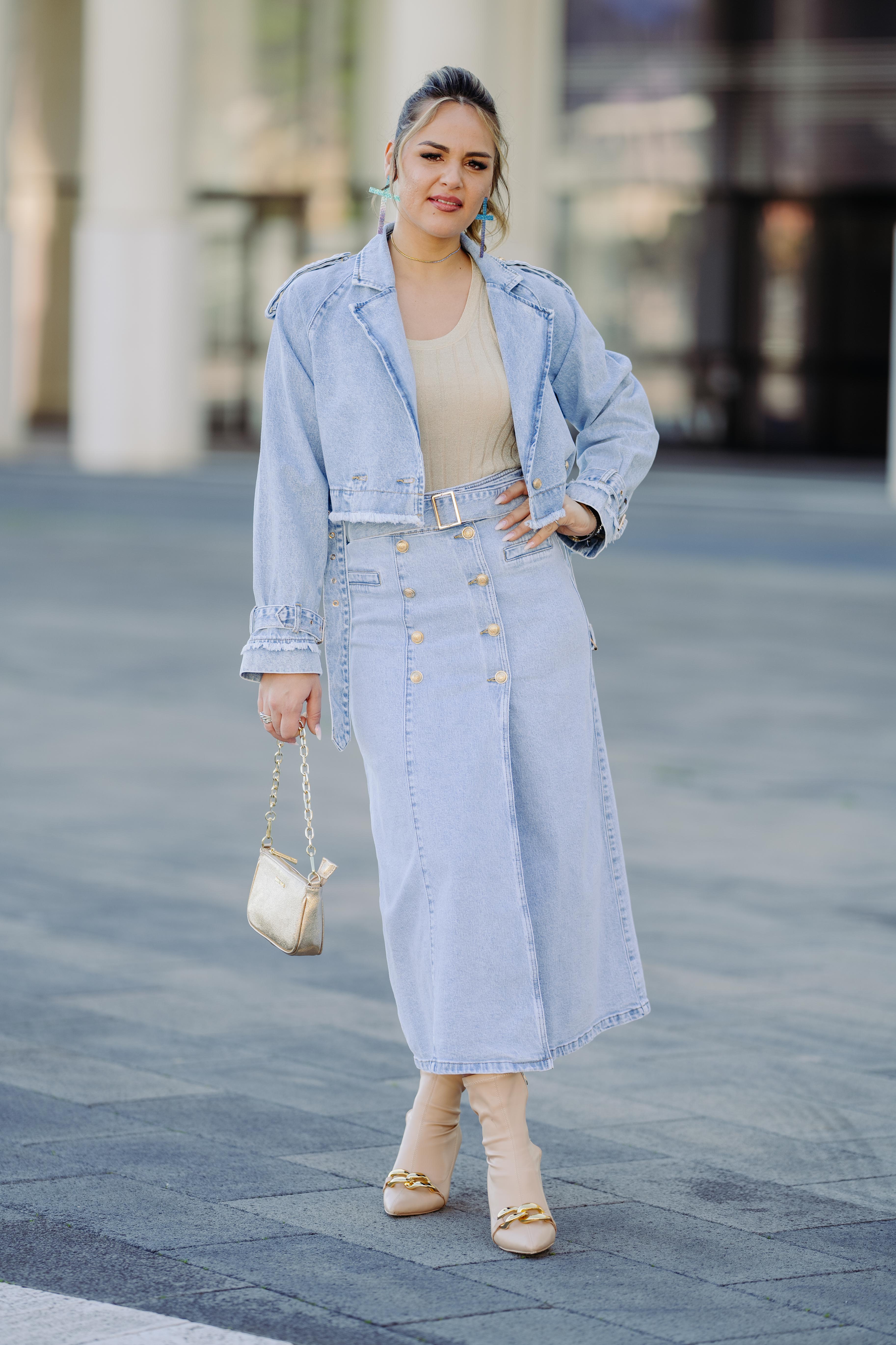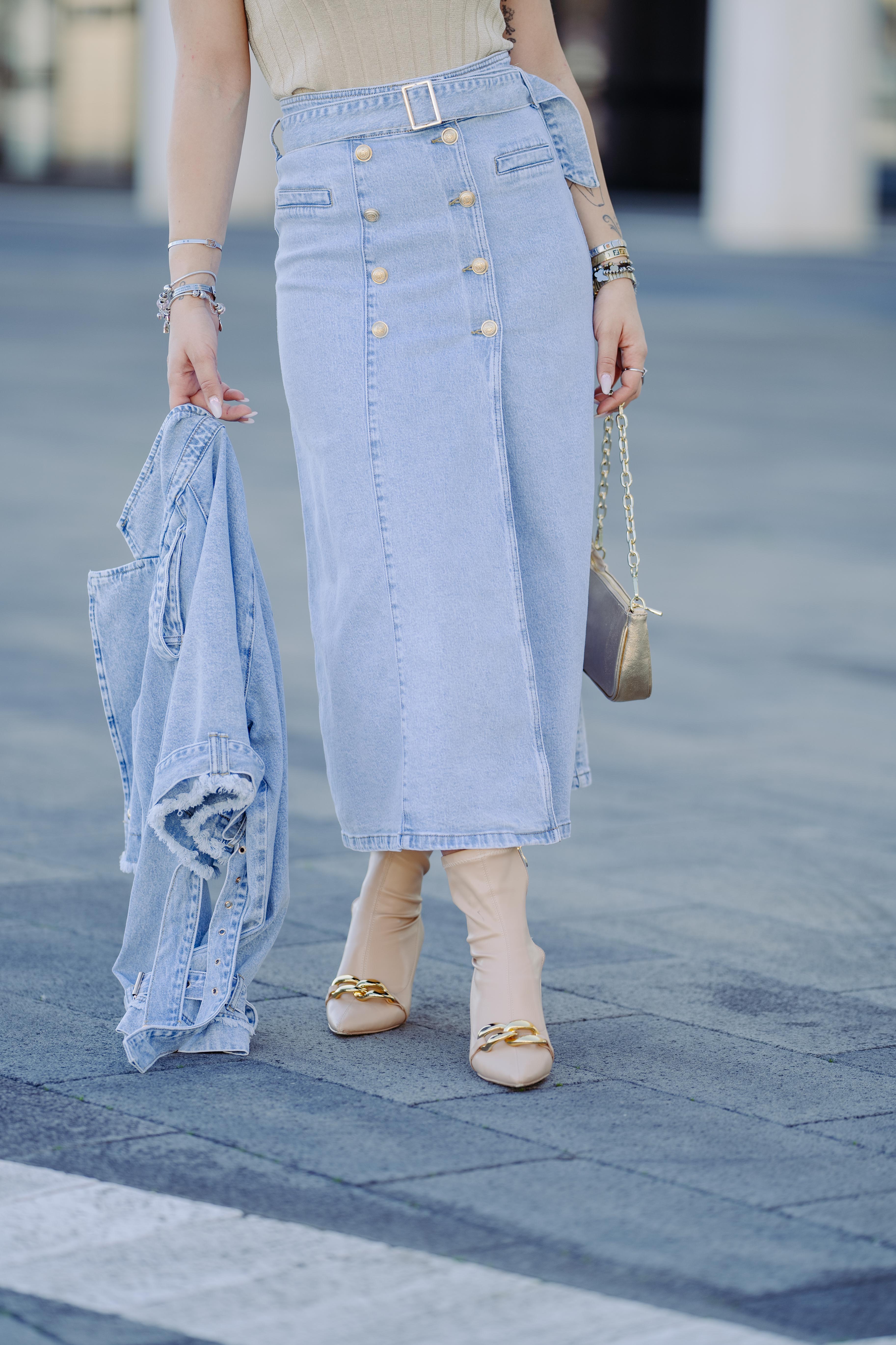 Gonna lunga di jeans con bottoni oro e cintura in vita