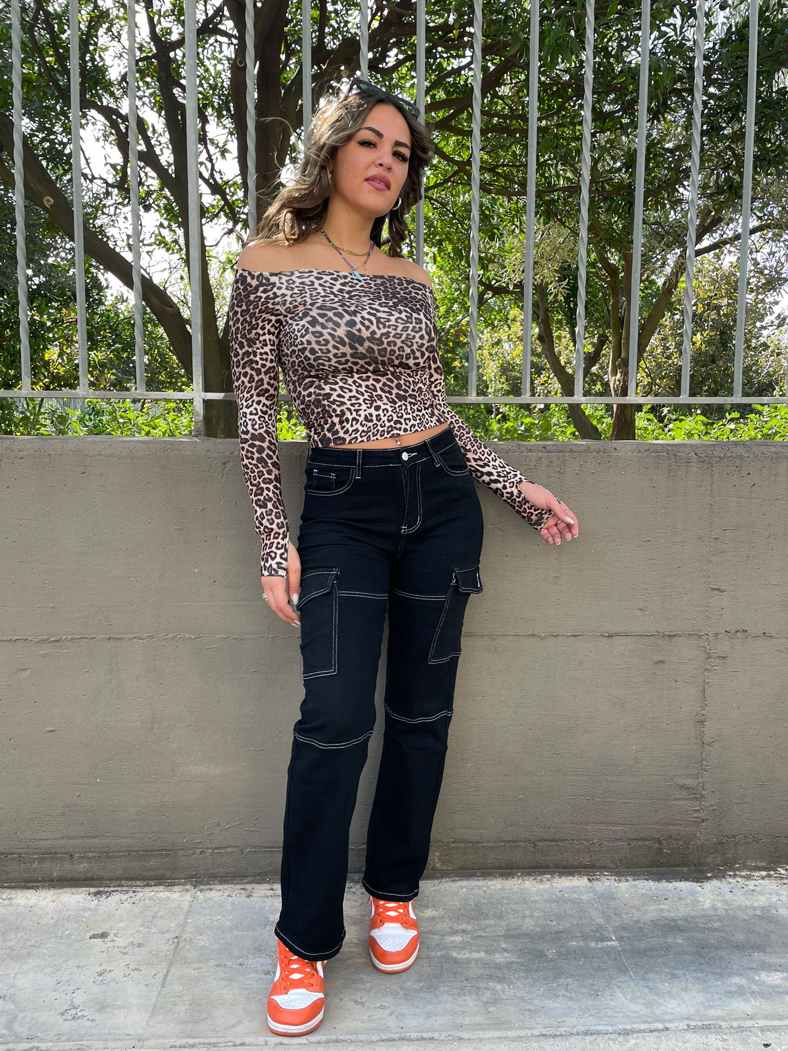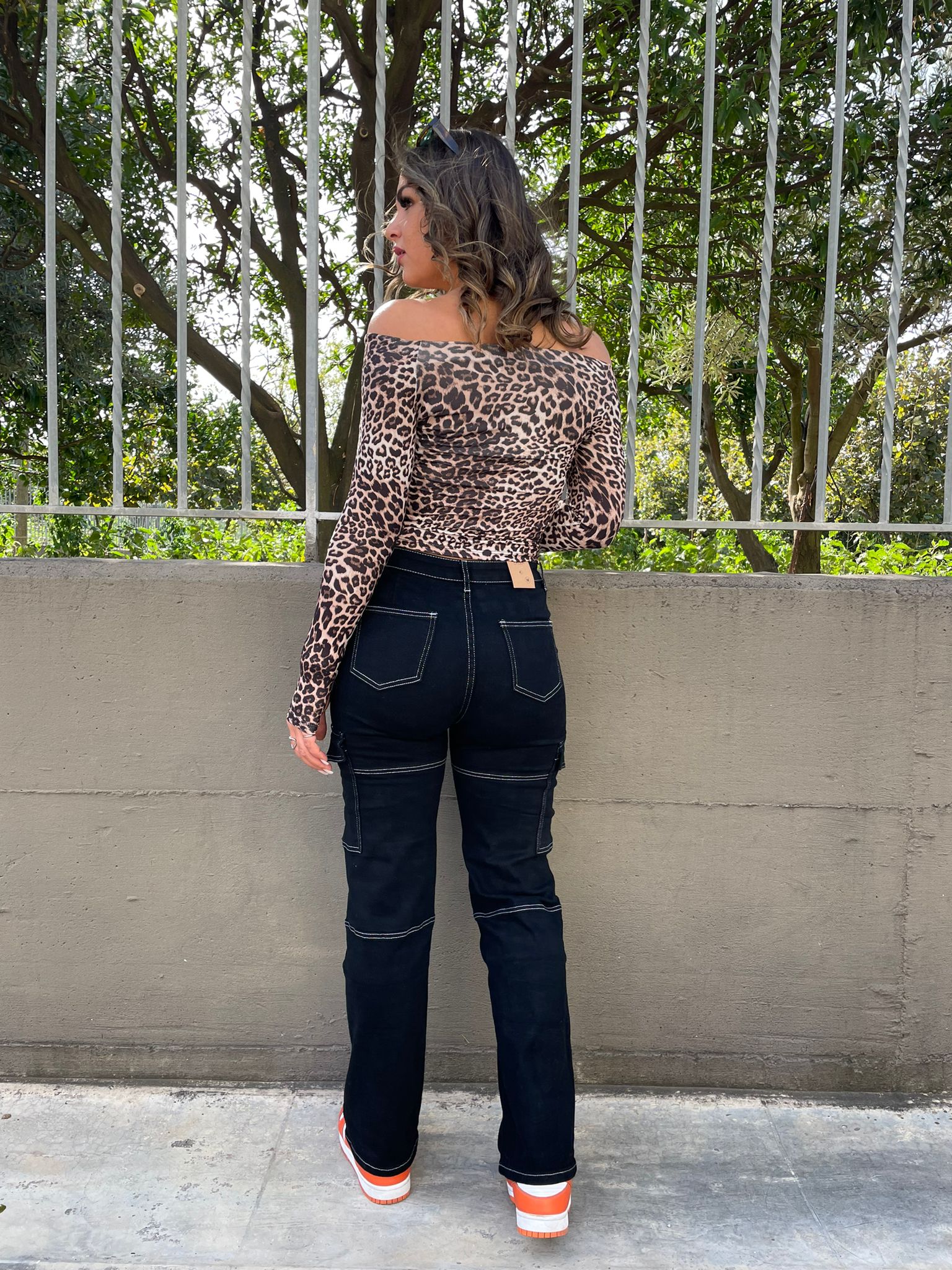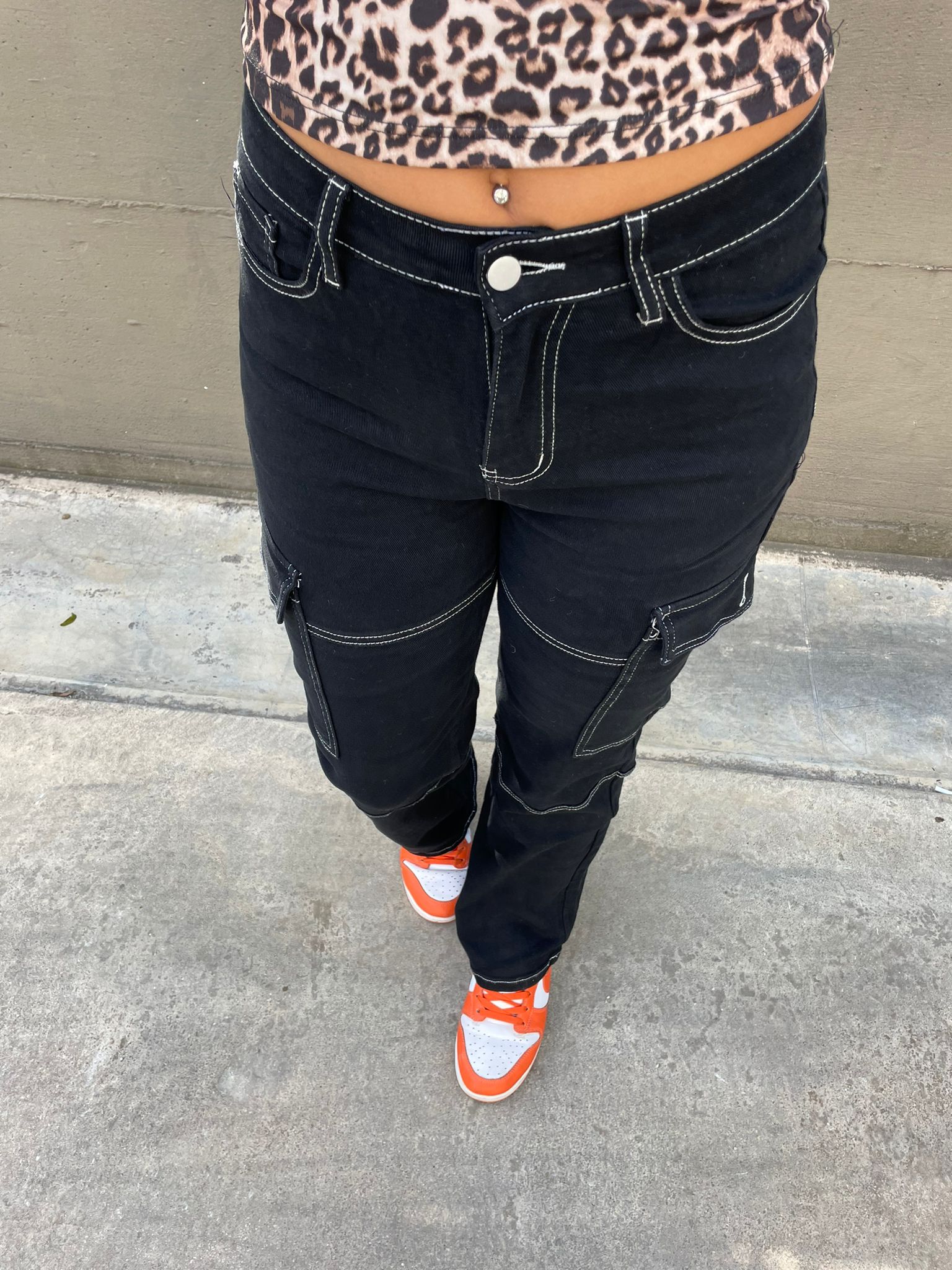 Jeans nero modello cargo con cuciture bianche