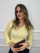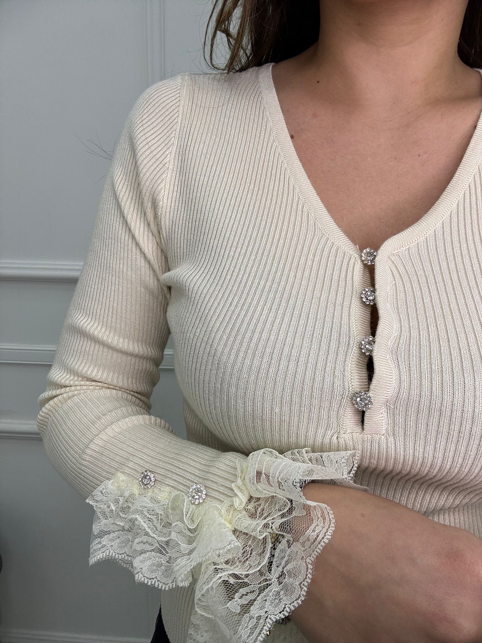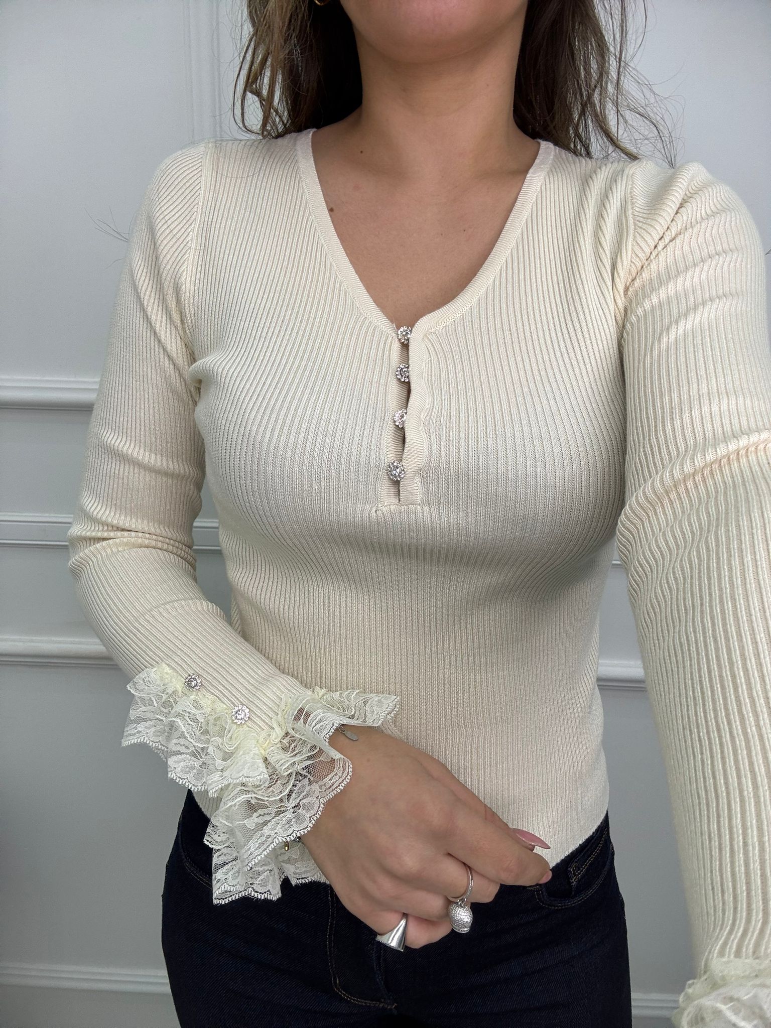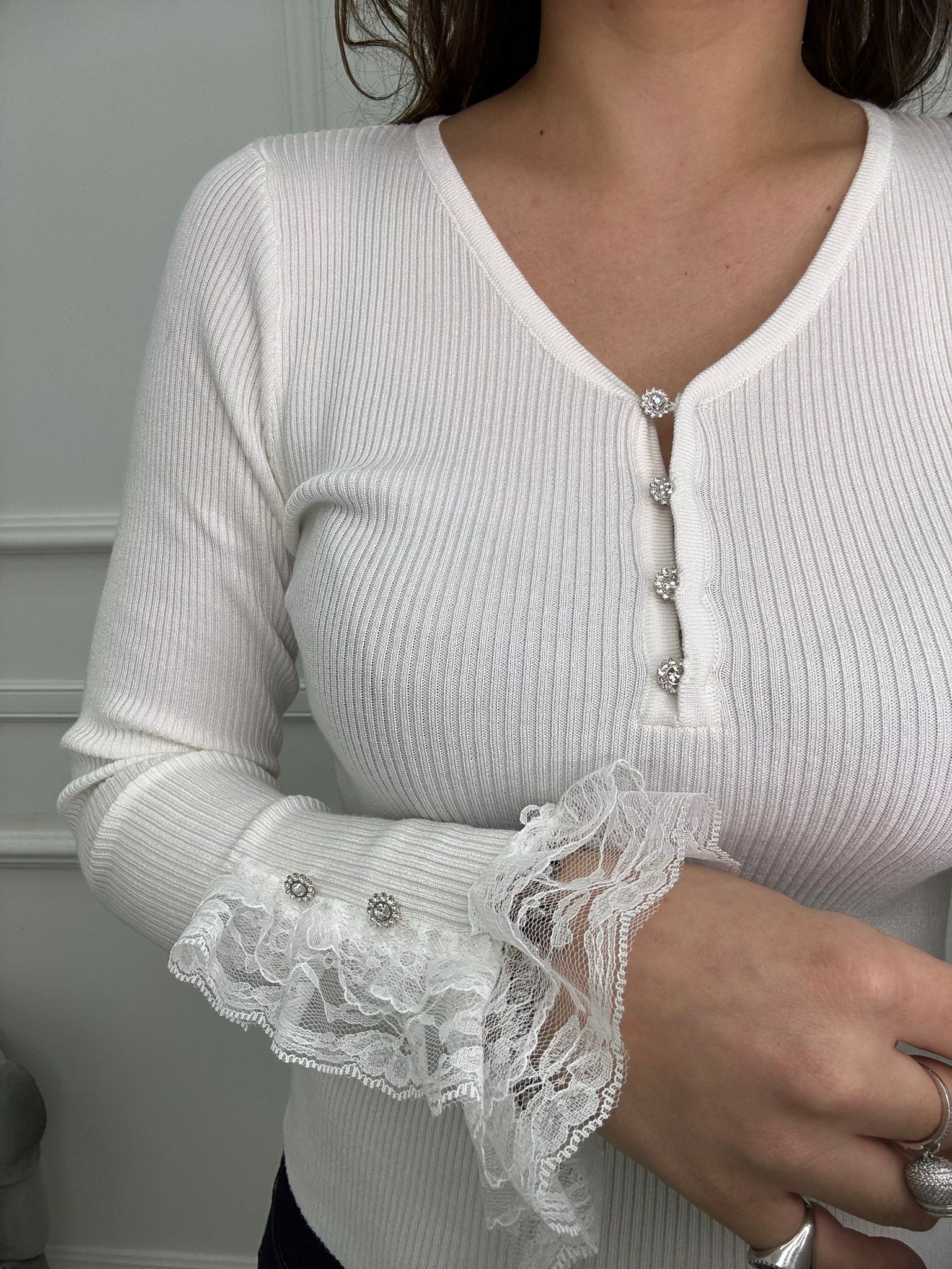 Maglia a costine con pizzo ai polsini