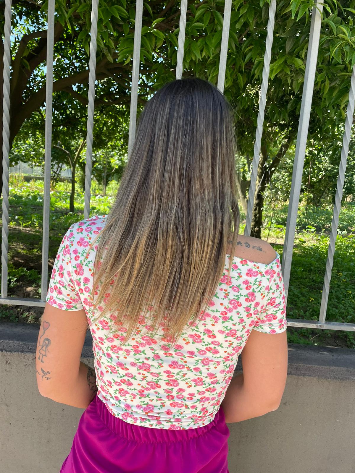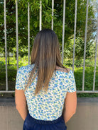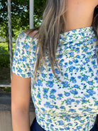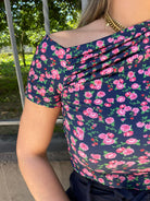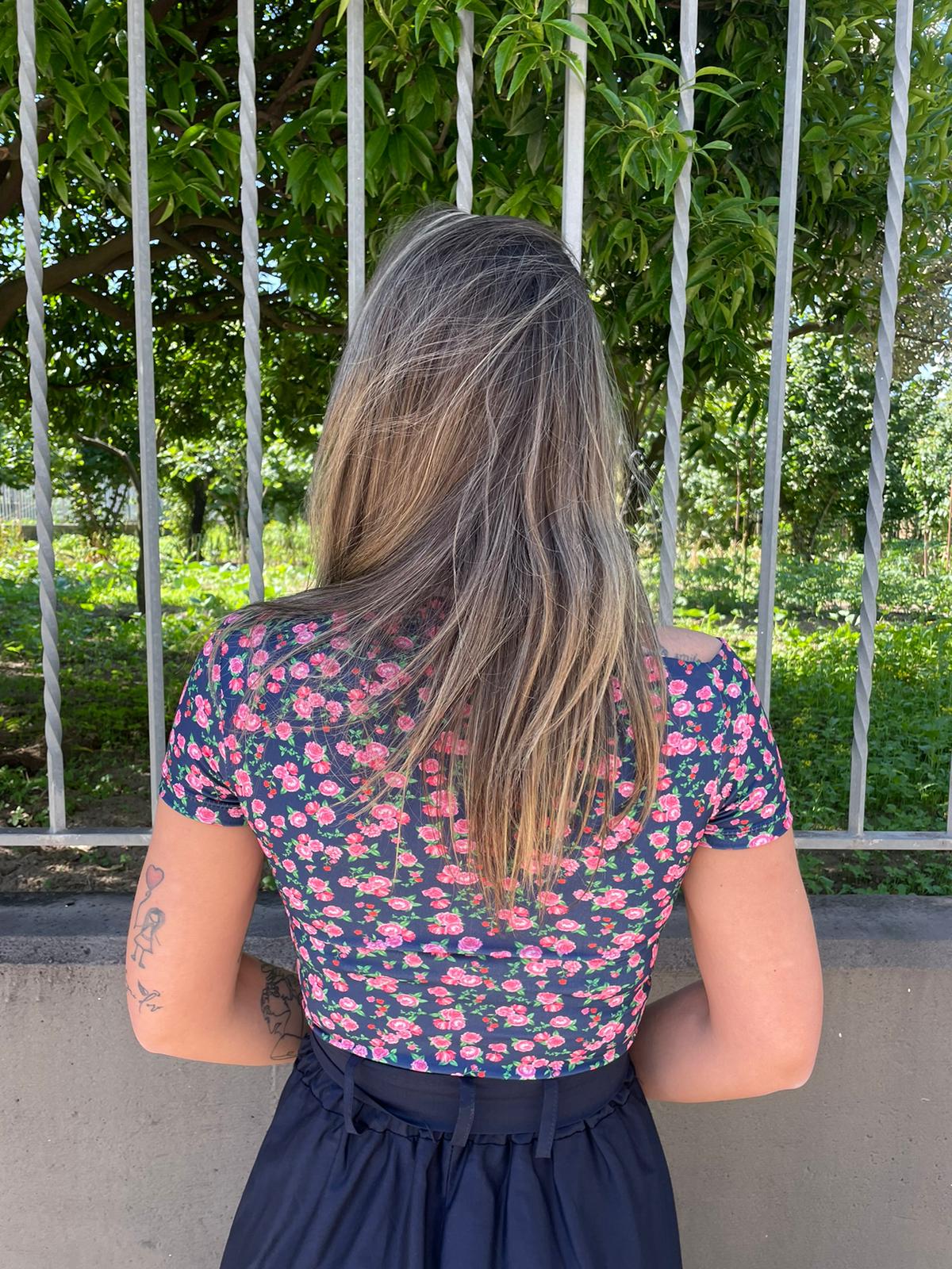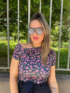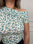 Maglia in lycra mezza manica a fiori con scollo asimmetrico
