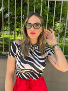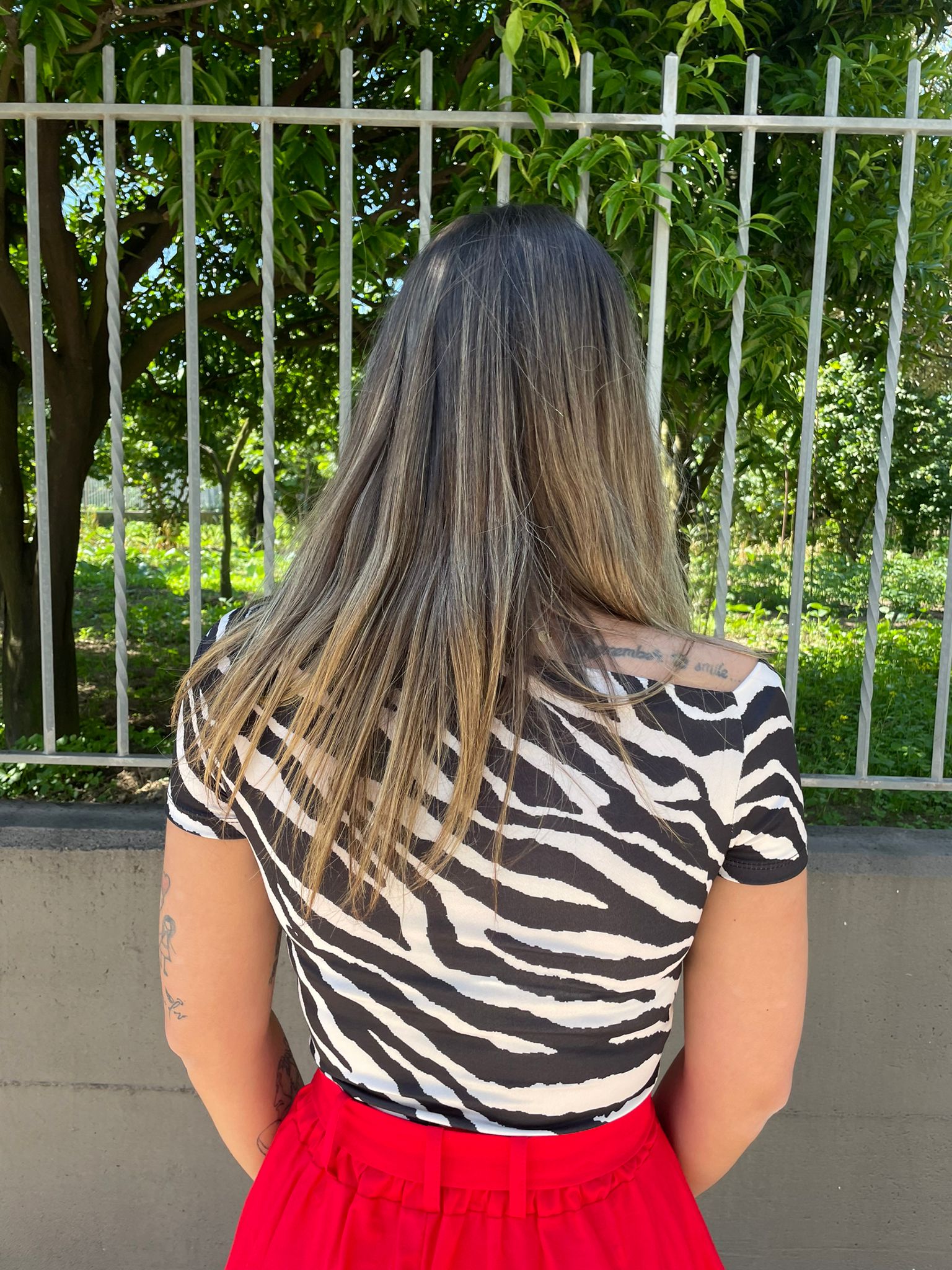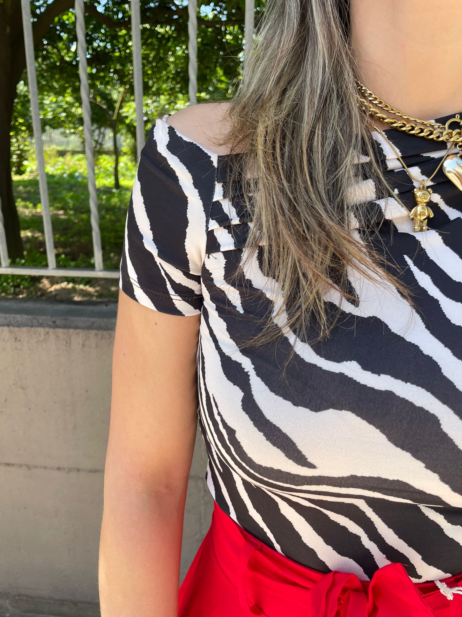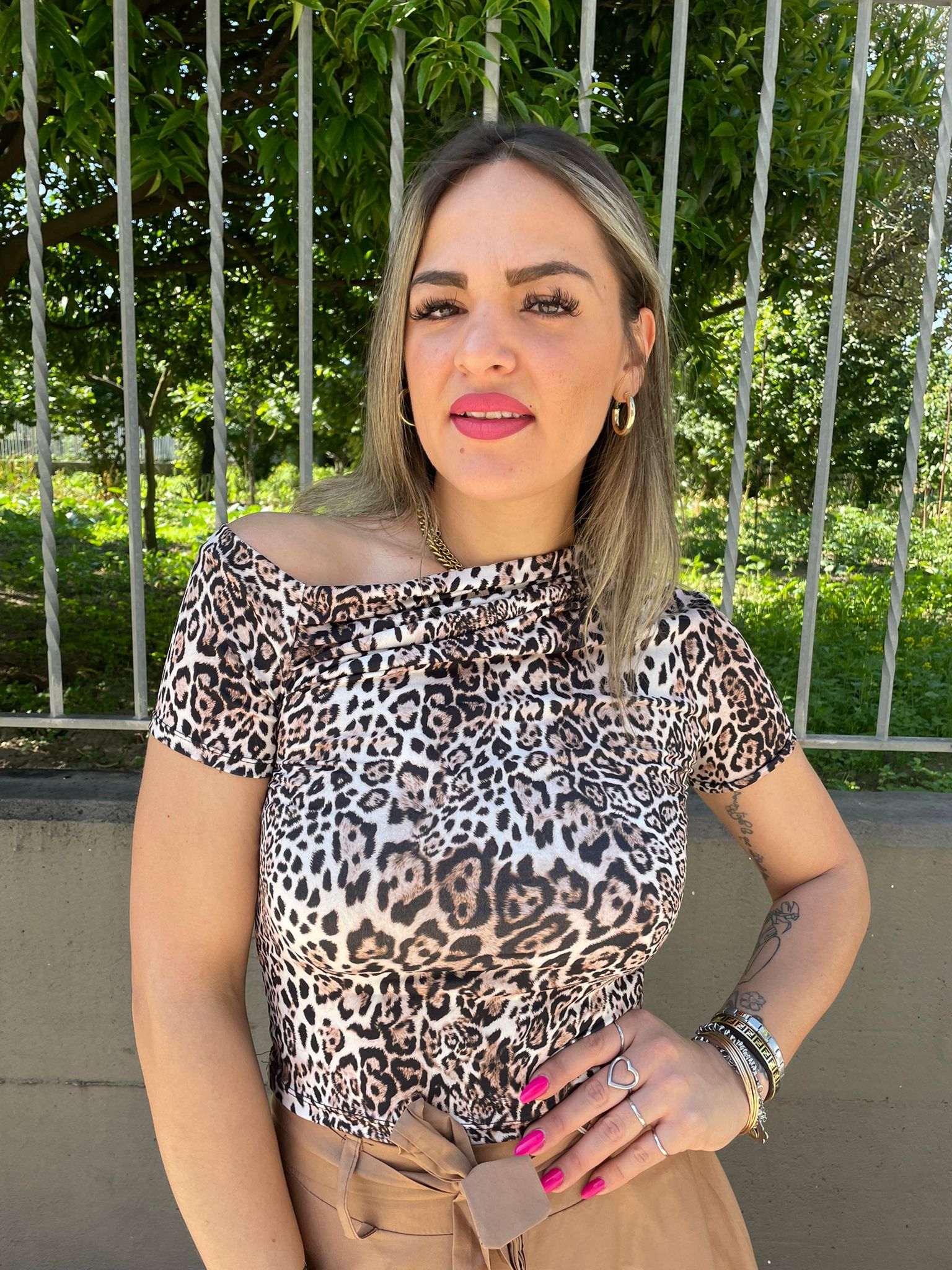 Maglia in lycra mezza manica animalier con scollo asimmetrico