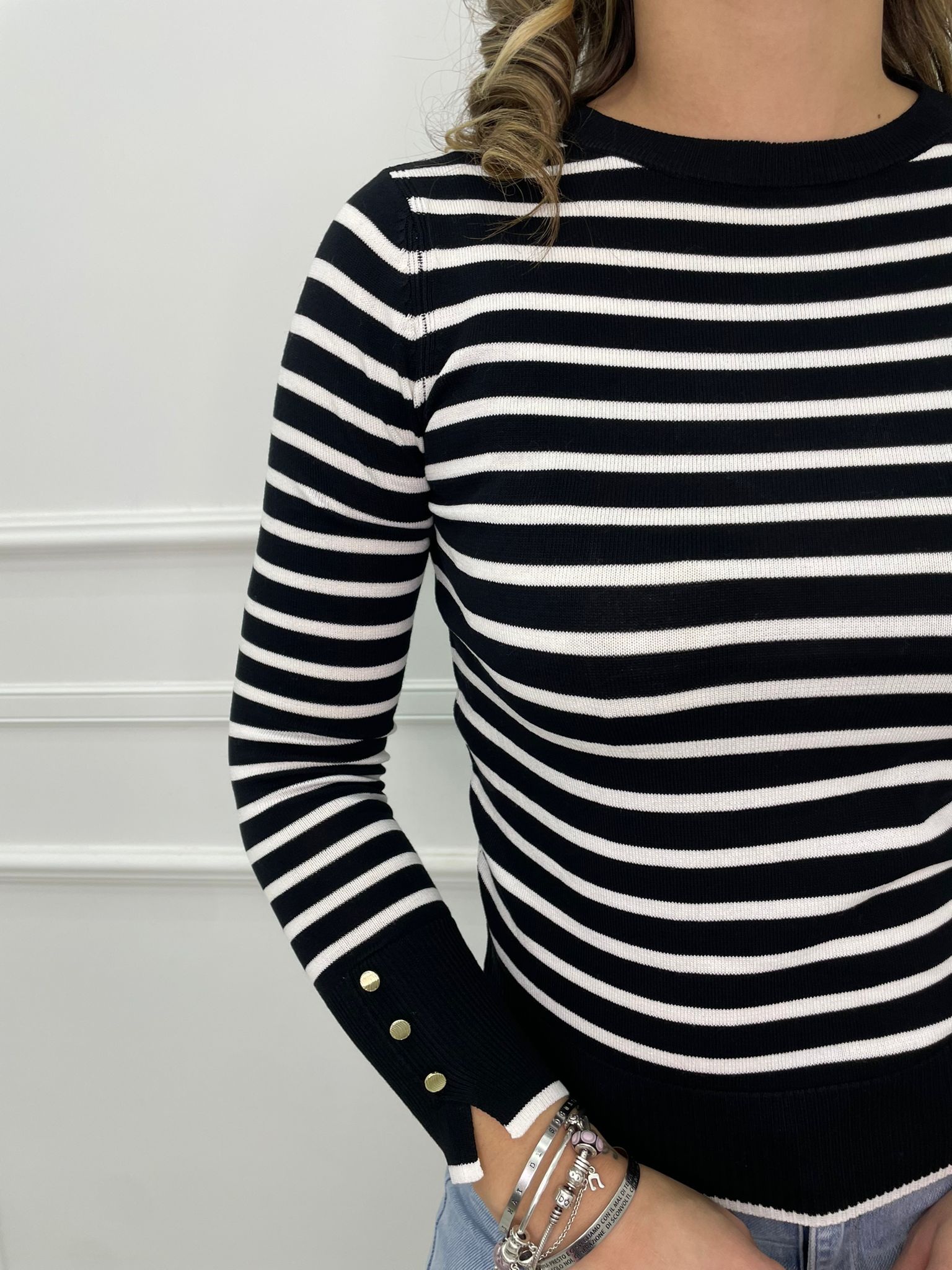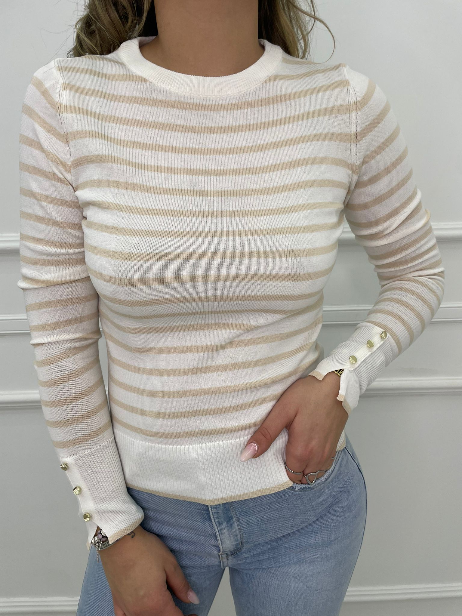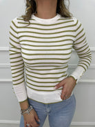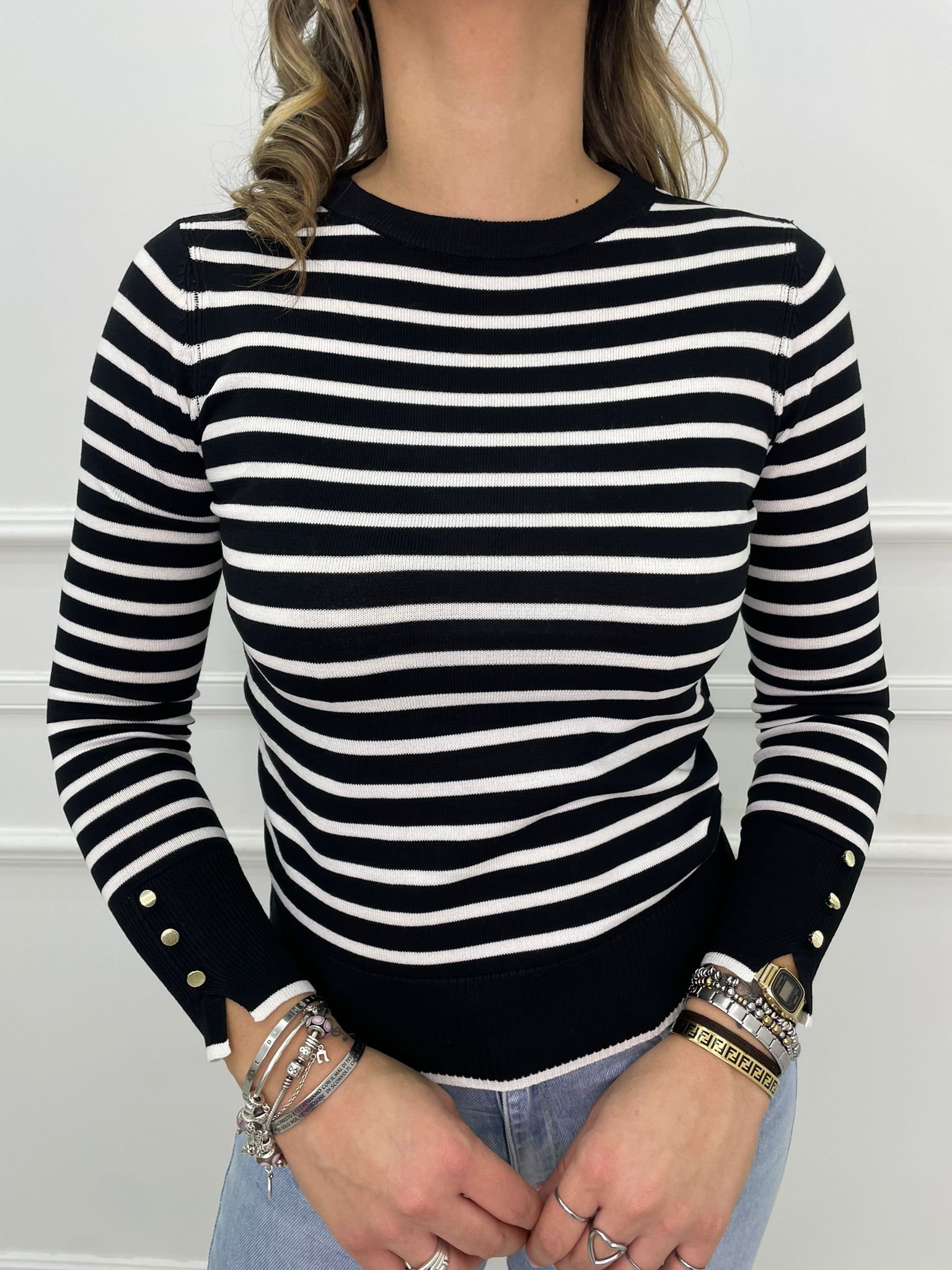 Maglioncino in filo a righe con finti bottoni alle maniche
