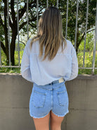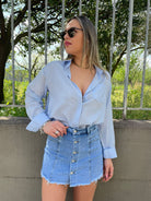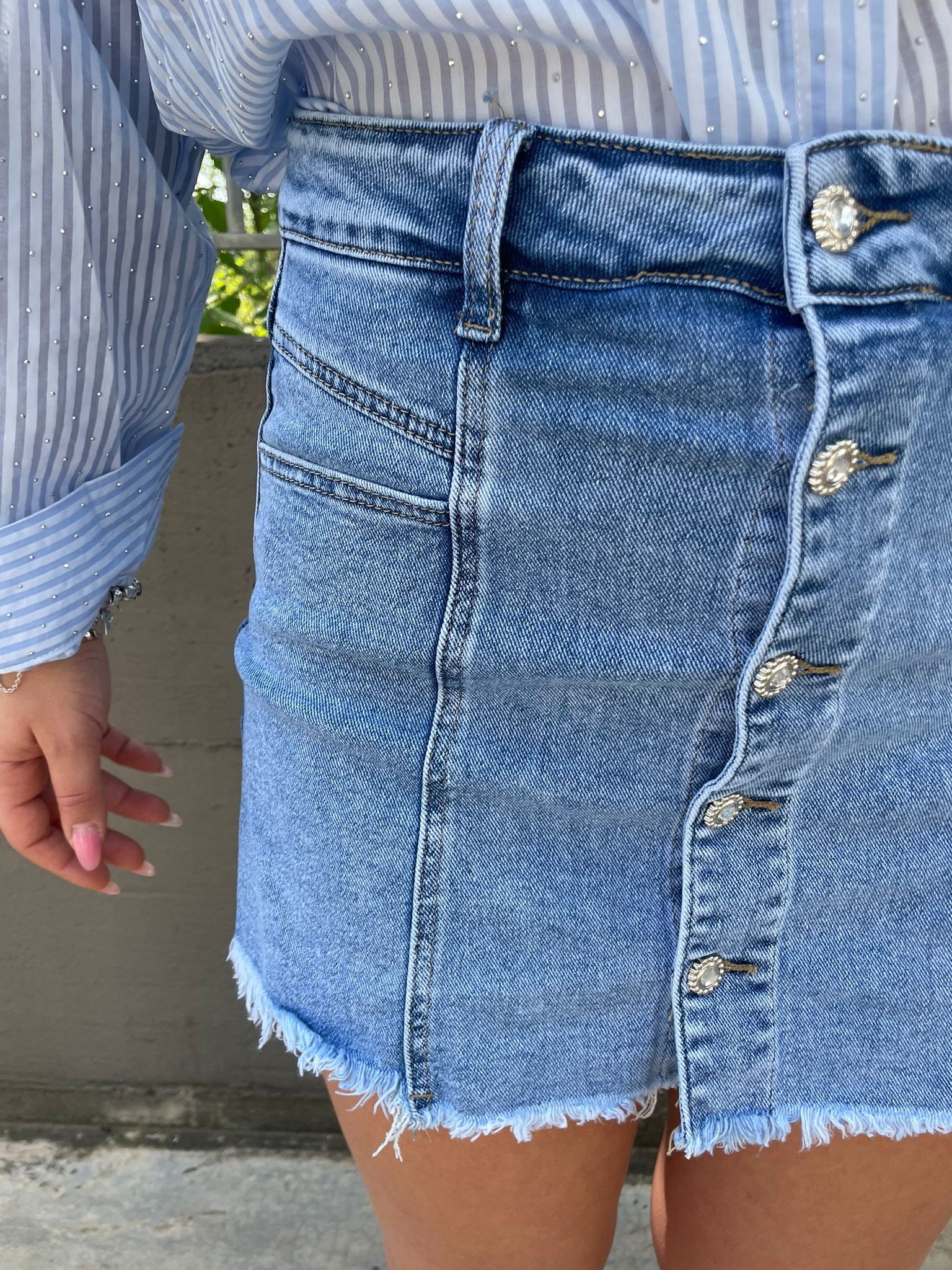 Mini gonna a pantaloncino di jeans con bottoni swarovski